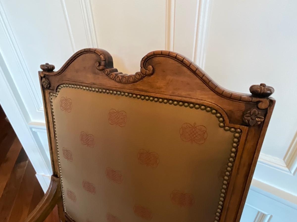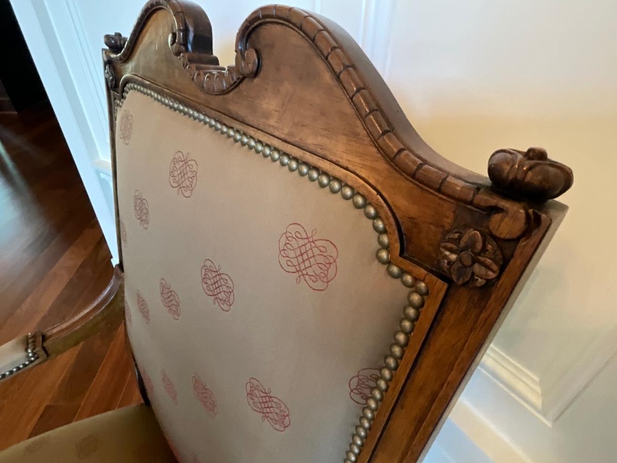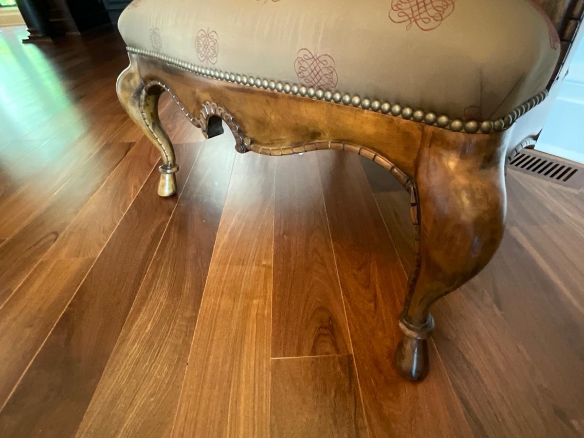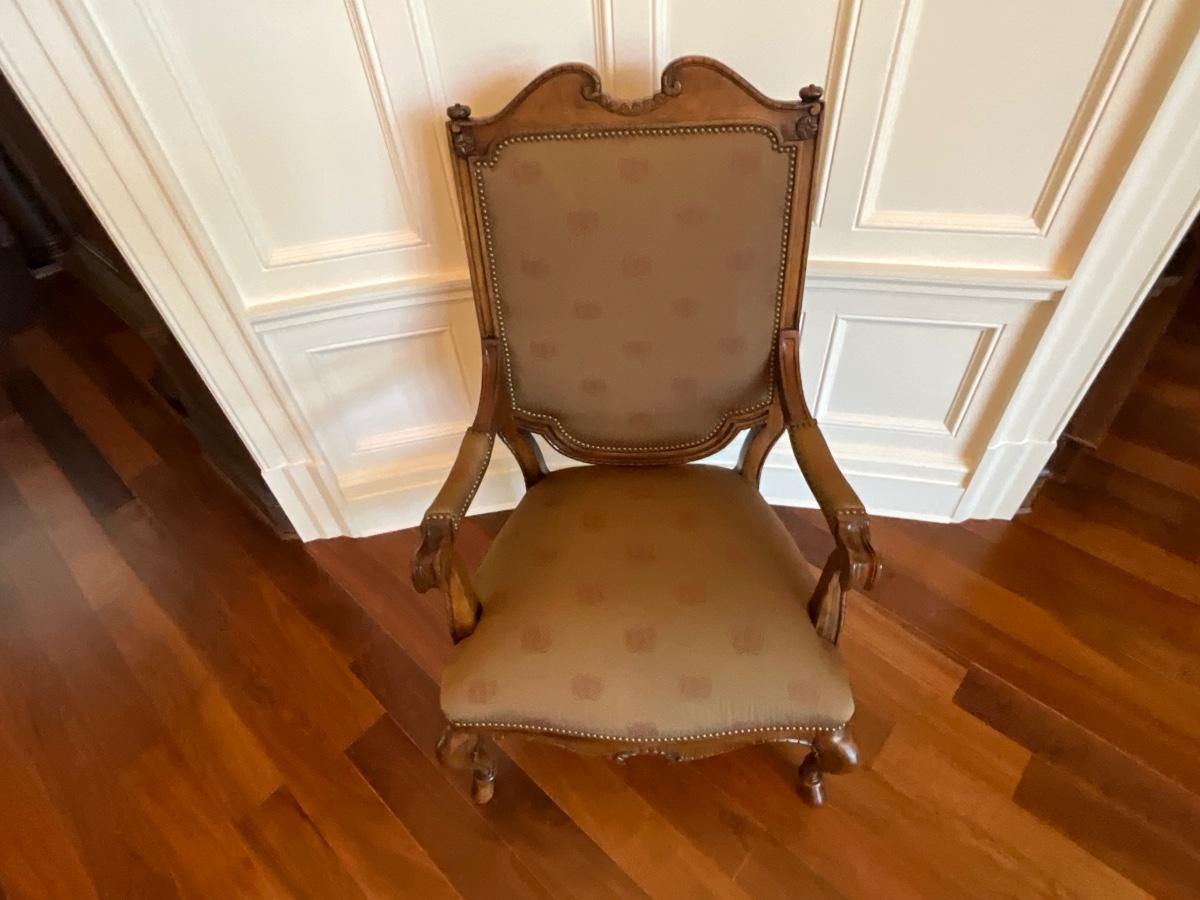 Century Silk upholstered and Wood armchair. 31 inches wide 26 inches deep and 48 inches tall. Seat width is 25 inches, seat depth is 22 inches and it’s 20 inches from the floor to the seat