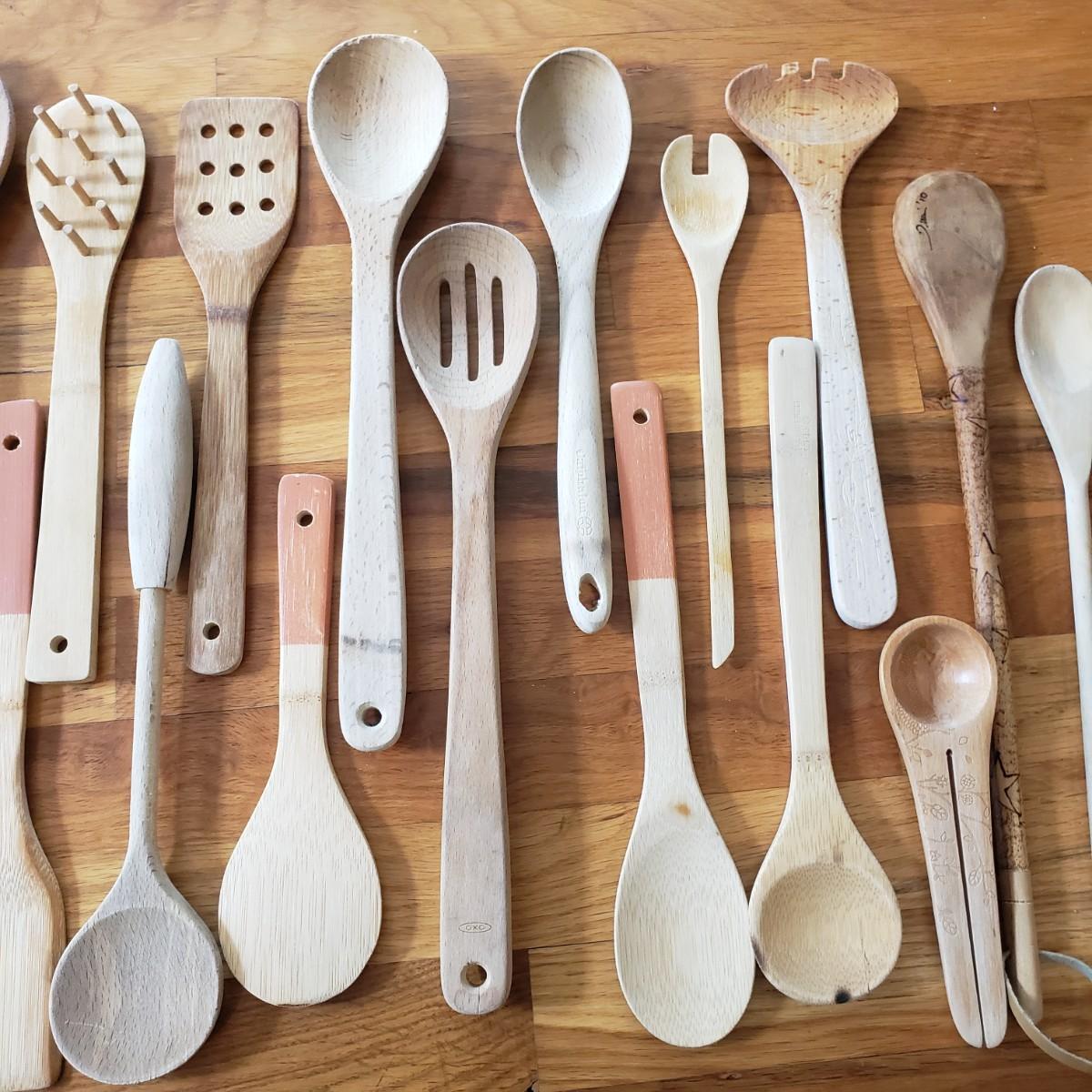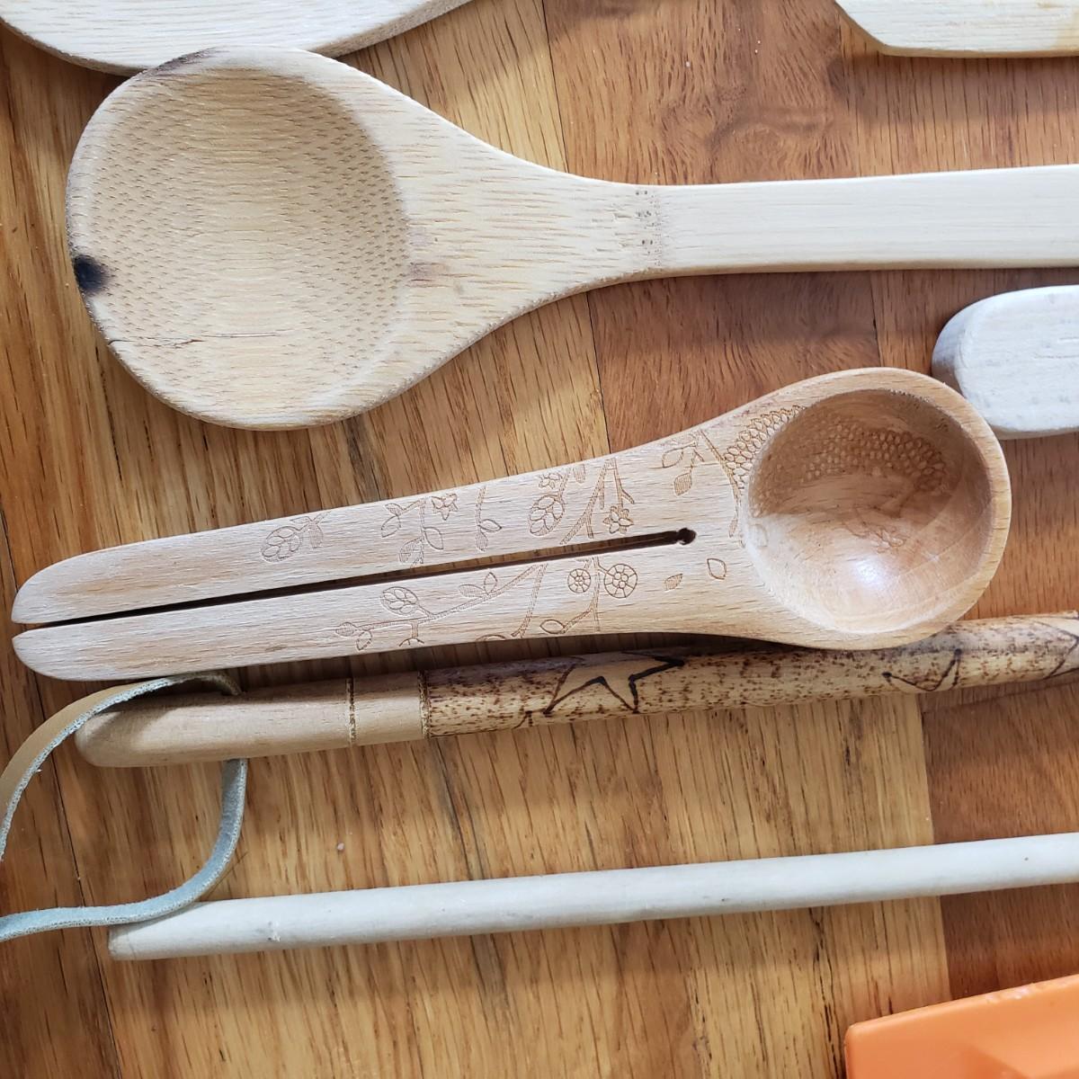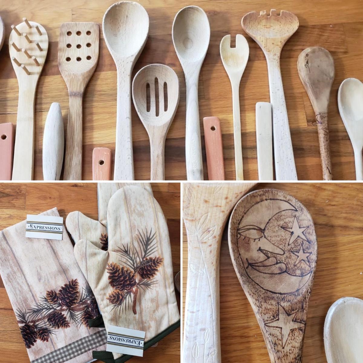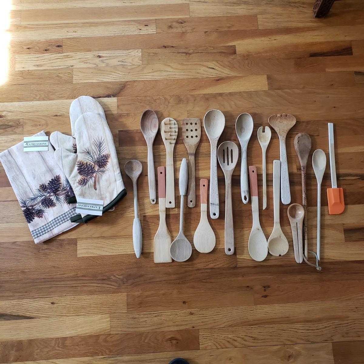 This is an 18-piece wooden spoon and NIB towel and oven mitts. There are some unique spoons, like the wood-burned star and moons and the Talisman Designs spoons, as well as one rubber spatula.