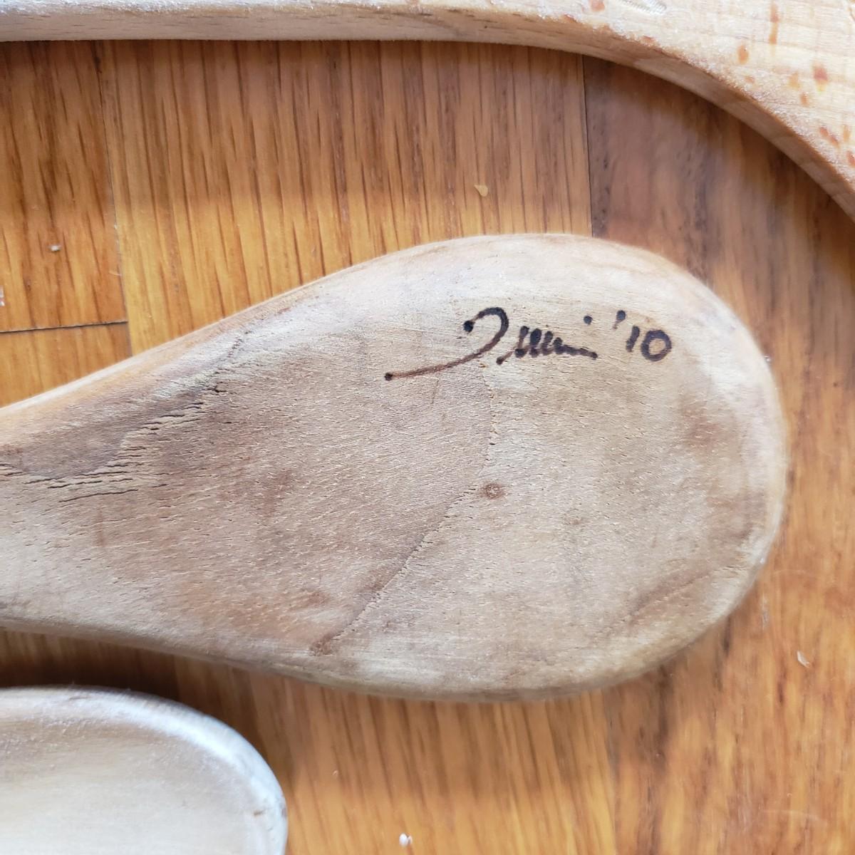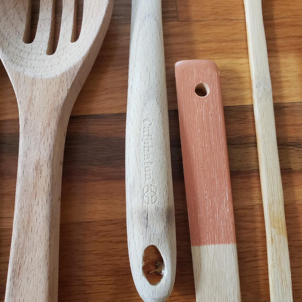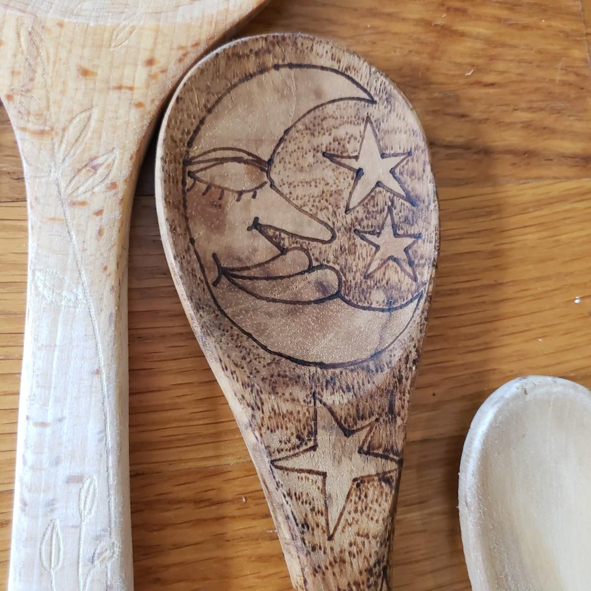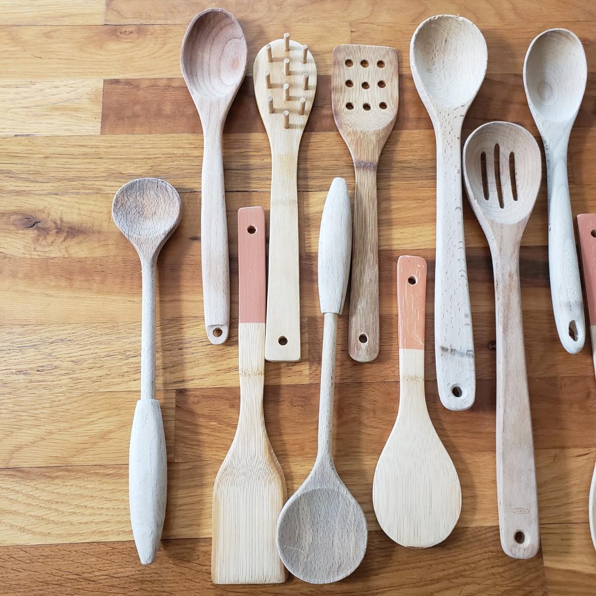 This is an 18-piece wooden spoon and NIB towel and oven mitts. There are some unique spoons, like the wood-burned star and moons and the Talisman Designs spoons, as well as one rubber spatula.
