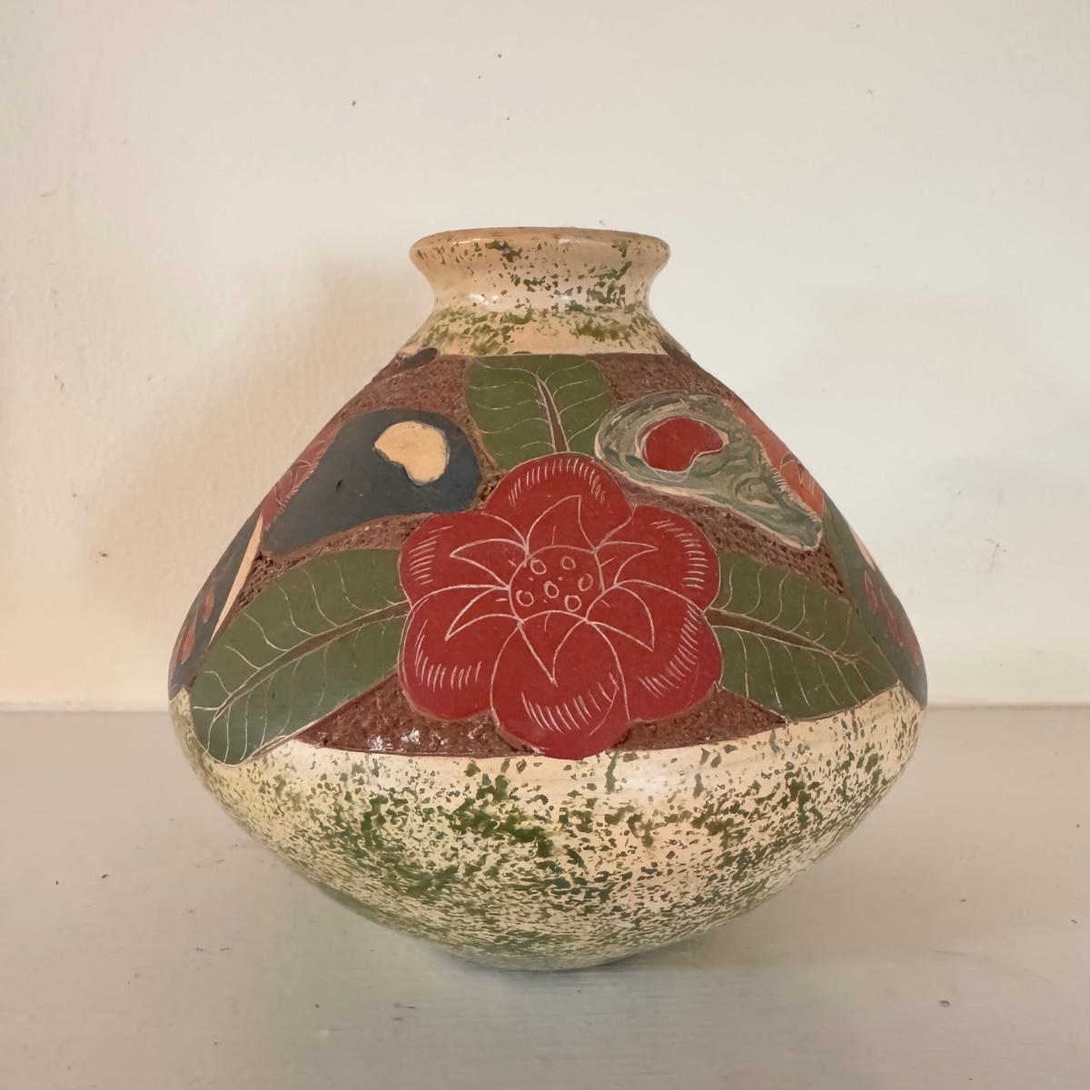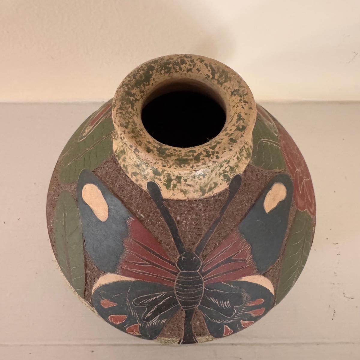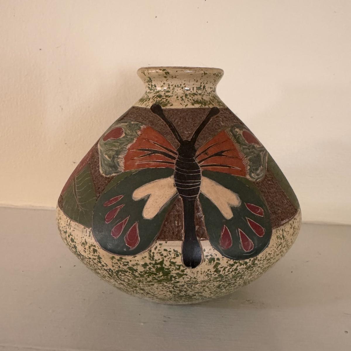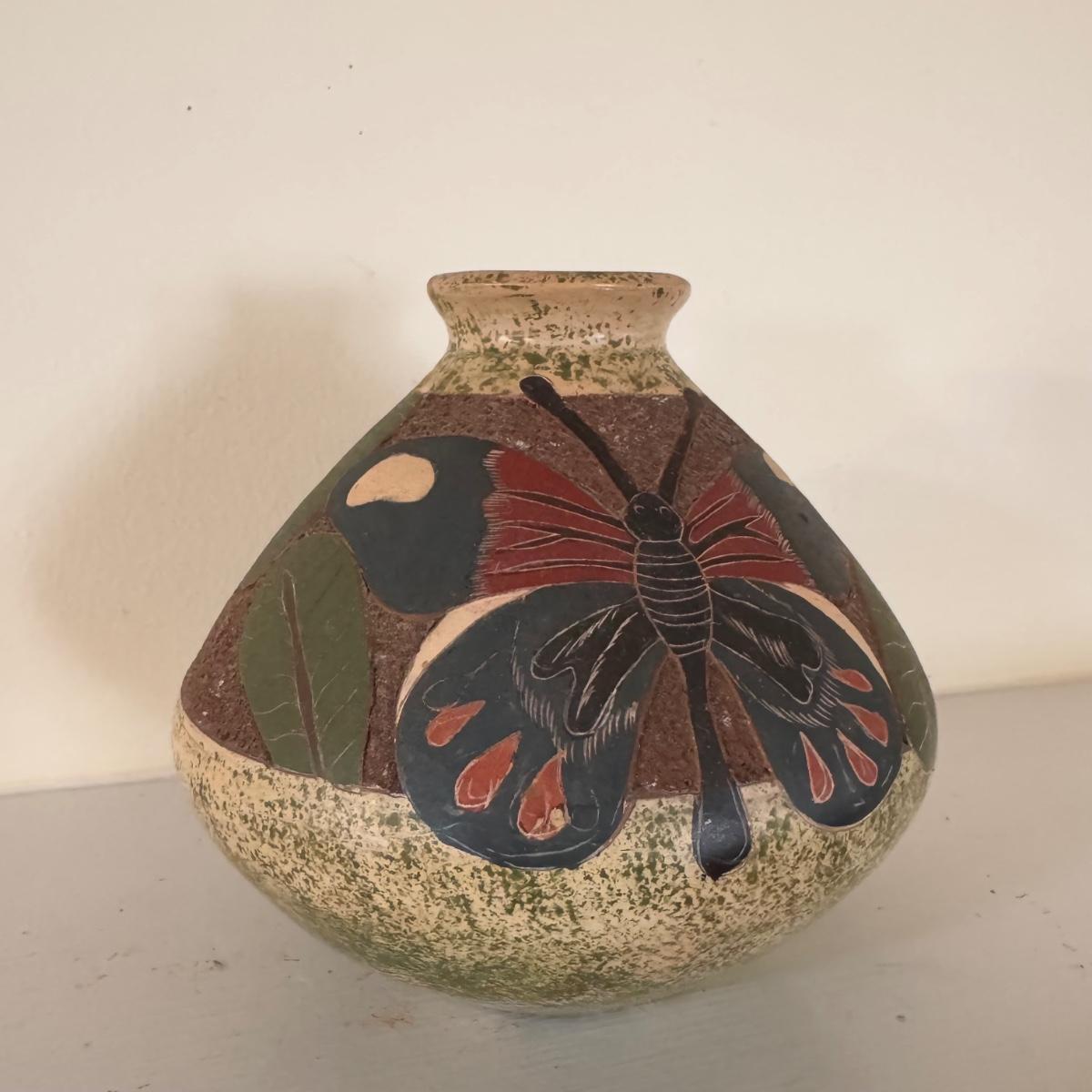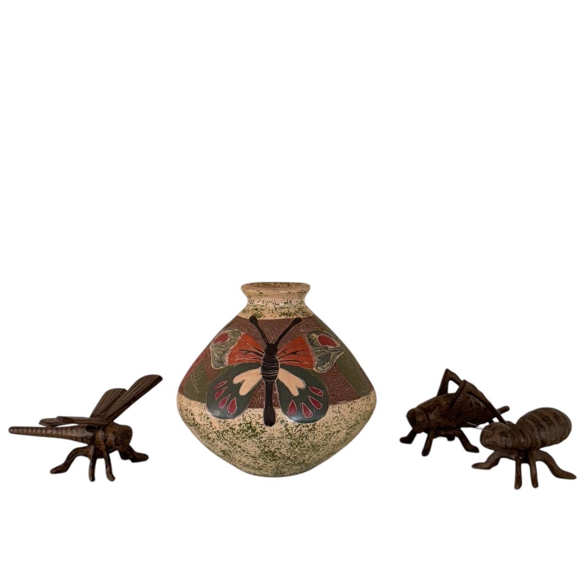 Lot includes one ceramic vase with butterflies & flowers plus three cast iron bugs. The vase measures 6”D x 5.5”H and is engraved with “Pura Vida” on the bottom. Shipping available.