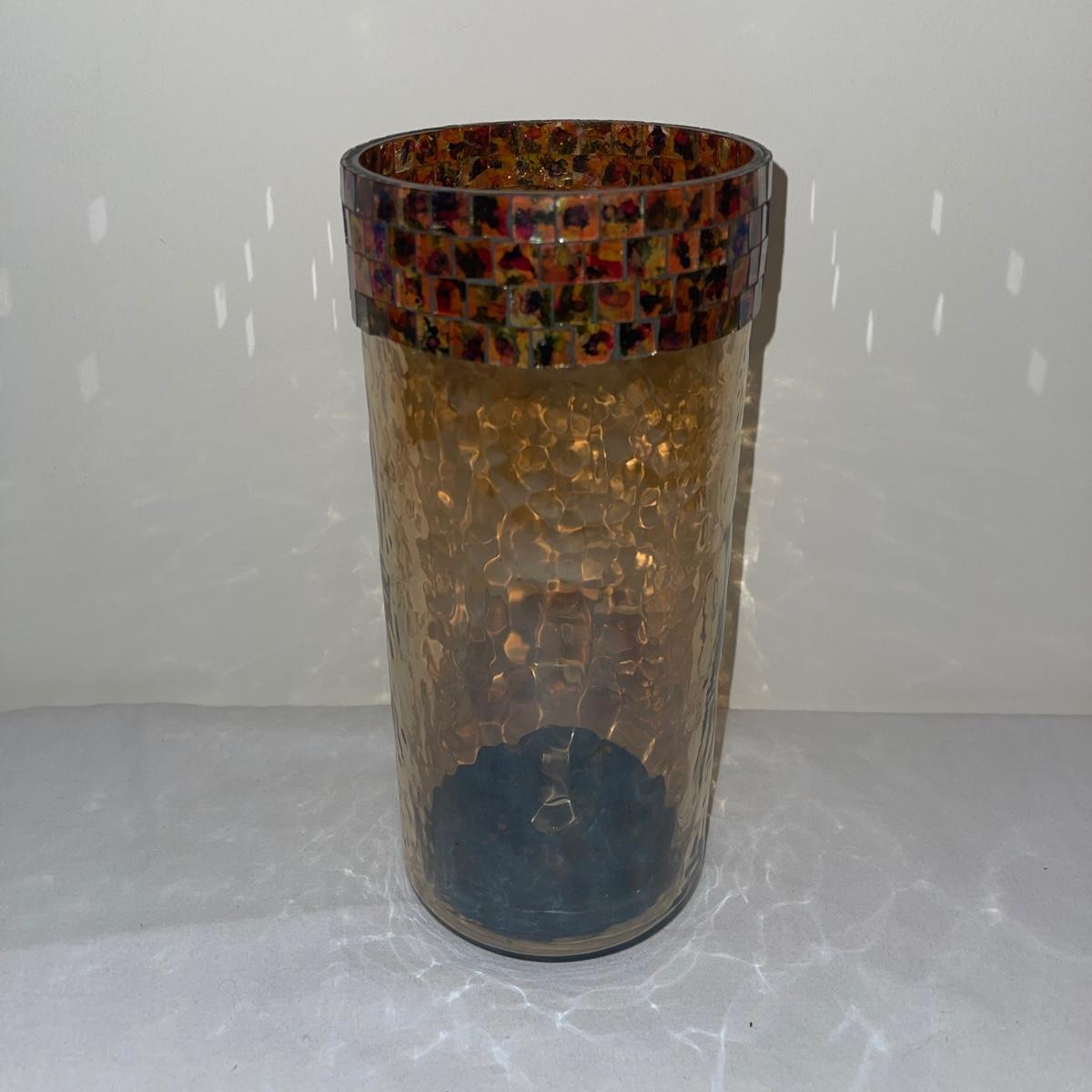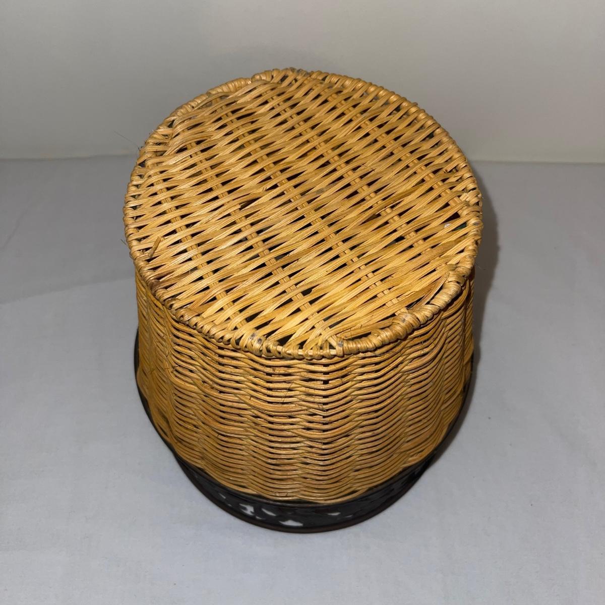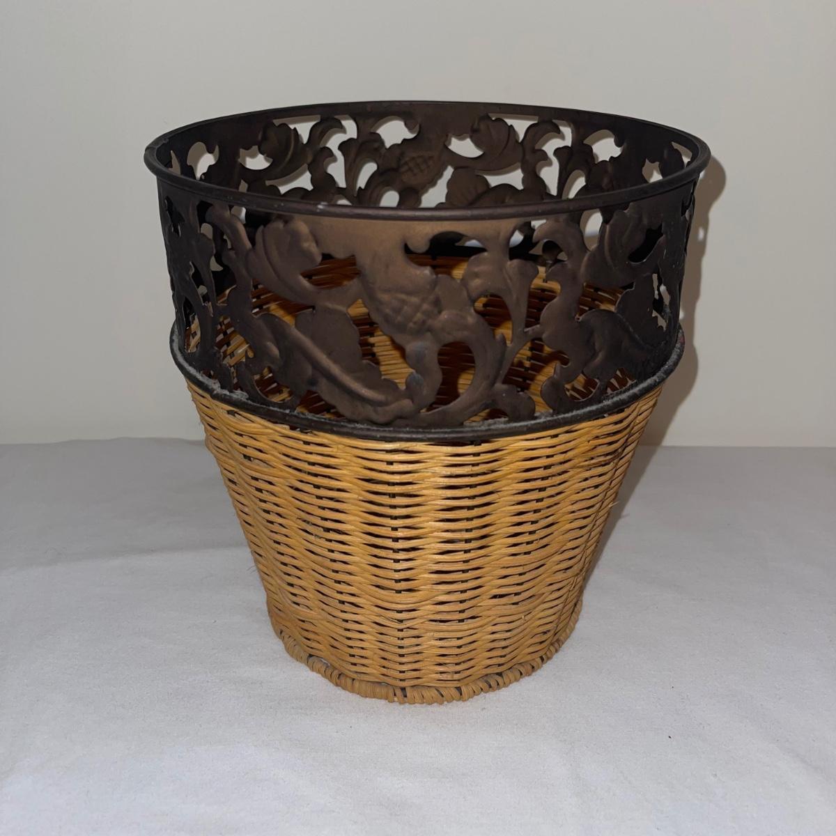 Three items in this lot include a wicker and metal-rimmed wastebasket, a cylindrical glass candle holder, and a ceramic candle holder with a candle attached. The glass candle holder is 10.25” tall.