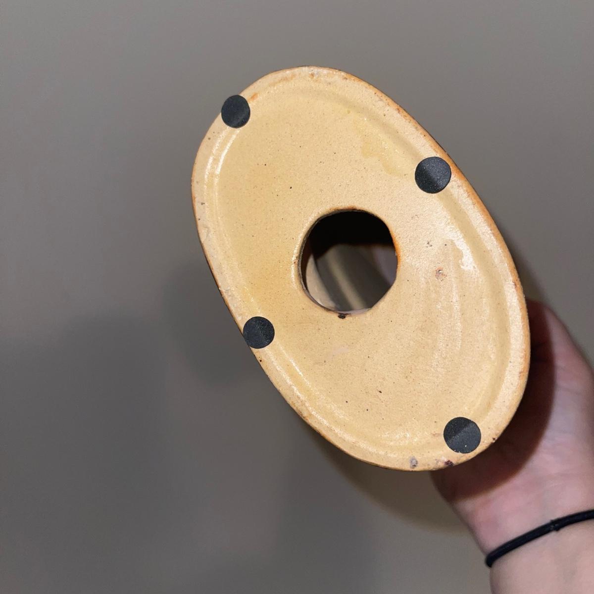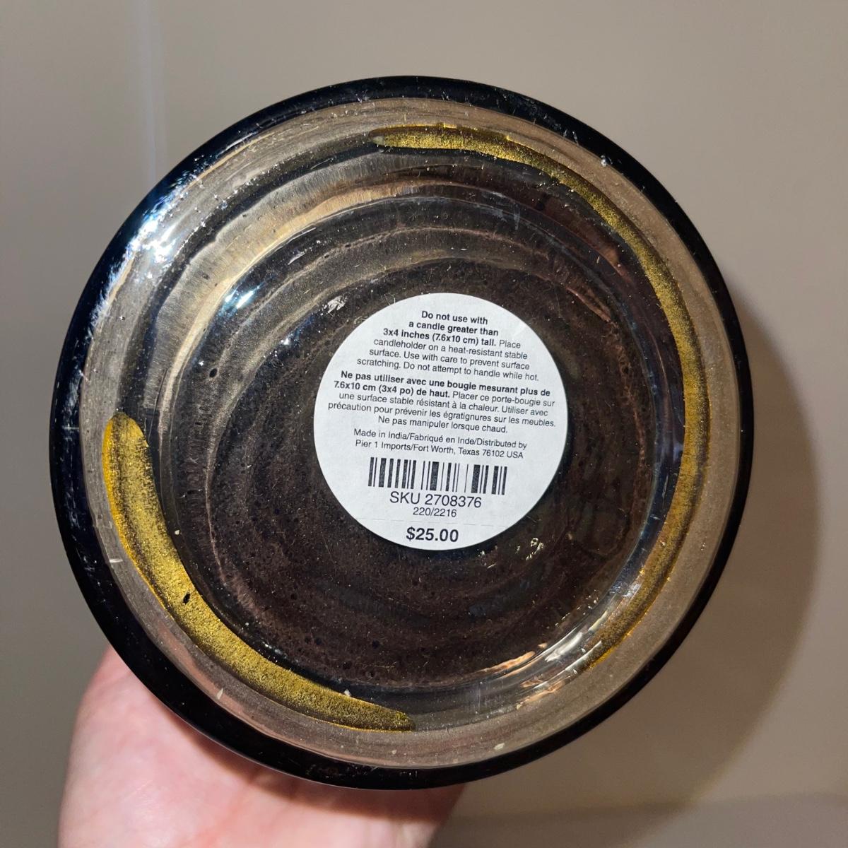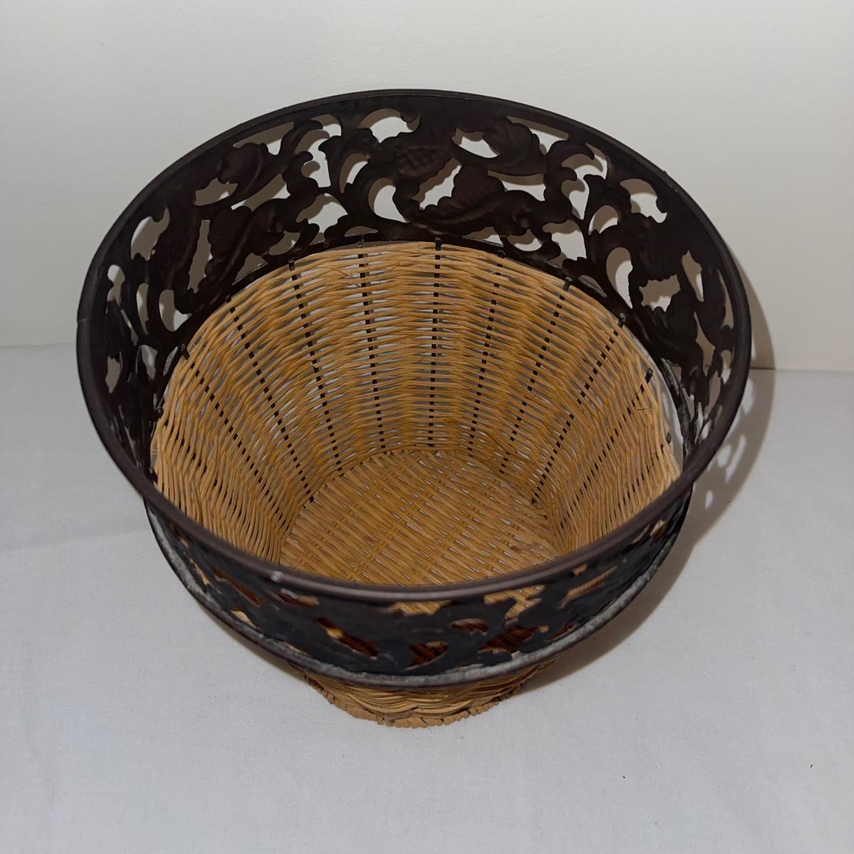 Three items in this lot include a wicker and metal-rimmed wastebasket, a cylindrical glass candle holder, and a ceramic candle holder with a candle attached. The glass candle holder is 10.25” tall.