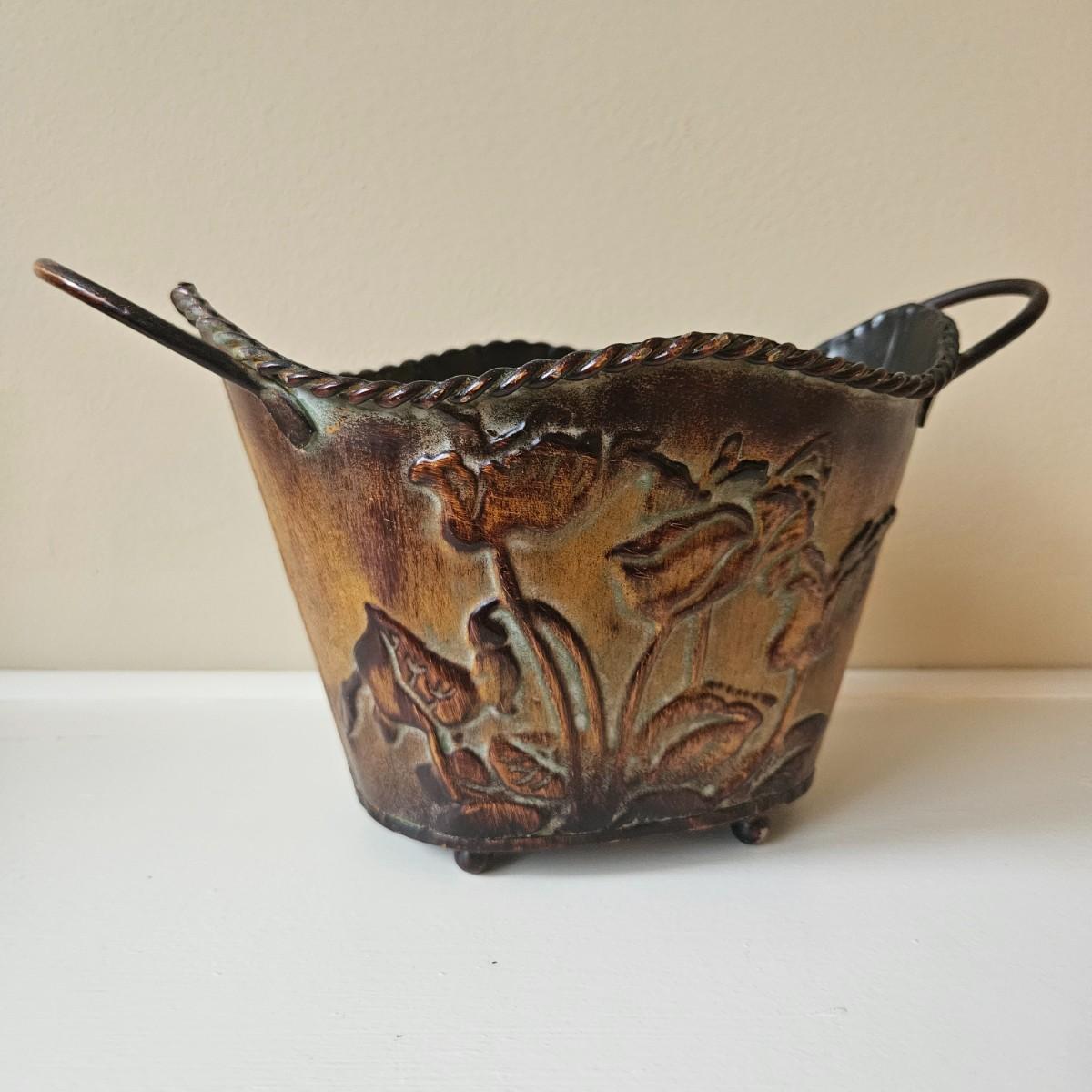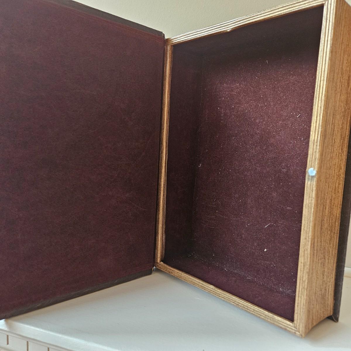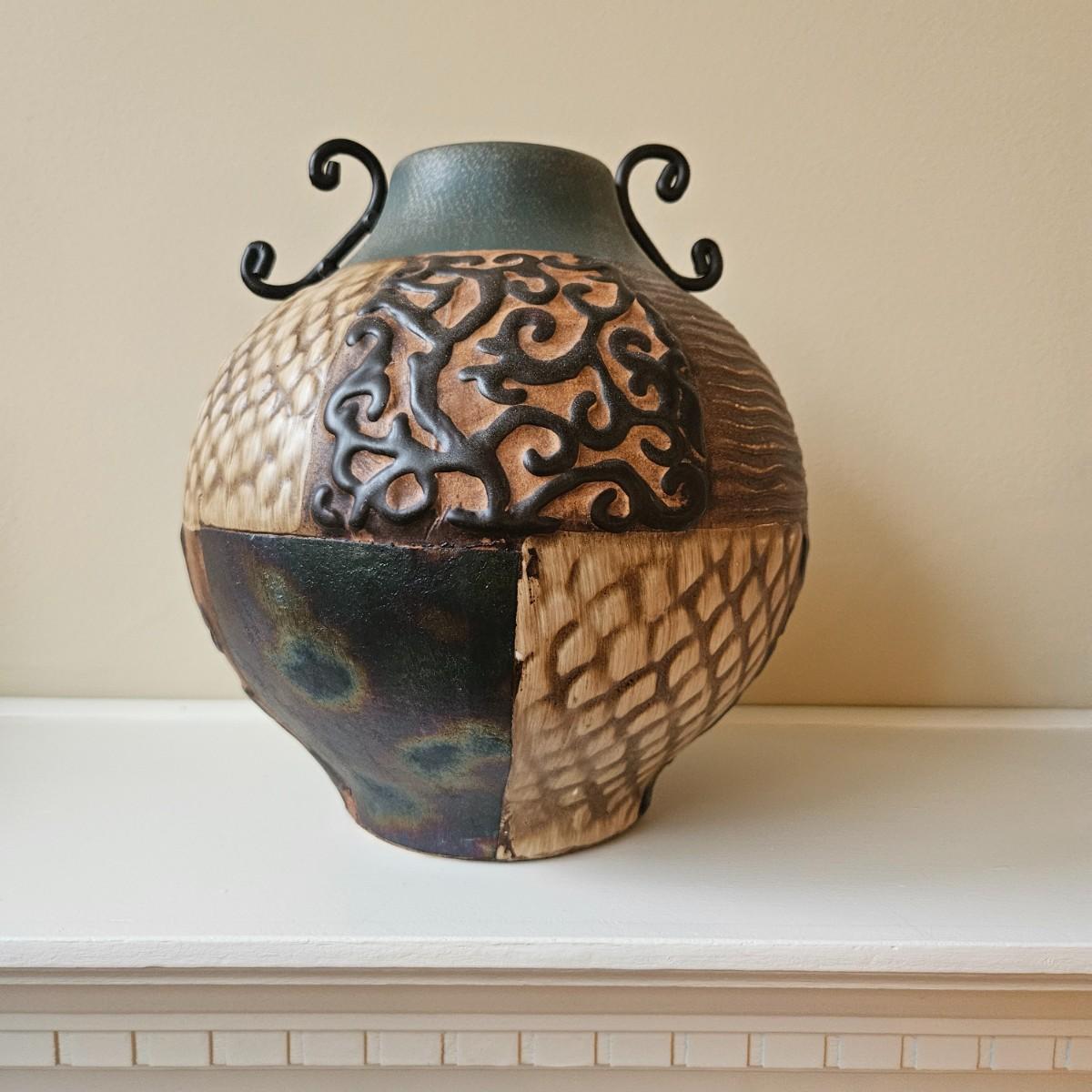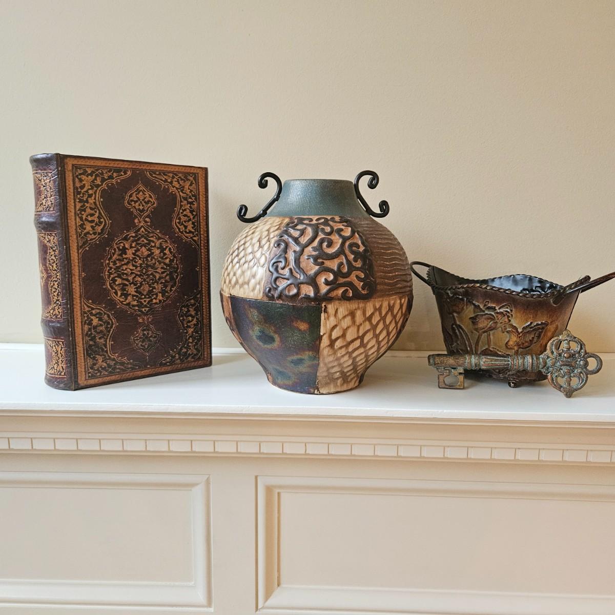 Am assortment of four pieces of home decor items. Included is a box that looks like a leather-bound book made of wood, a ceramic vase with metal handles that measures approximately 9"D x 10.5"H, a metal key and a metal basket with a floral design. Shipping available