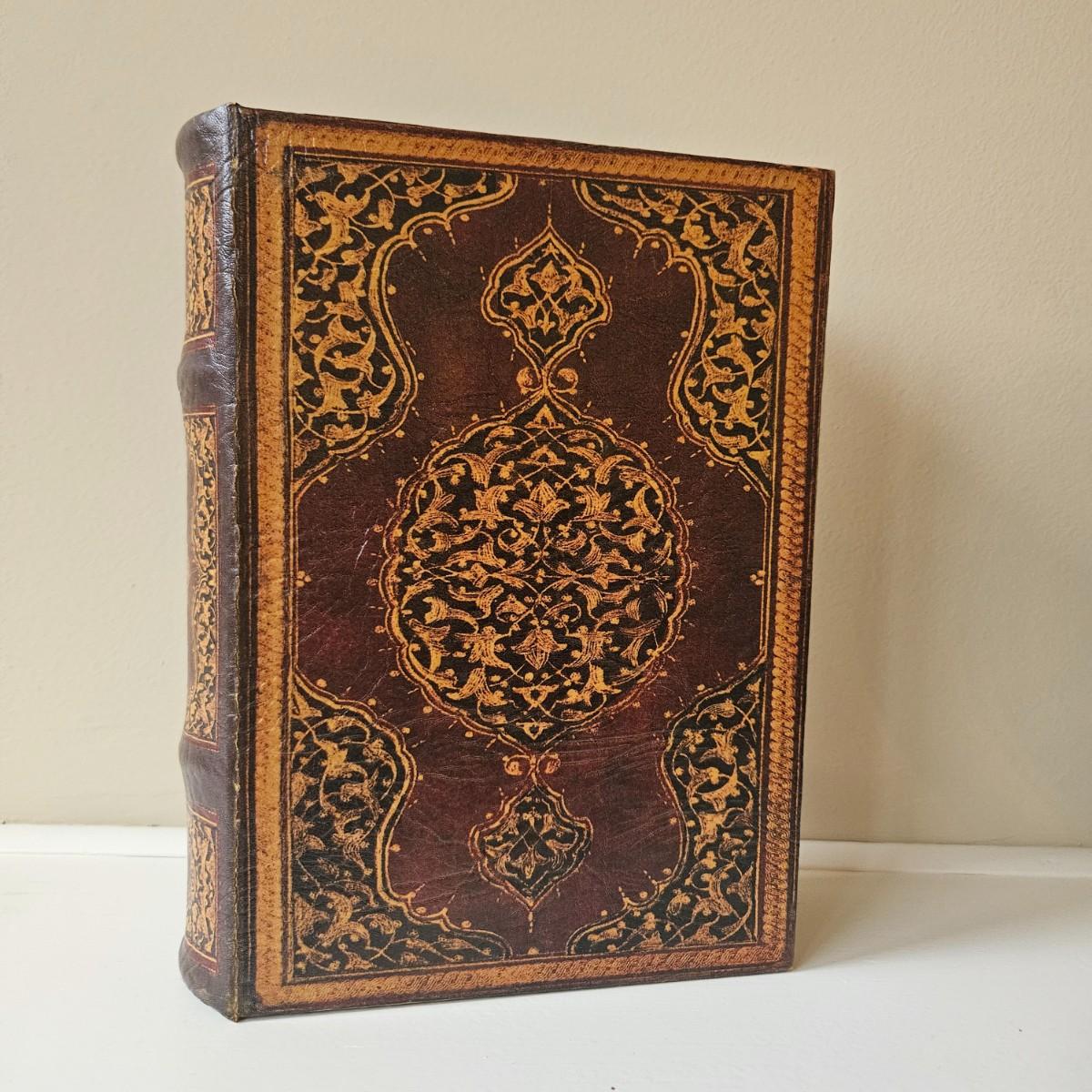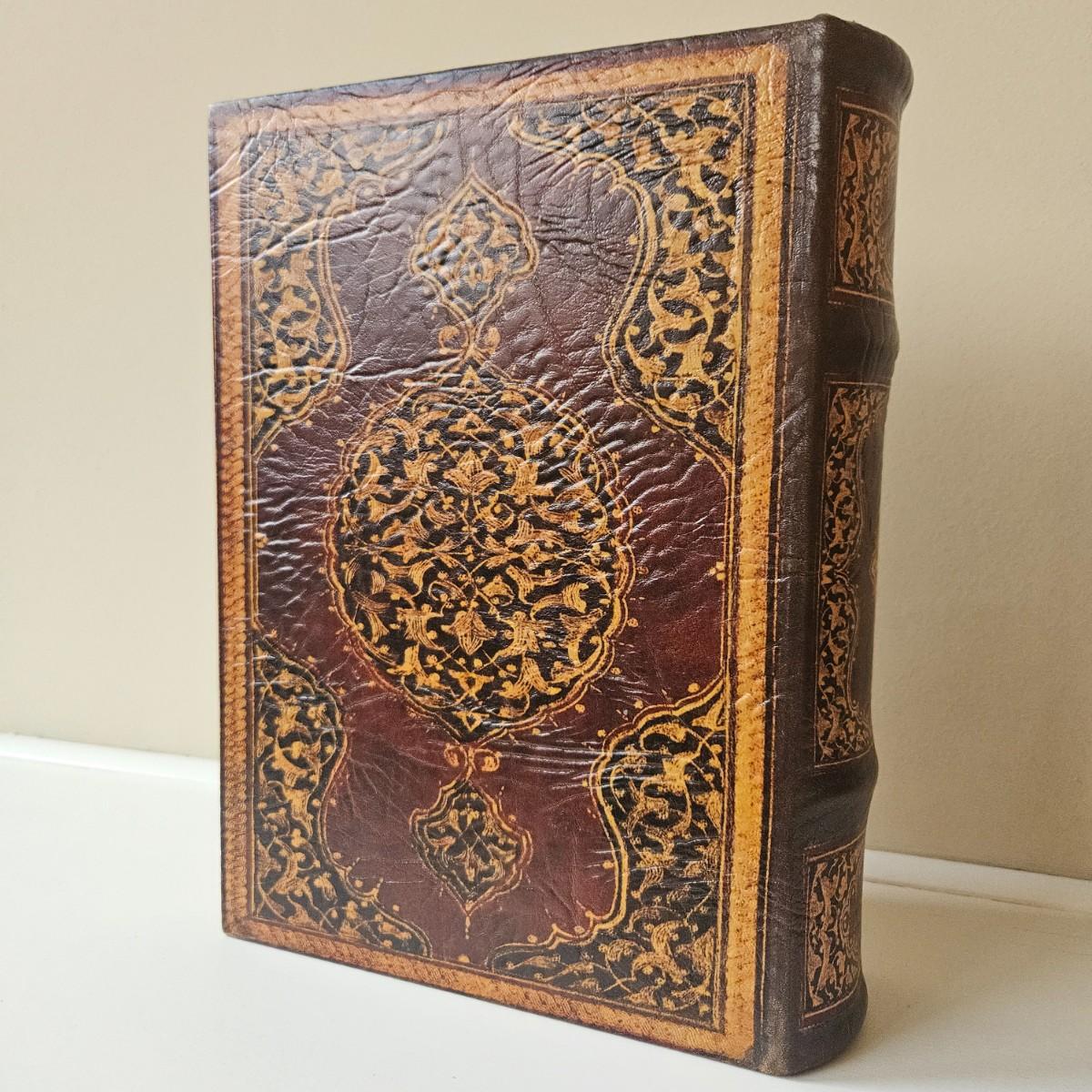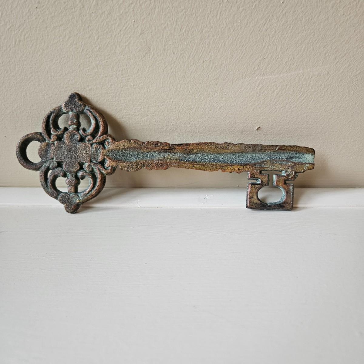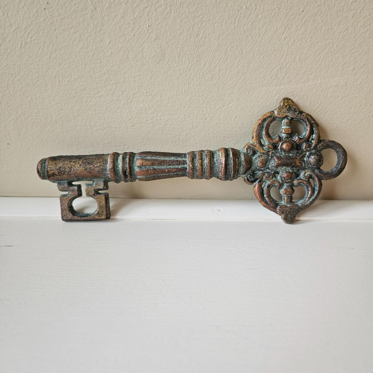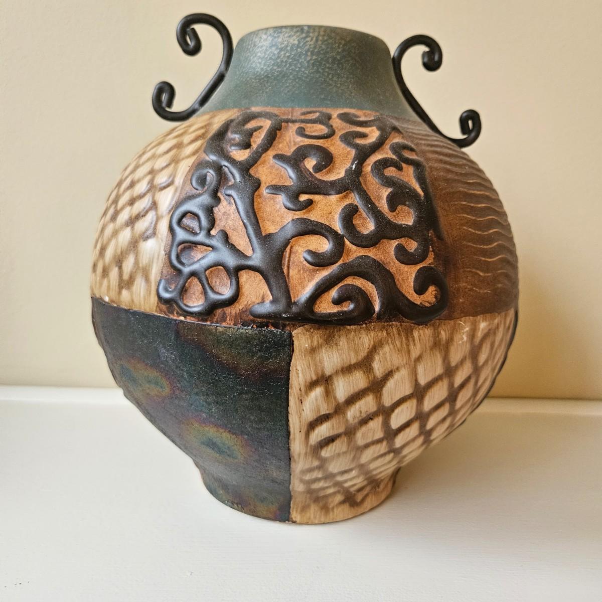 Am assortment of four pieces of home decor items. Included is a box that looks like a leather-bound book made of wood, a ceramic vase with metal handles that measures approximately 9"D x 10.5"H, a metal key and a metal basket with a floral design. Shipping available