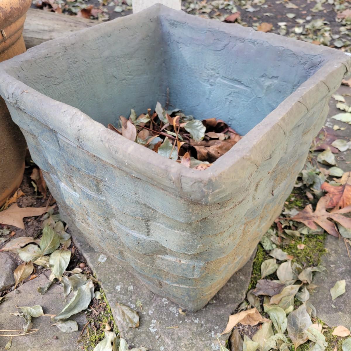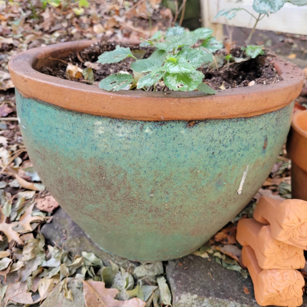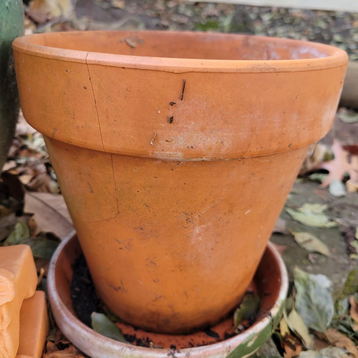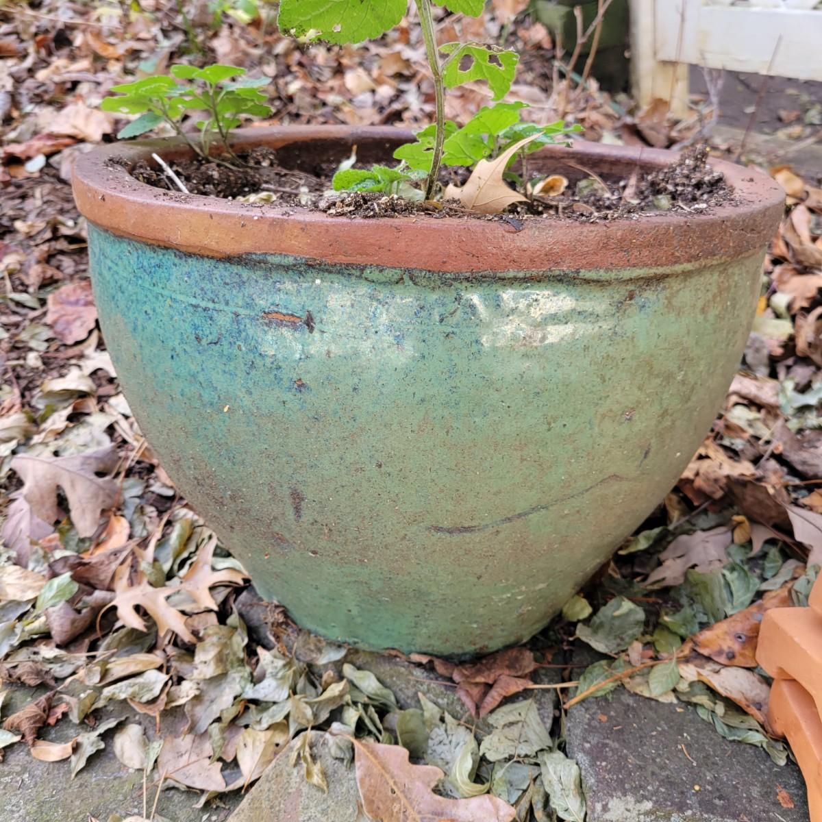 An assortment of planters that are a mix of materials. Included are five planters, the three largest are ceramic and the two smaller ones are terracotta. Also included is a set of three terracotta planter feet. See images for conditions and examples of blemishes. The large green planter measures approximately 15"D x 11.5"H. Local pickup only