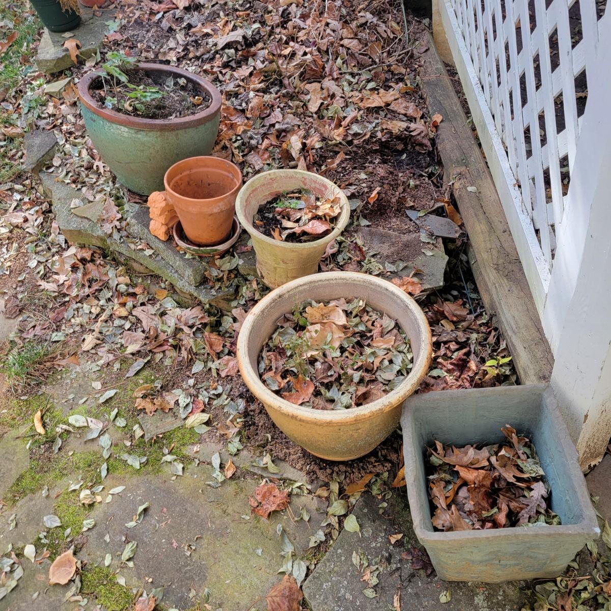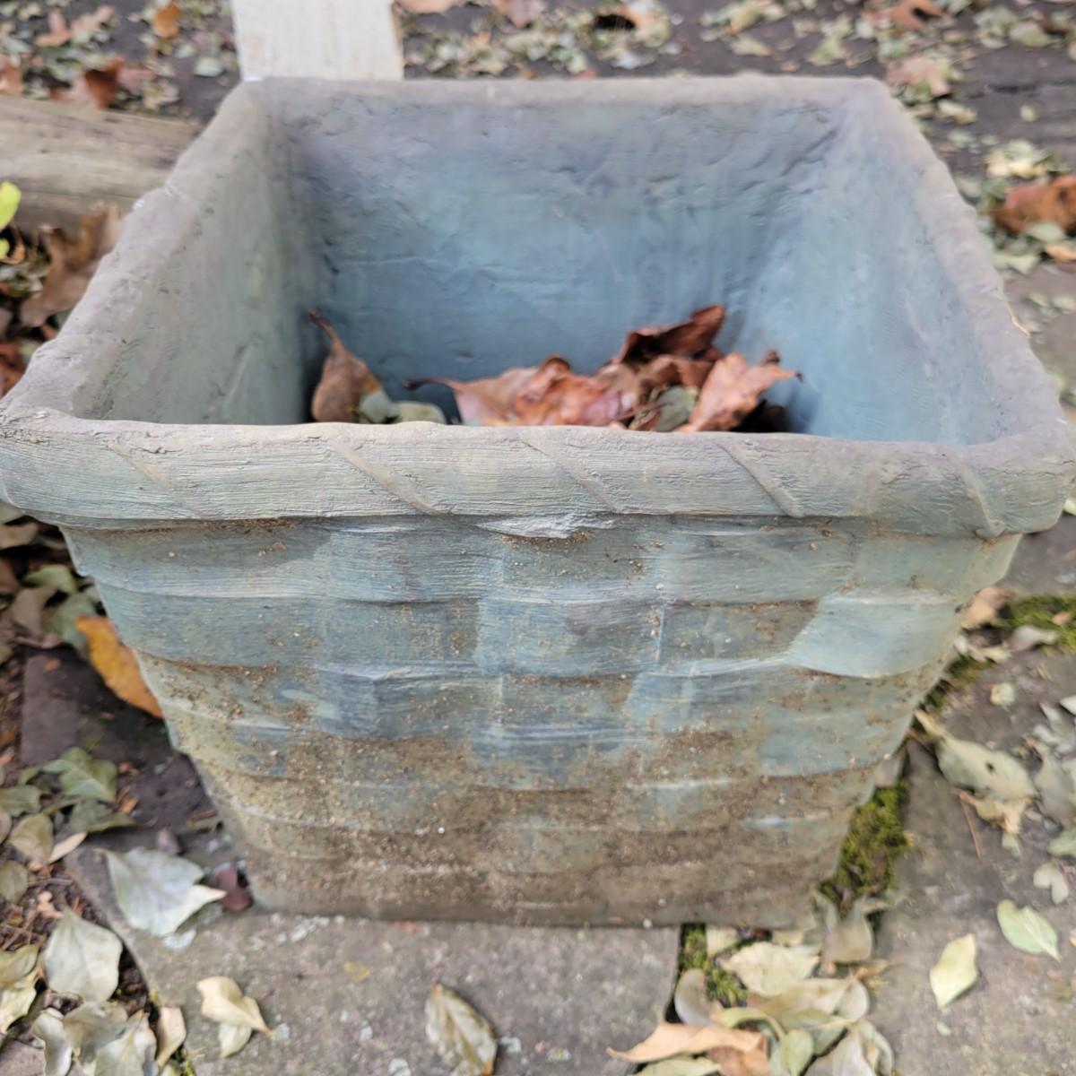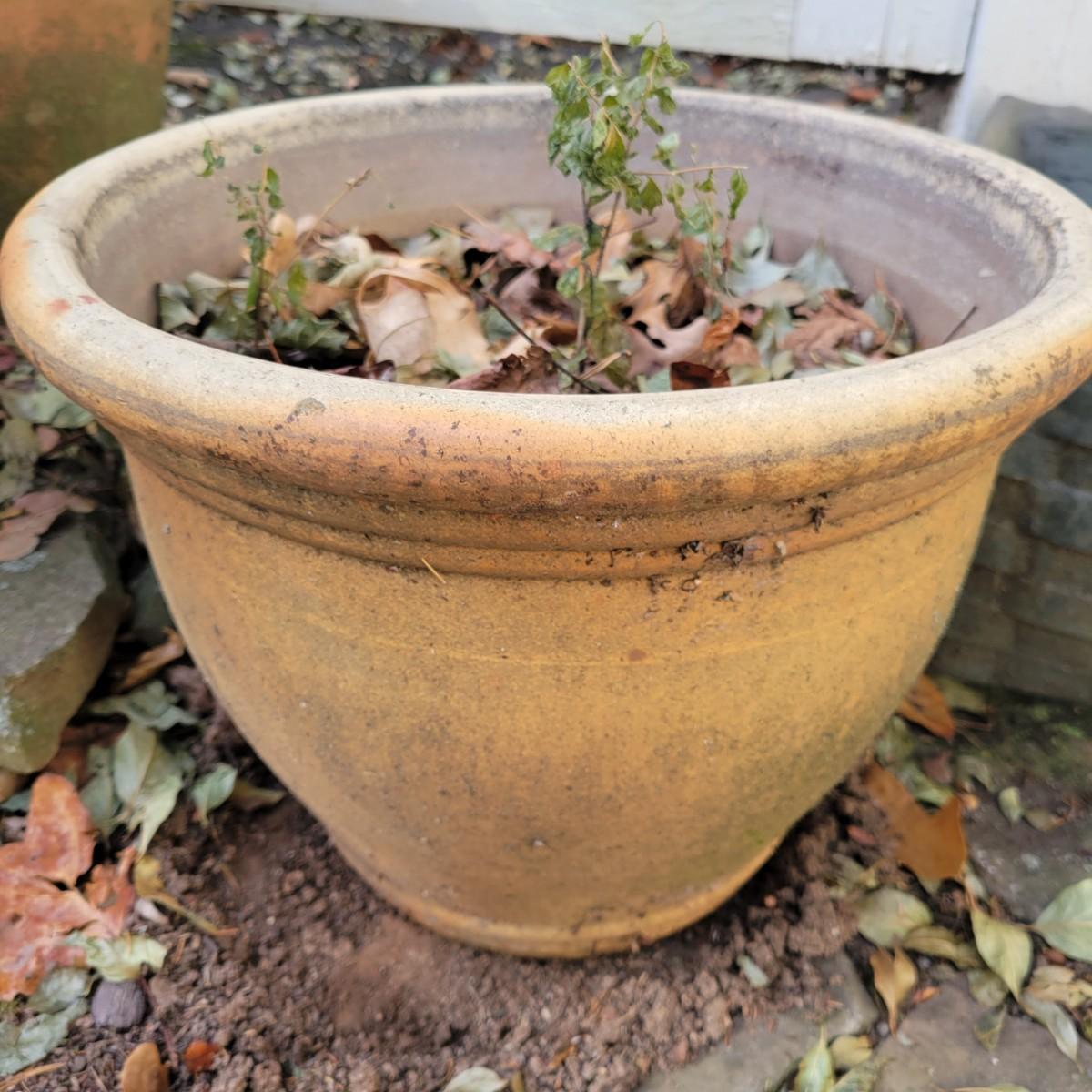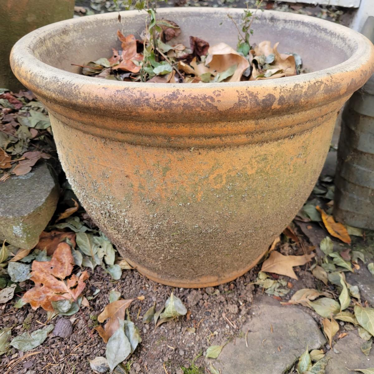 An assortment of planters that are a mix of materials. Included are five planters, the three largest are ceramic and the two smaller ones are terracotta. Also included is a set of three terracotta planter feet. See images for conditions and examples of blemishes. The large green planter measures approximately 15"D x 11.5"H. Local pickup only