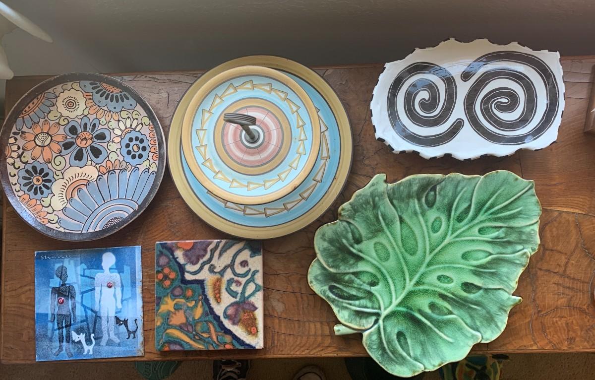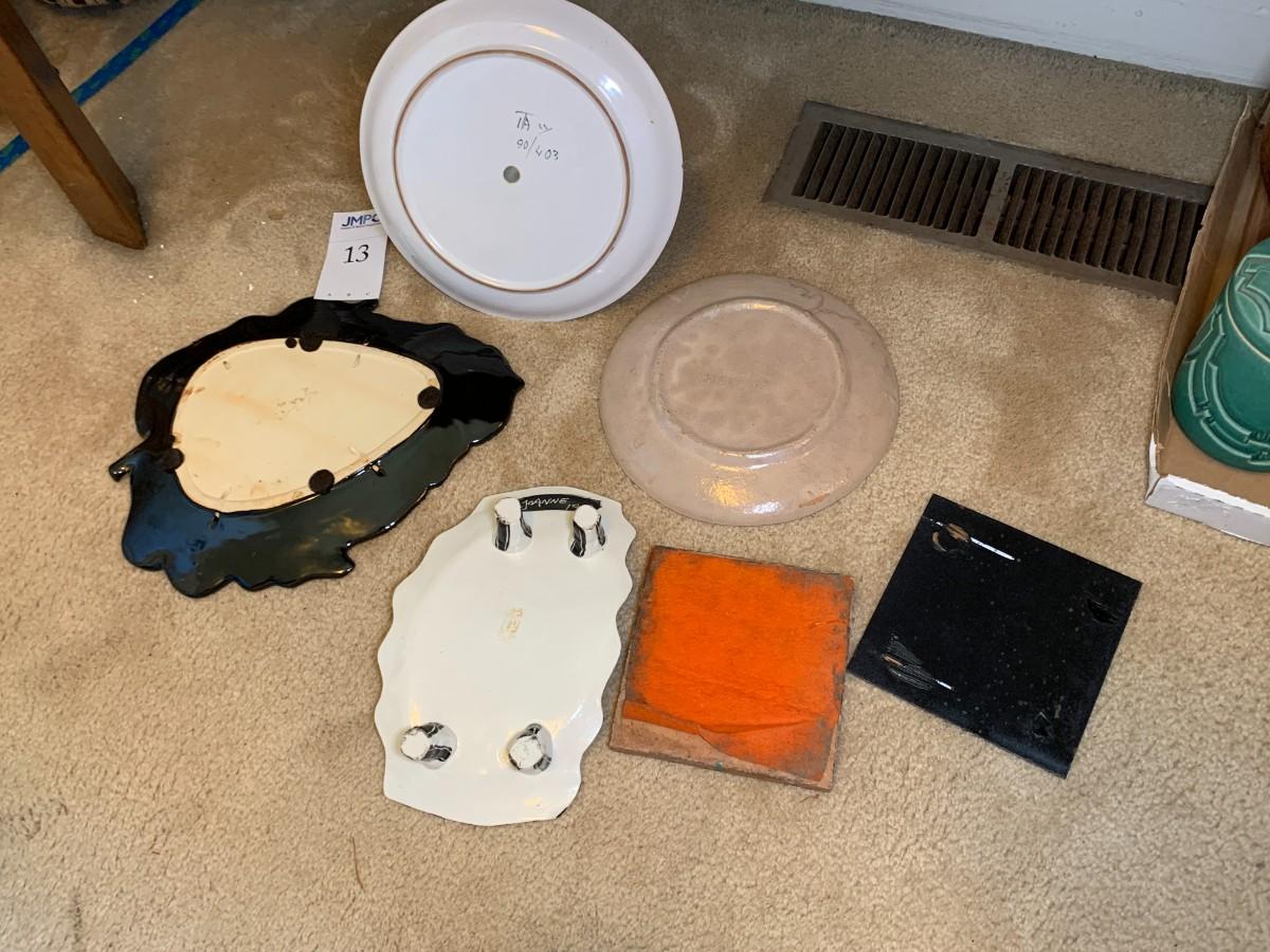 Green Leaf, Italian two level cookie plates, original rectangle platter by "Joanne", Mexican plate, hand painted tile, enamel metal tile. Not checked for chips, crazing. 6 pieces total