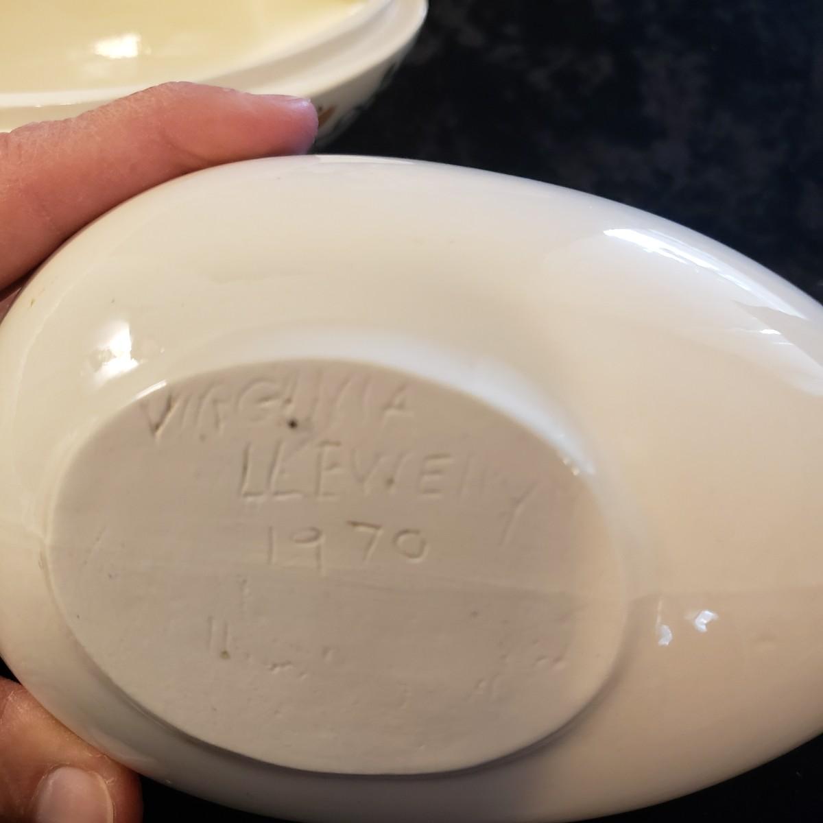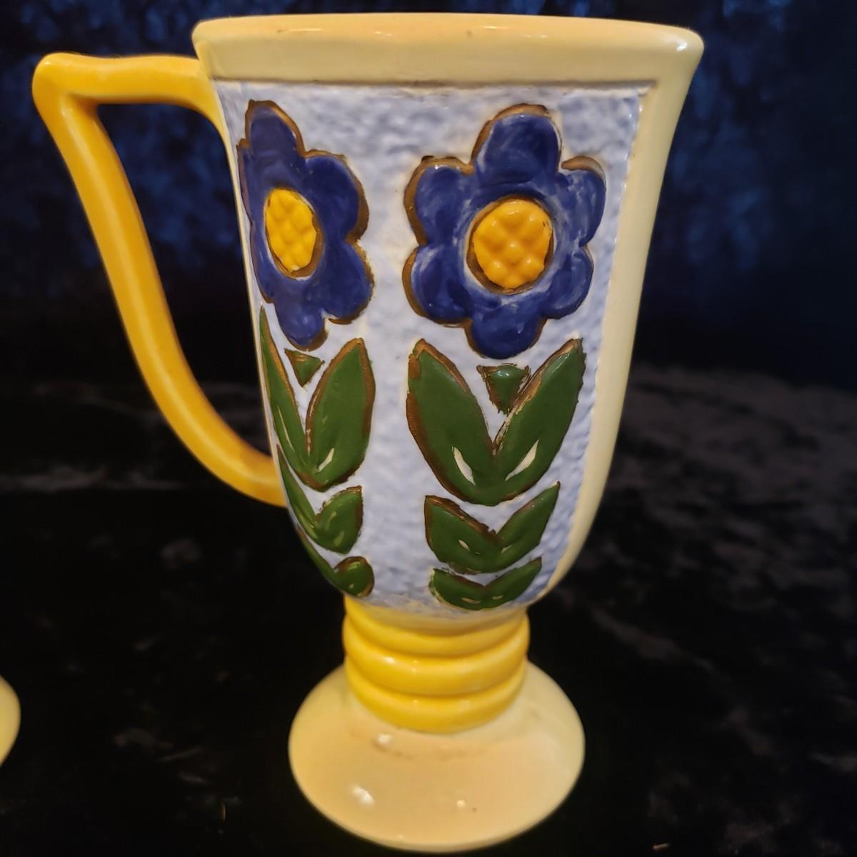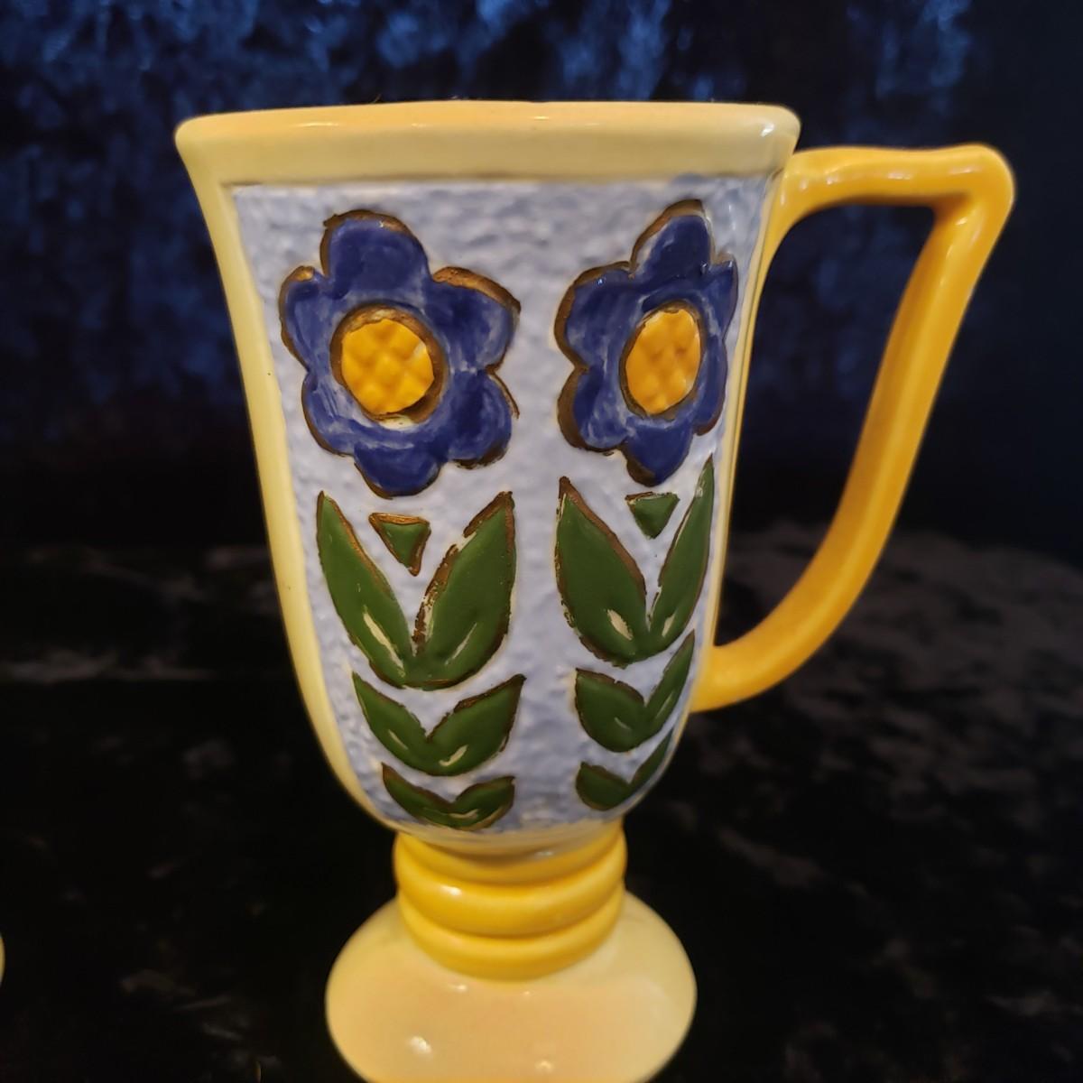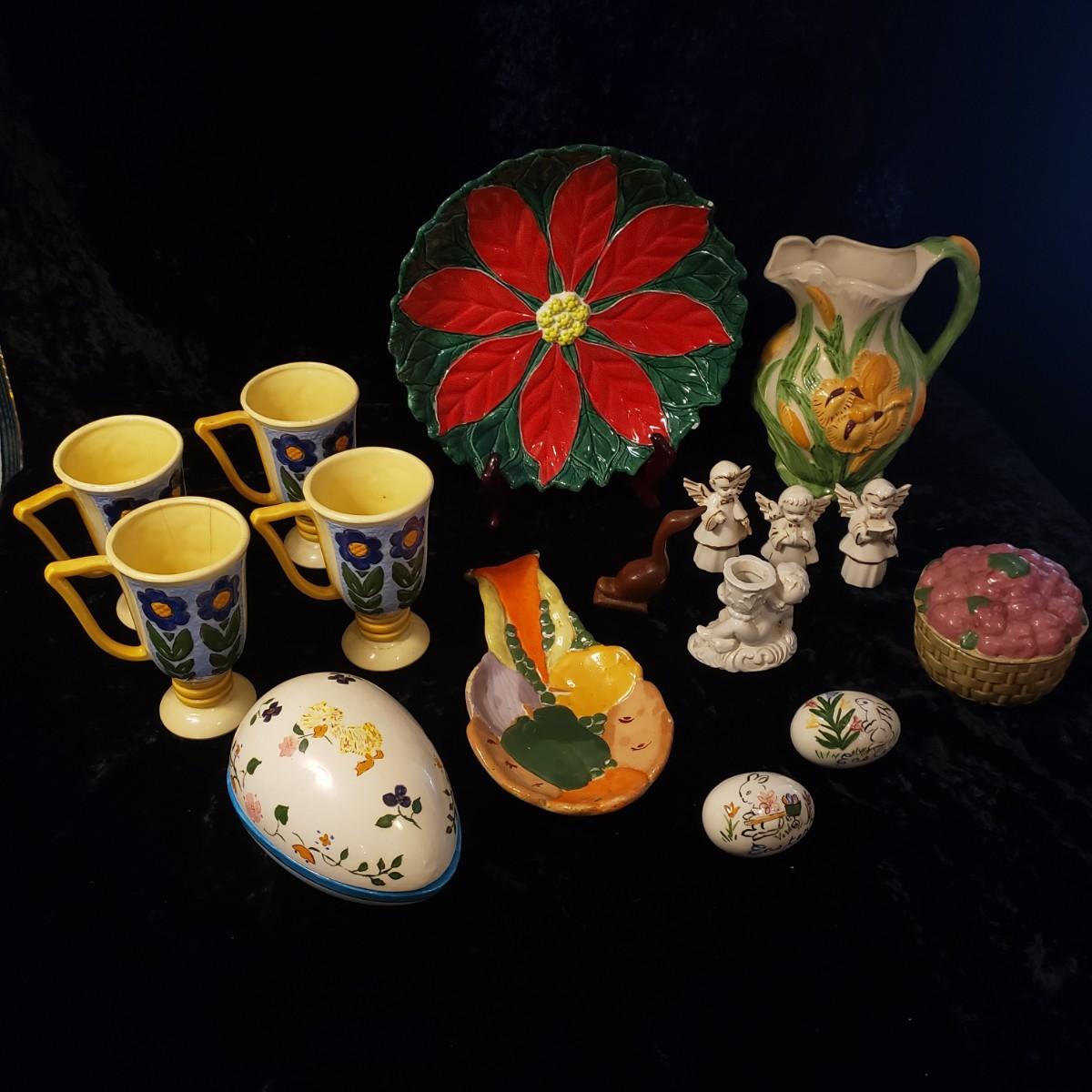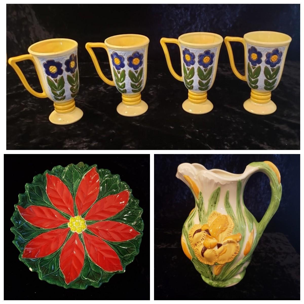 This mostly ceramic art was made by Virginia Llewellyn back in the 1970's. We believe she was a relative of this seller. The Iris pitcher measures 6" x 9"H. The Poinsettia plate is 10", dish holder not included. The ceramics definitely have a 70's charm! The angel has a wing broken and the mugs have a few cracks, yet are all still functional.
