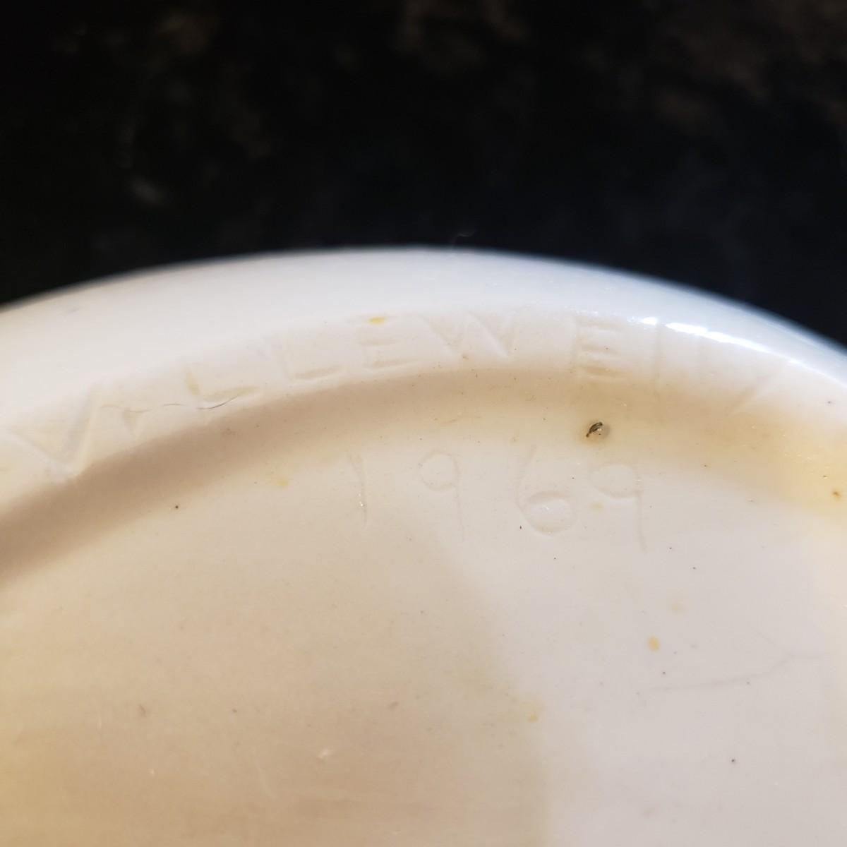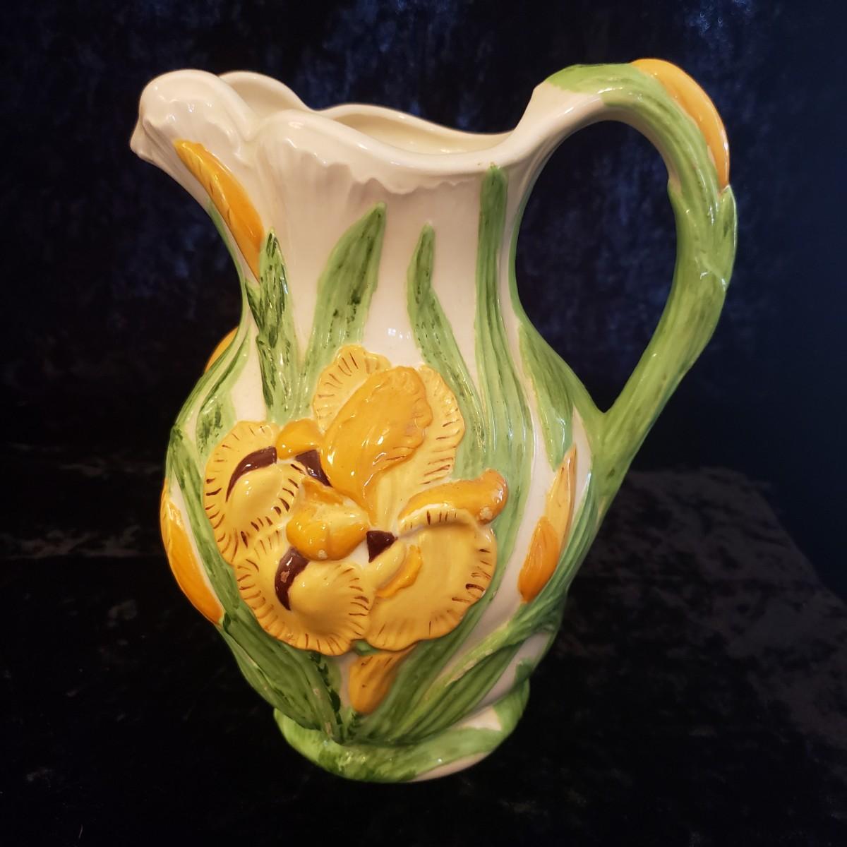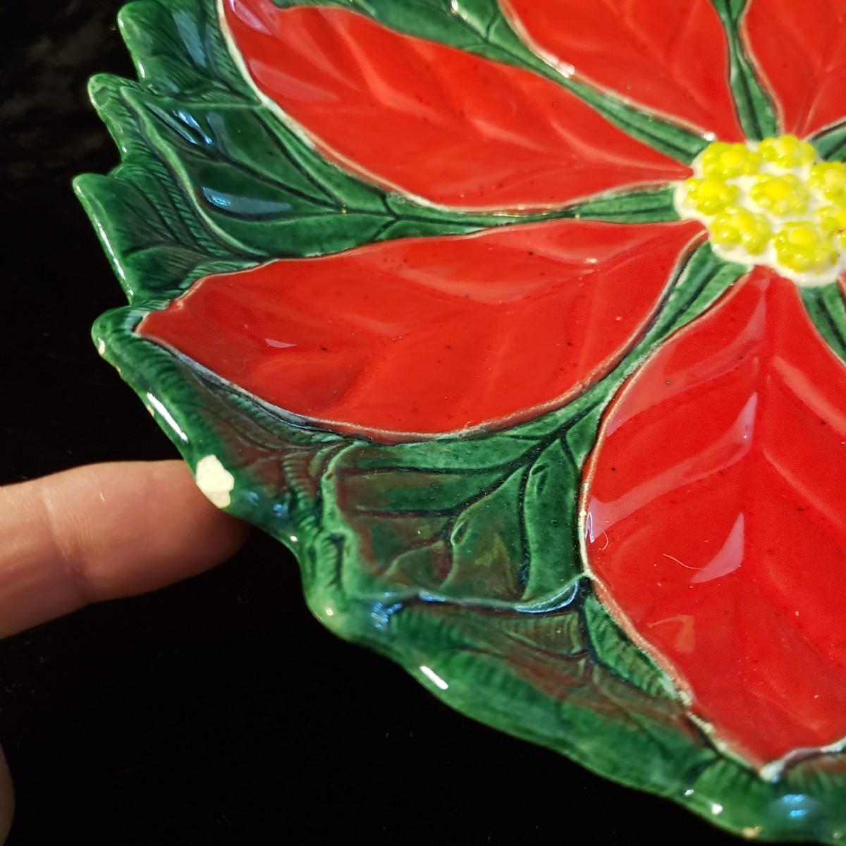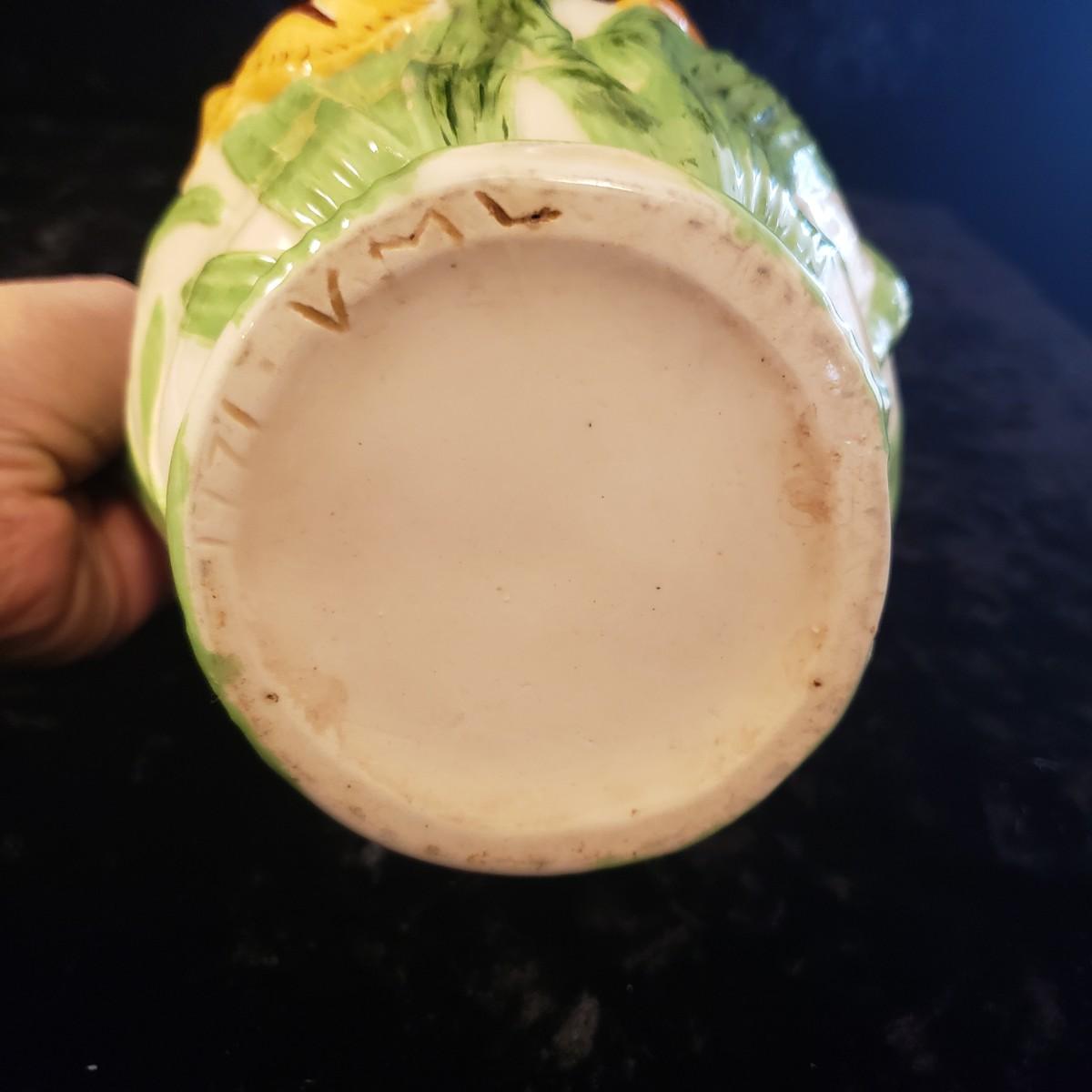 This mostly ceramic art was made by Virginia Llewellyn back in the 1970's. We believe she was a relative of this seller. The Iris pitcher measures 6" x 9"H. The Poinsettia plate is 10", dish holder not included. The ceramics definitely have a 70's charm! The angel has a wing broken and the mugs have a few cracks, yet are all still functional.