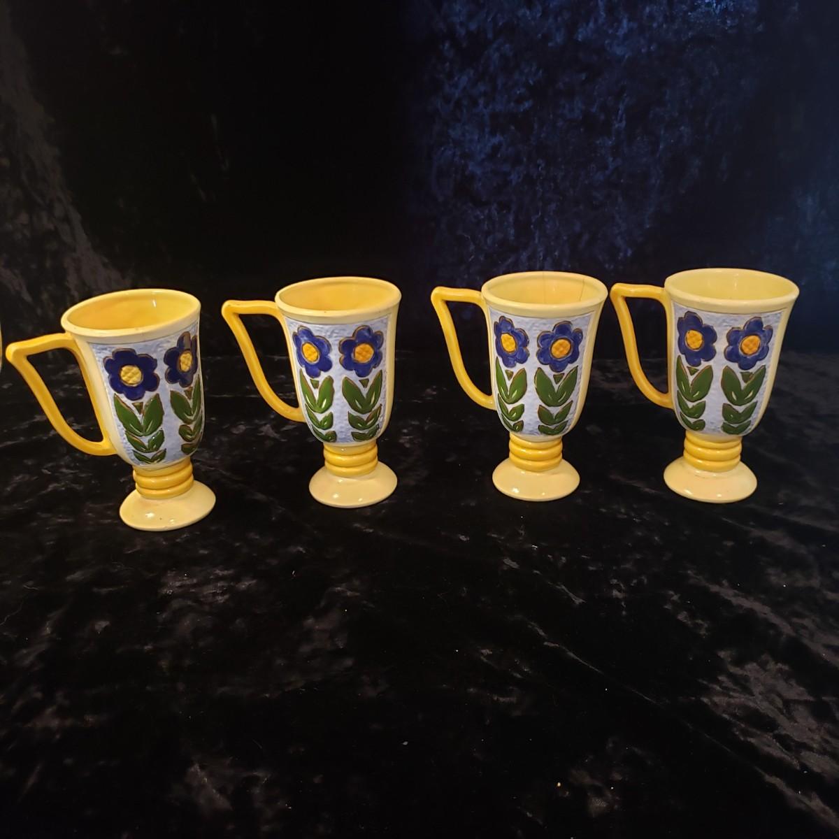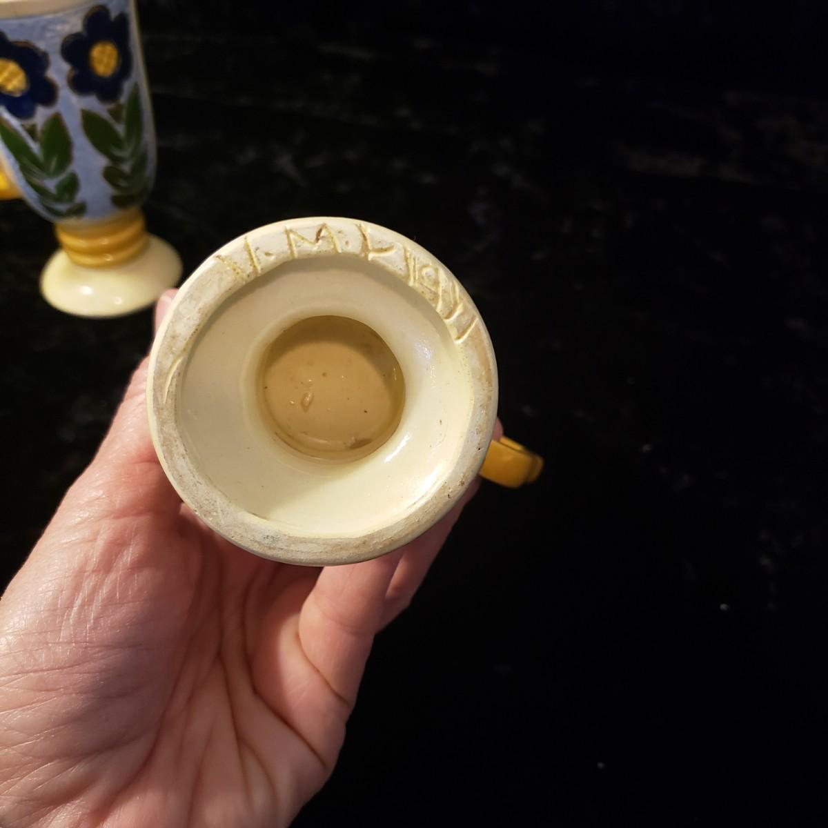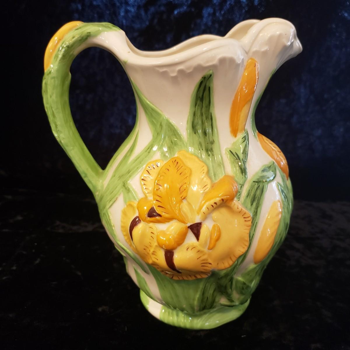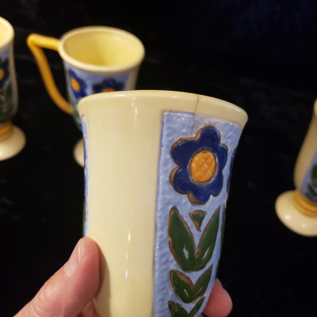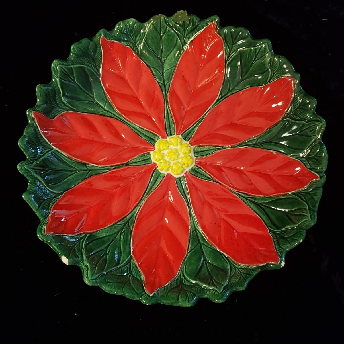 This mostly ceramic art was made by Virginia Llewellyn back in the 1970's. We believe she was a relative of this seller. The Iris pitcher measures 6" x 9"H. The Poinsettia plate is 10", dish holder not included. The ceramics definitely have a 70's charm! The angel has a wing broken and the mugs have a few cracks, yet are all still functional.