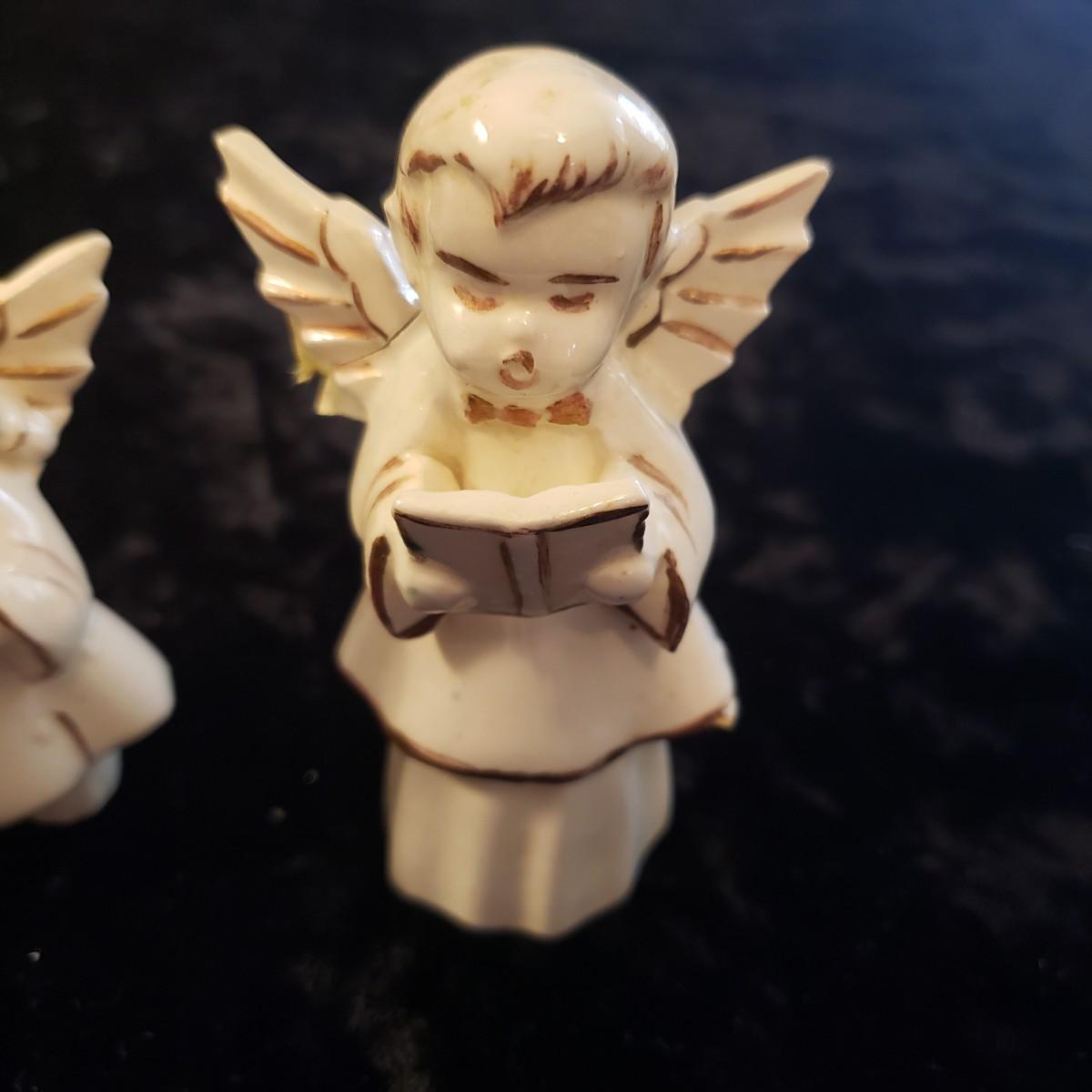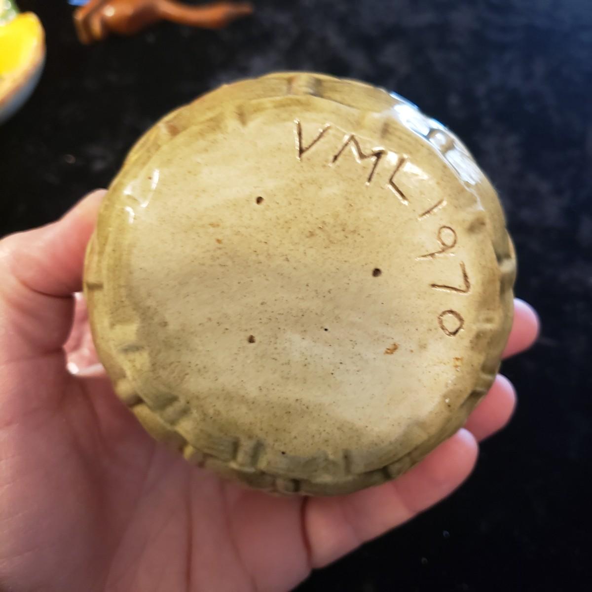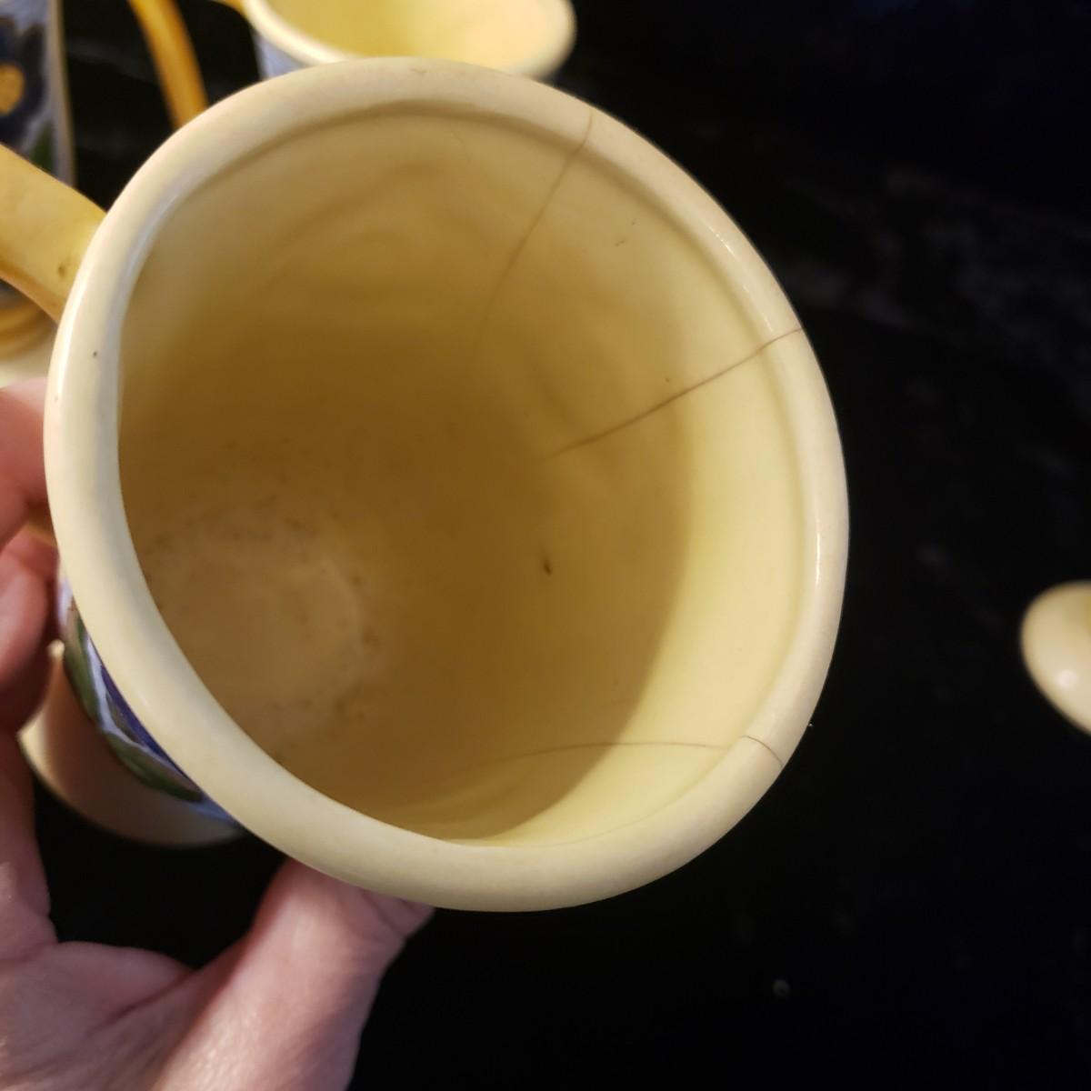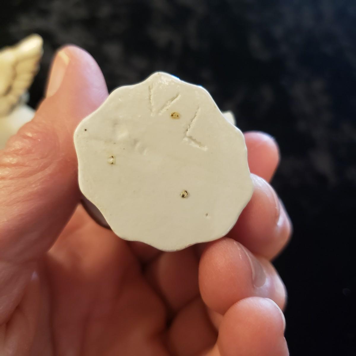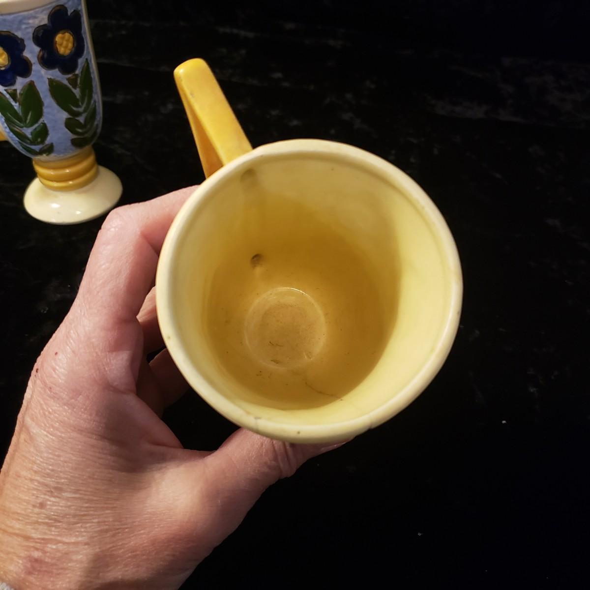 This mostly ceramic art was made by Virginia Llewellyn back in the 1970's. We believe she was a relative of this seller. The Iris pitcher measures 6" x 9"H. The Poinsettia plate is 10", dish holder not included. The ceramics definitely have a 70's charm! The angel has a wing broken and the mugs have a few cracks, yet are all still functional.