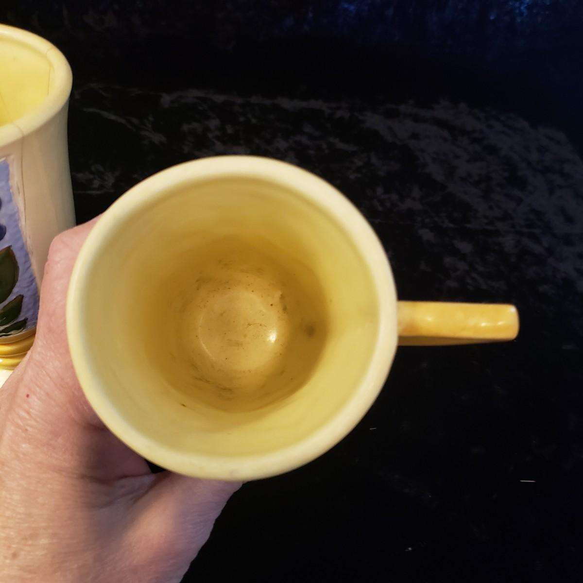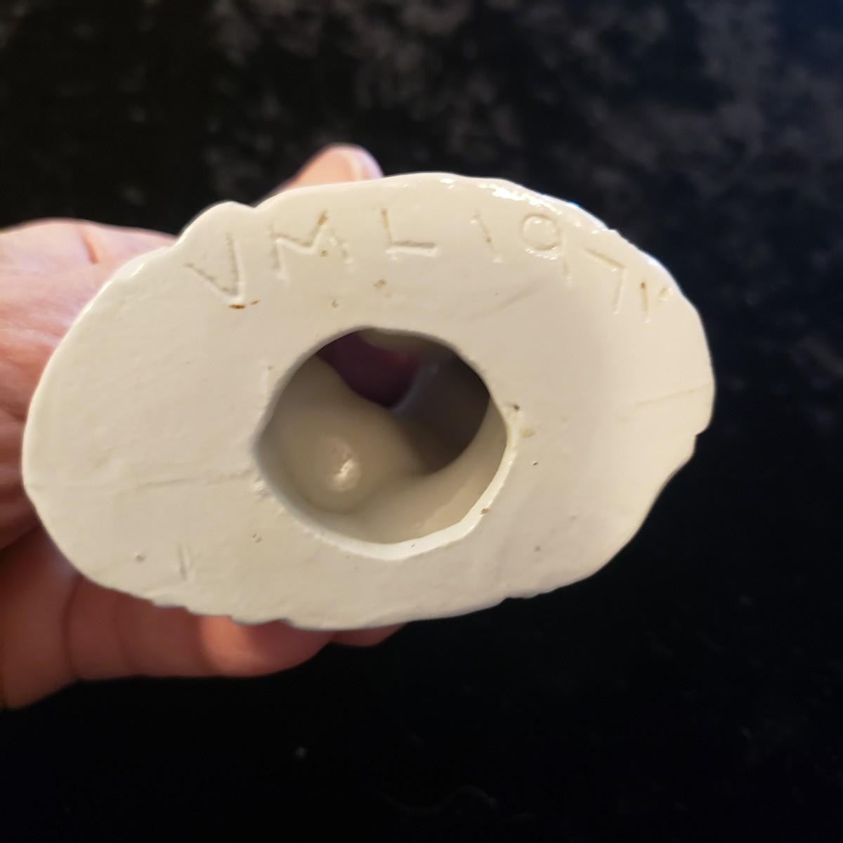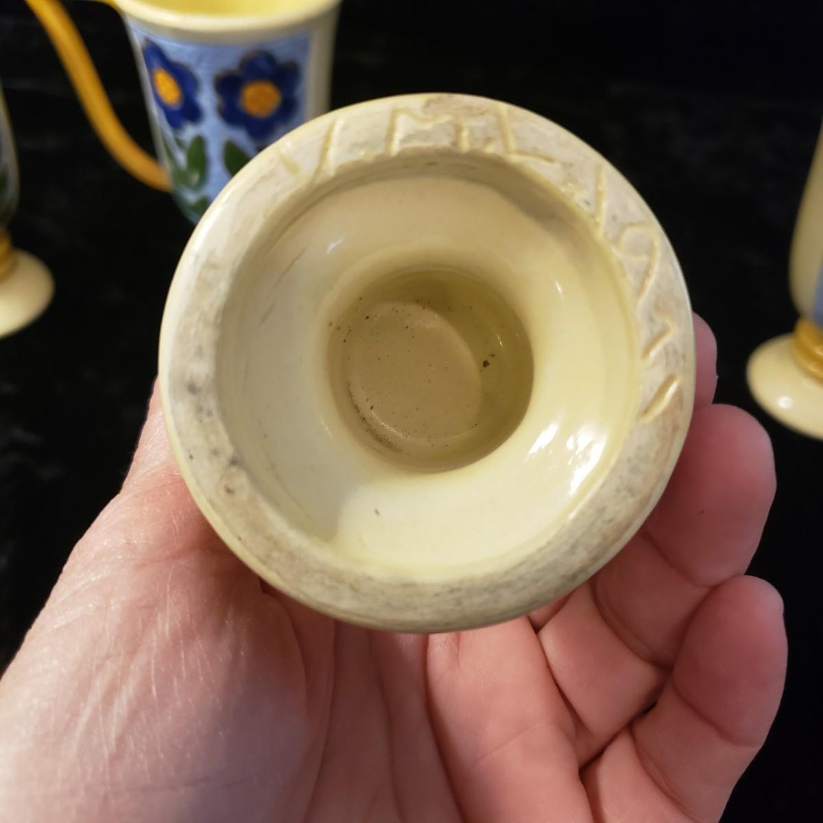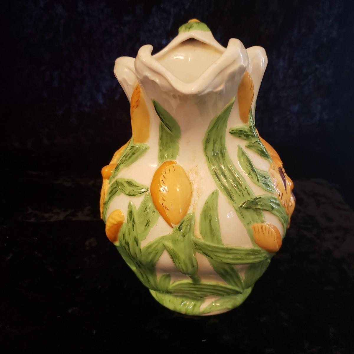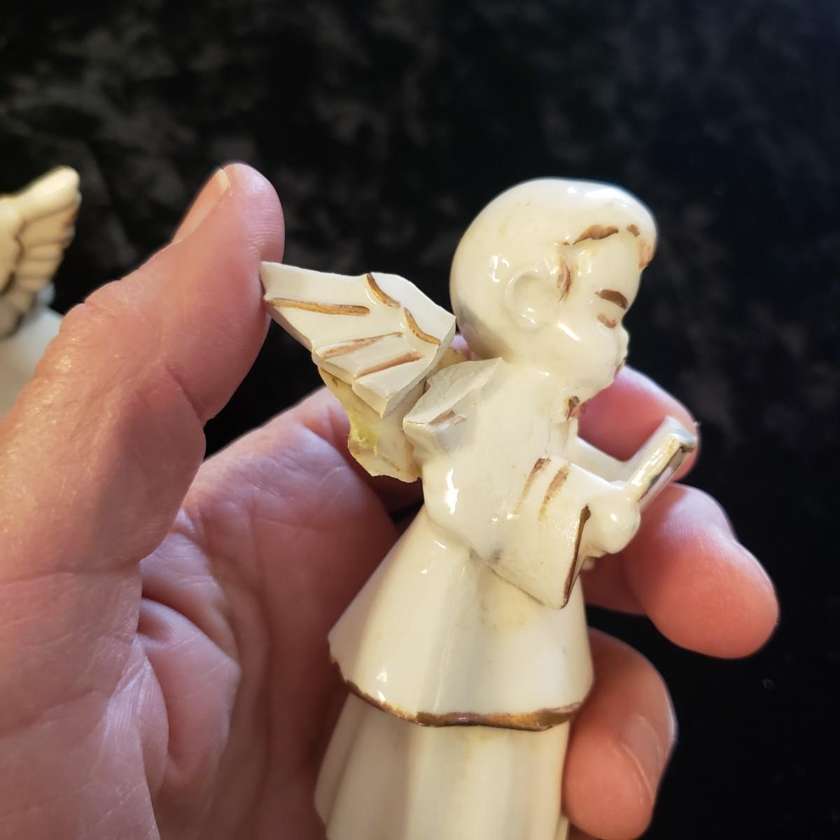 This mostly ceramic art was made by Virginia Llewellyn back in the 1970's. We believe she was a relative of this seller. The Iris pitcher measures 6" x 9"H. The Poinsettia plate is 10", dish holder not included. The ceramics definitely have a 70's charm! The angel has a wing broken and the mugs have a few cracks, yet are all still functional.