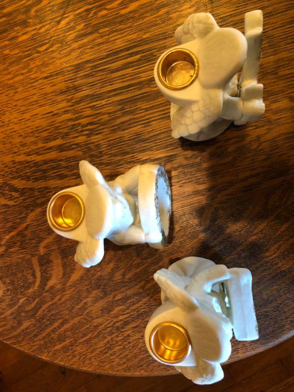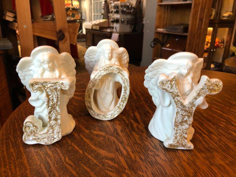 PRETTY CERAMIC ANGEL CANDLE HOLDERS HOLDS TAPER CANDLES, J O Y, SET OF THREE