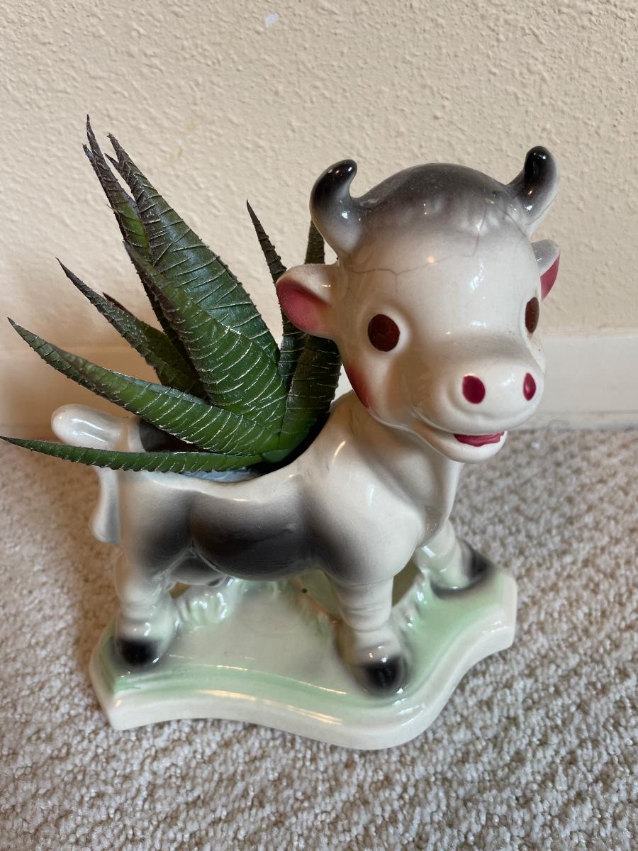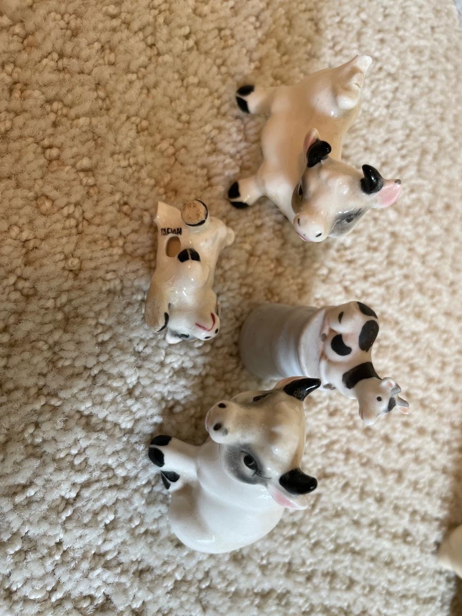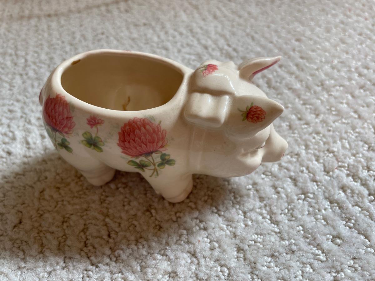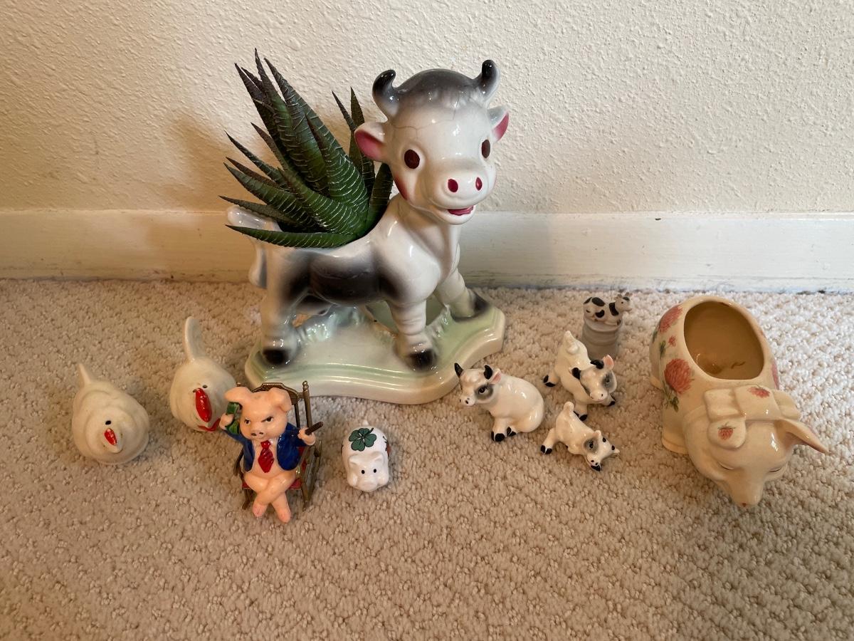 Ceramic floral pig, mini cows, pigs and chickens. Cow planter has some cracks but is still so cute