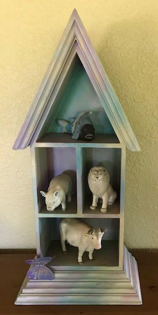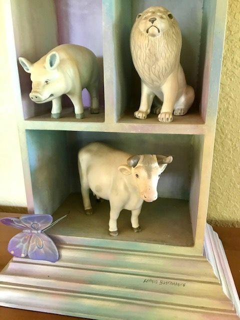 Ceramic Animal Figures in Wooden Shelf By Sergio Bustamante. Local pick up only in Auburn, CA.
