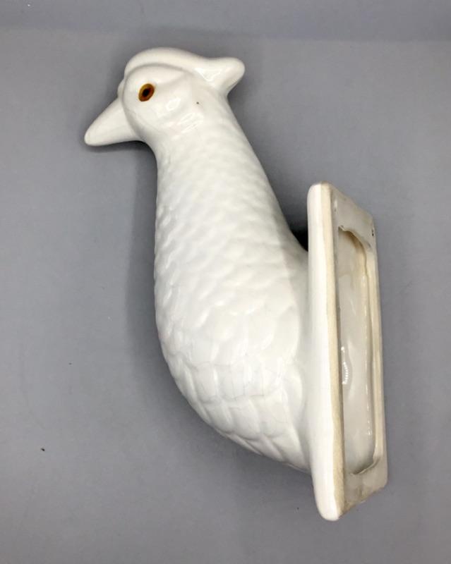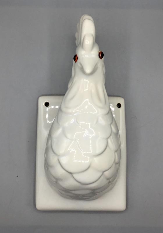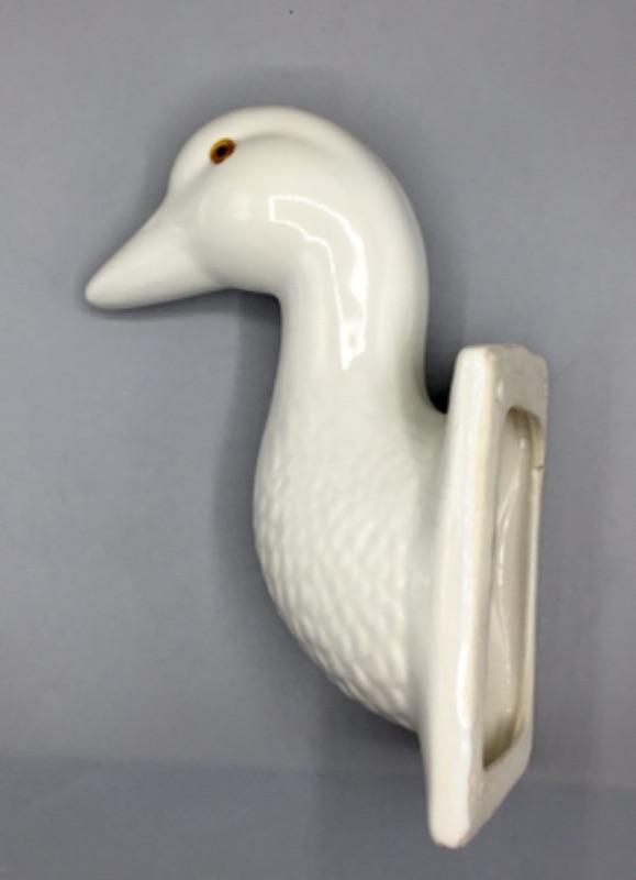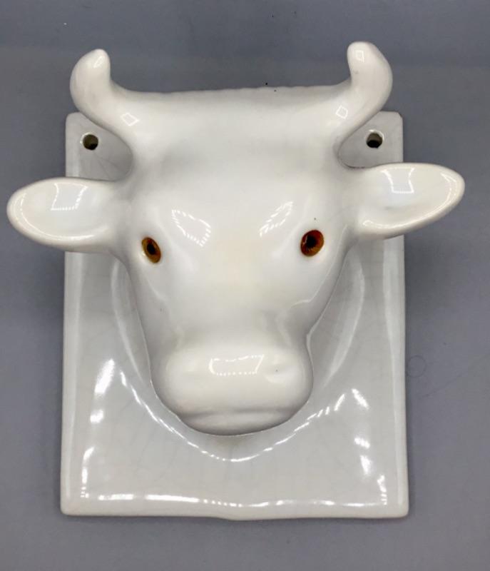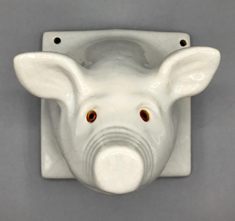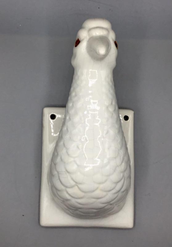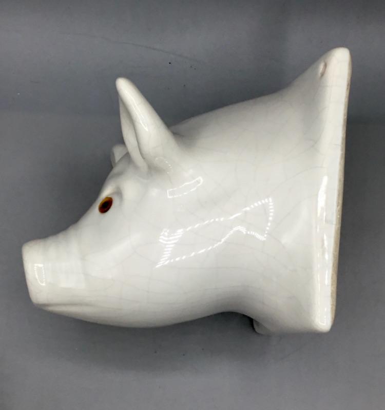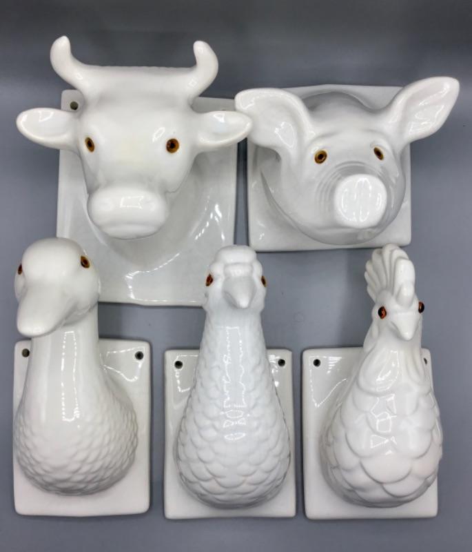 Lot of 5 white ceramic animal heads for hanging on the wall. Bull, pig, duck, chicken and rooster. Bull measures approx 7” tall x 6” wide, protrudes approx out from wall once installed. Pig is approx 5.5” x 5.5”, birds are approx 9” tall x 4” wide. All have colorful, realistic looking eyes.