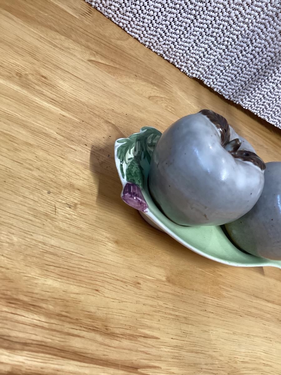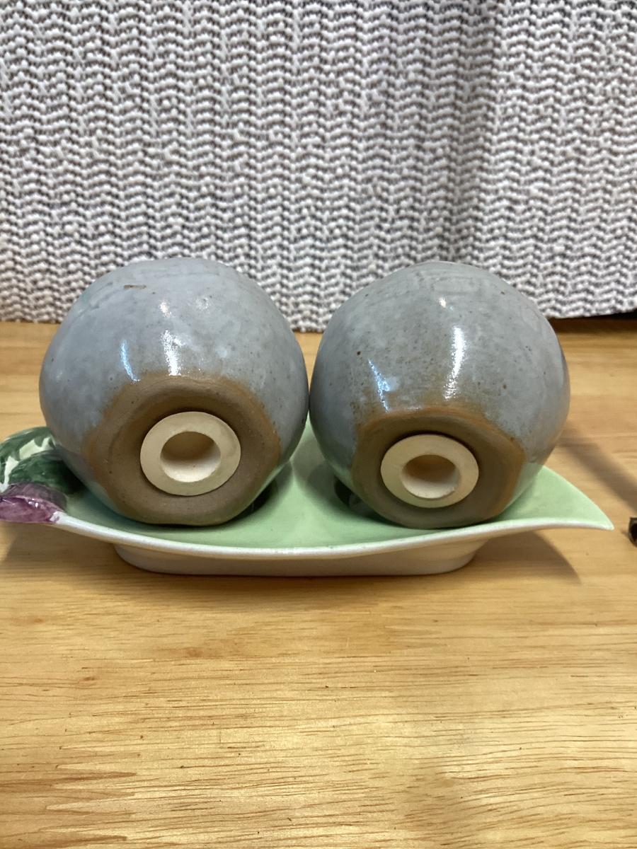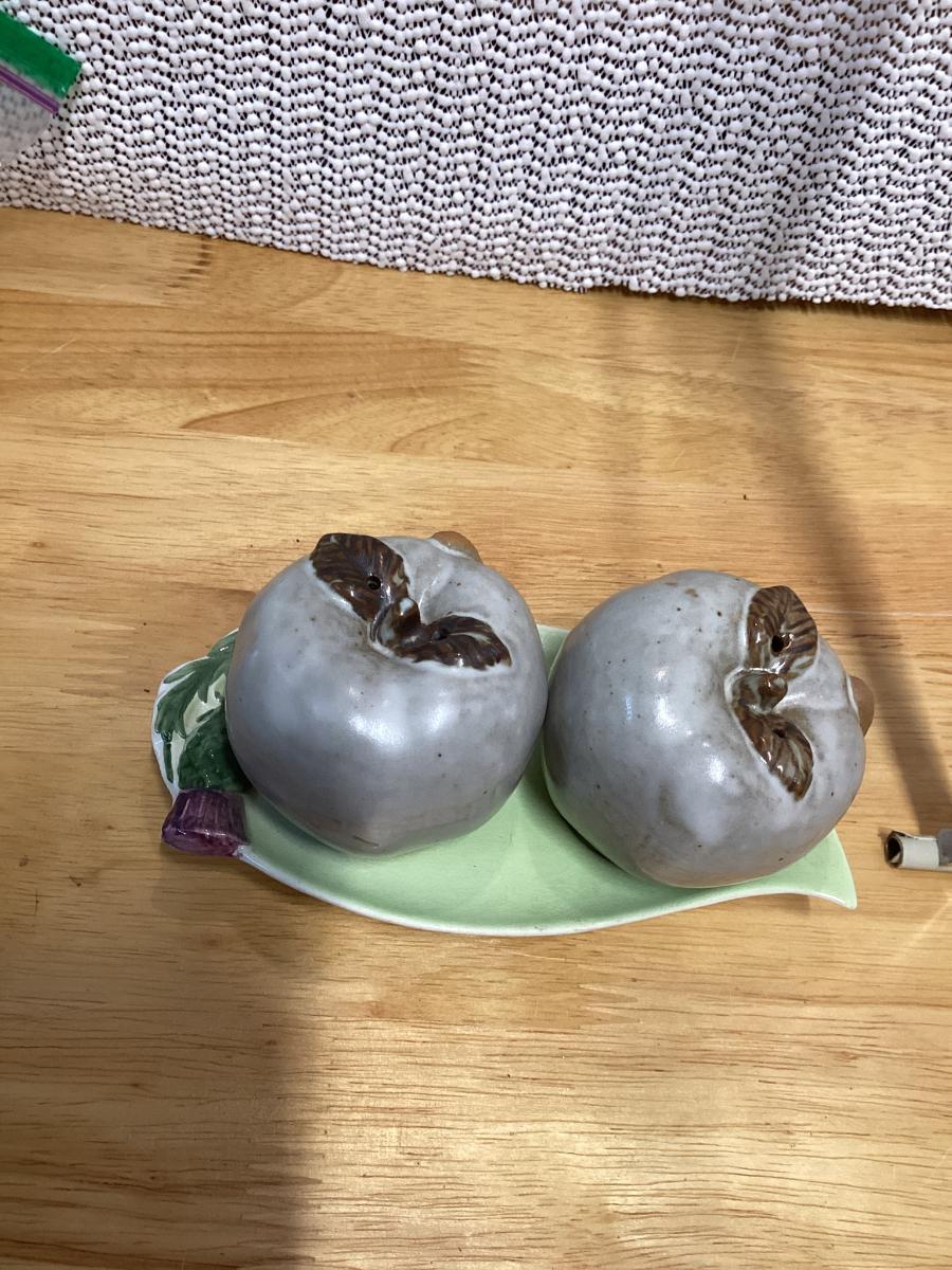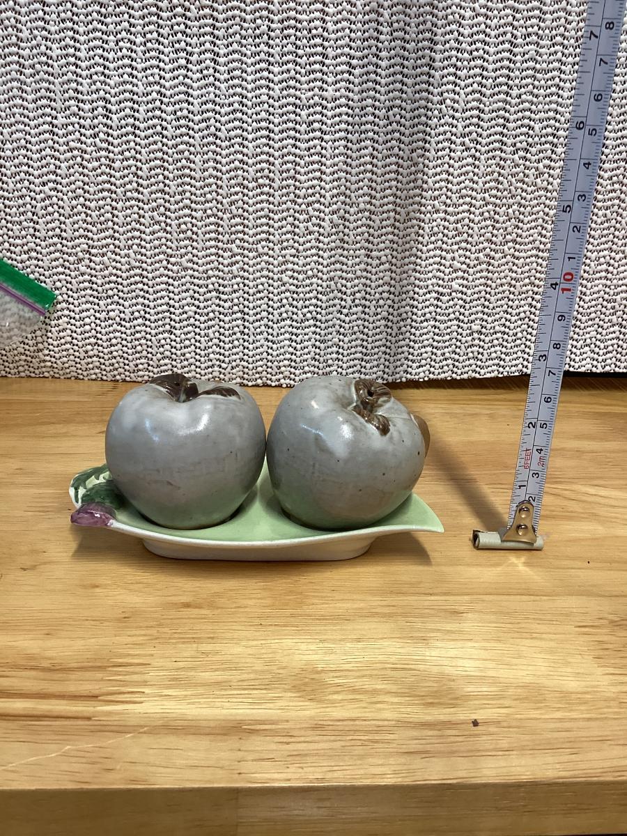Ceramic apple salt and pepper shakers with leaf tray