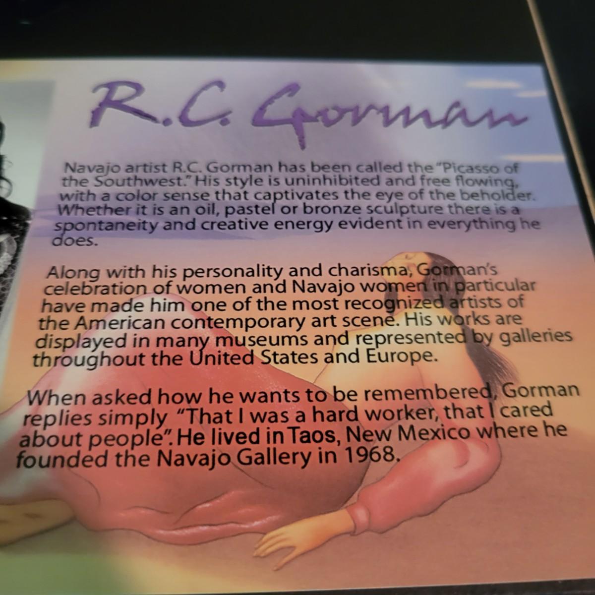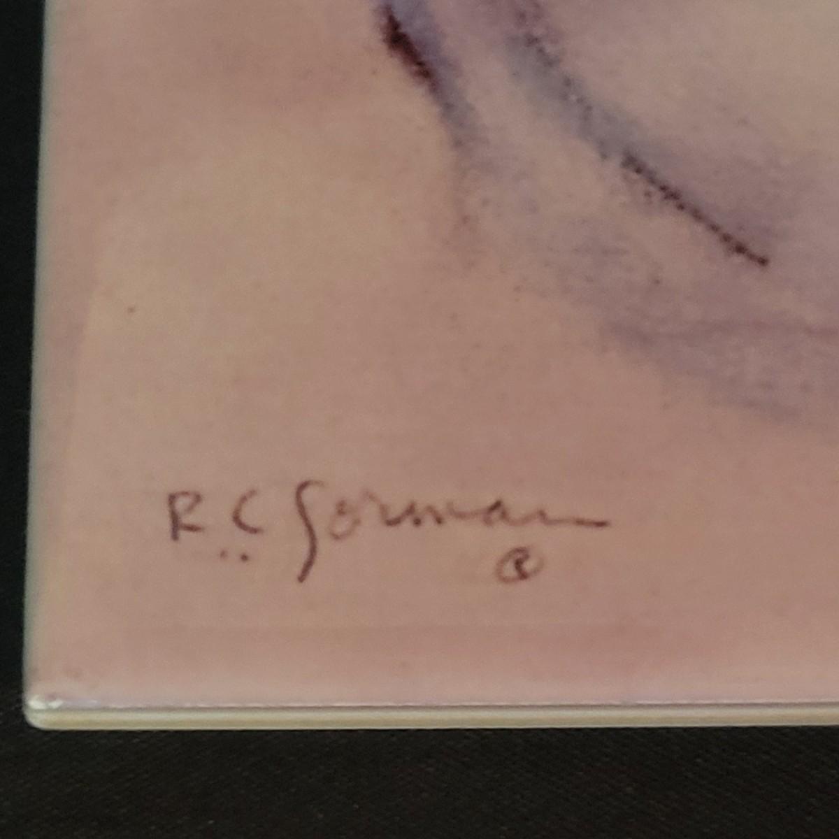 An artistic ceramic tile by Navajo artist R.C. Gorman. This piece has subtle hues with flowing lines and measures approximately 8" x 6"H. Shipping available