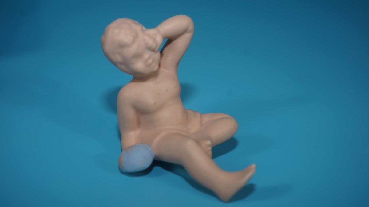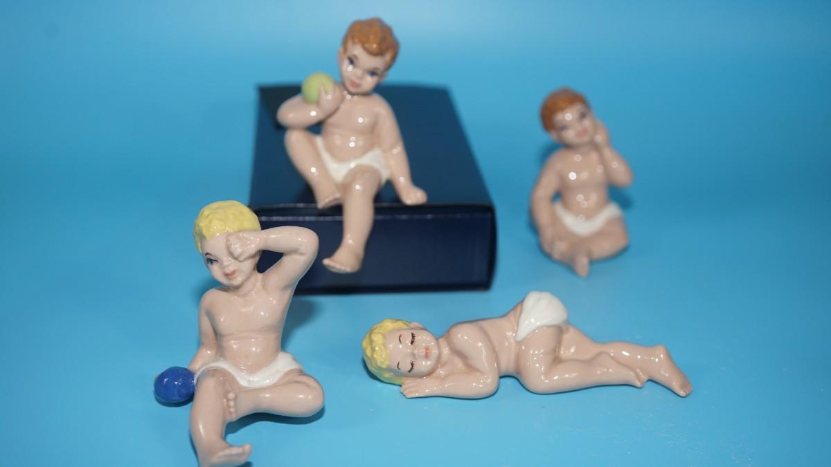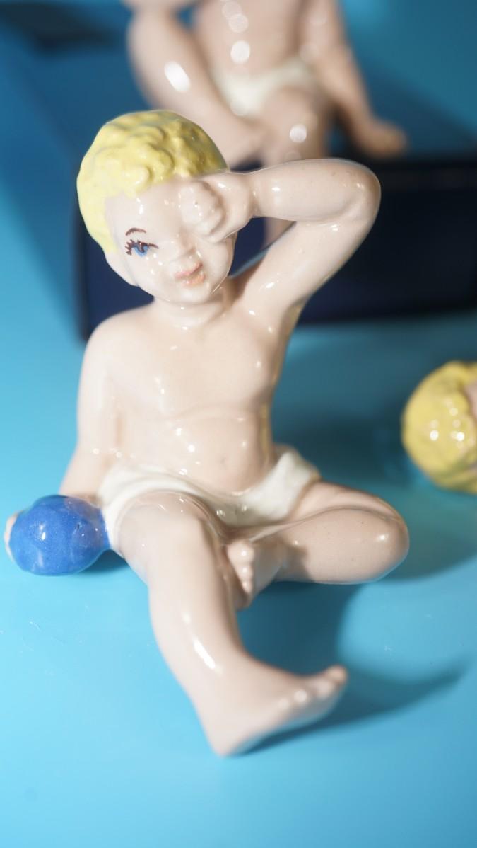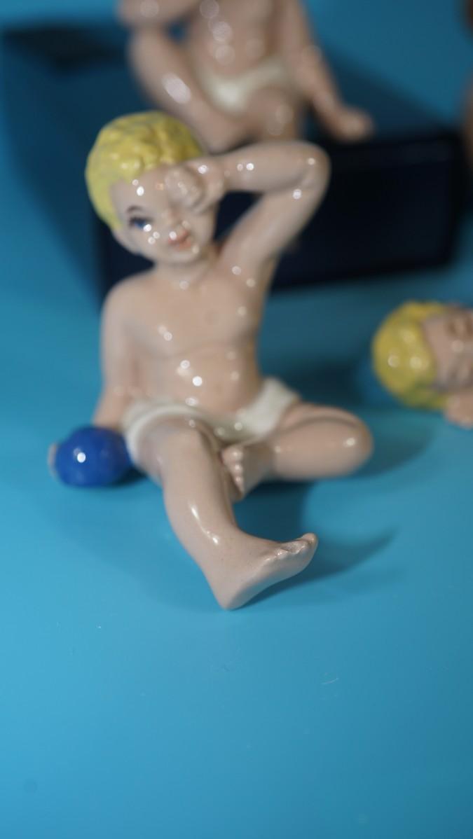 glazed and two holding a ball, one reclining in a nap there is one that did not get painted or glazed