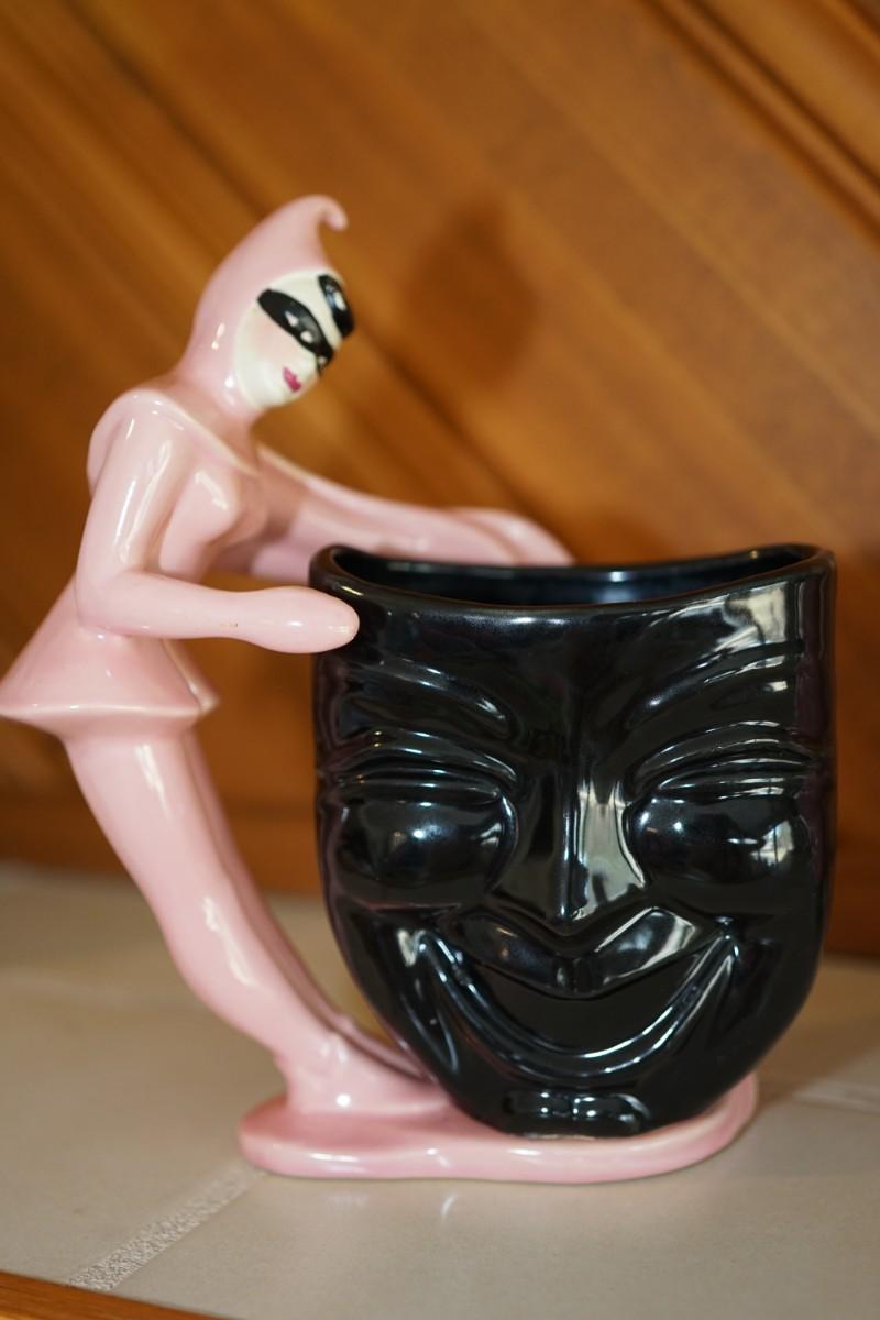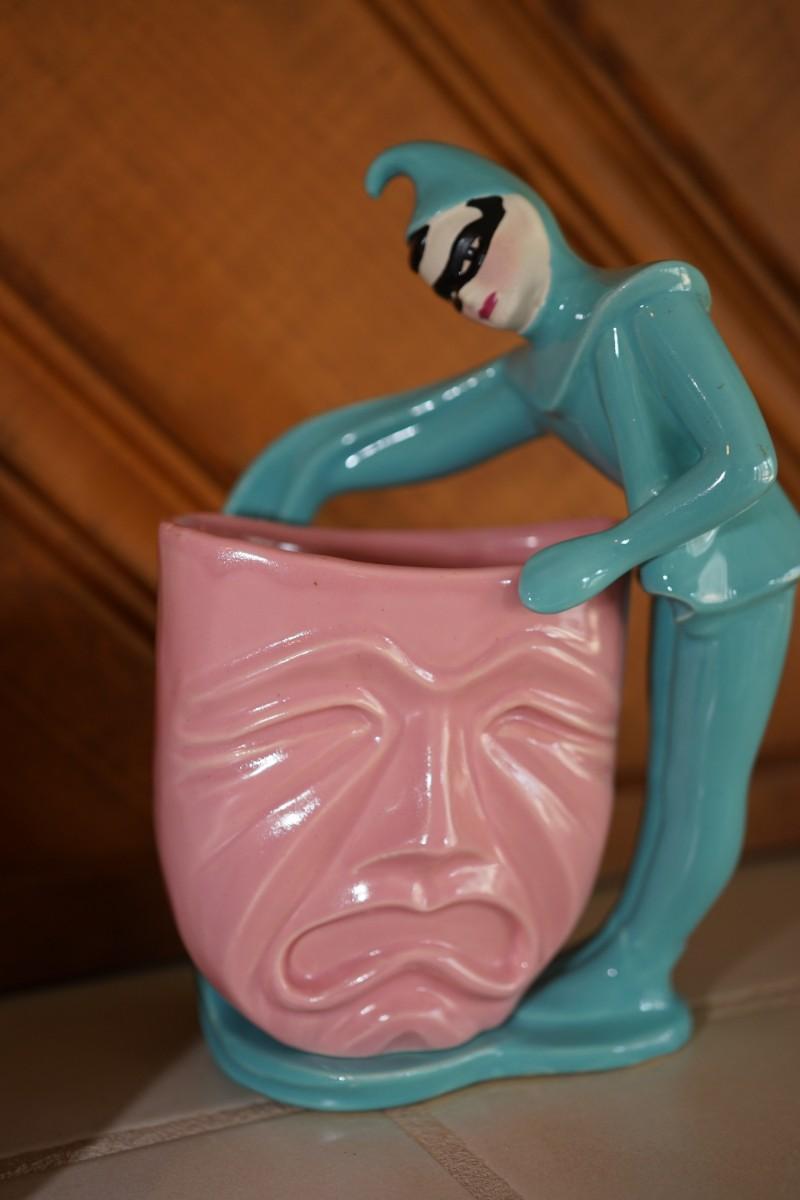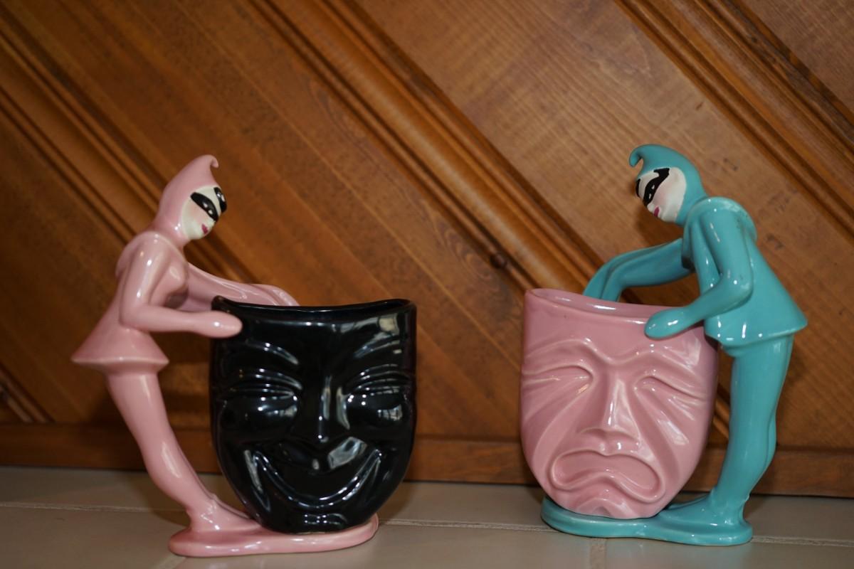 CERAMIC ARTS STUDIO COMEDY AND TRAGEDY ENCORE MAN & ENCORE LADY PINK AND TEAL 8"