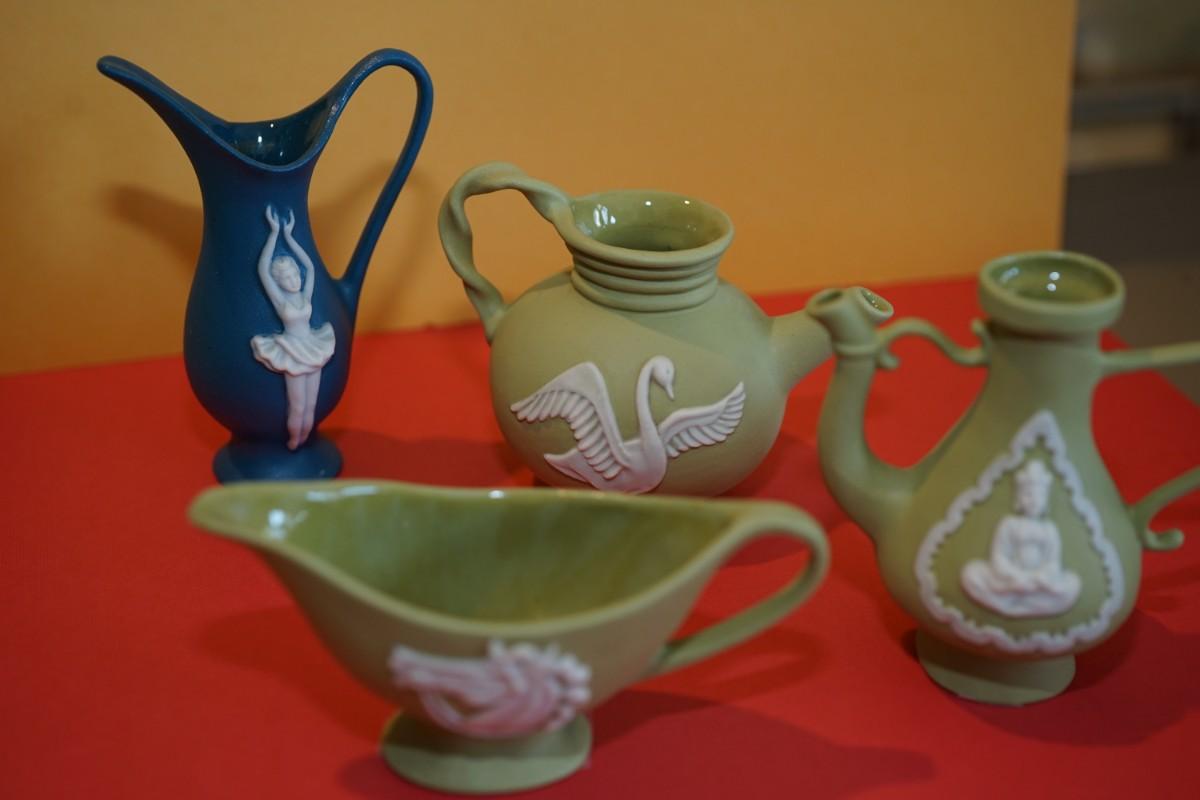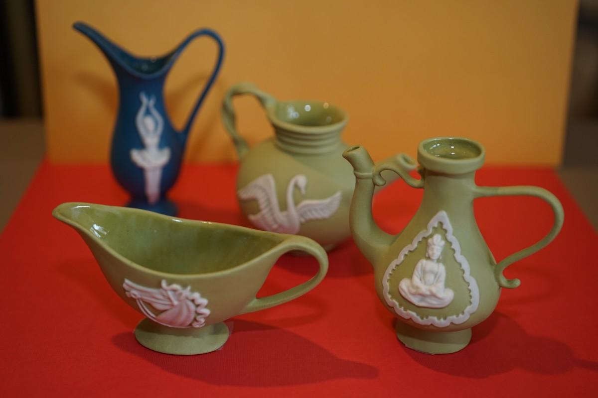 CERAMIC ARTS STUDIO GROUPING OF FOUR 2-4" MINATURE CAMEO STYLE VASES/ JASPERWARE LOOK