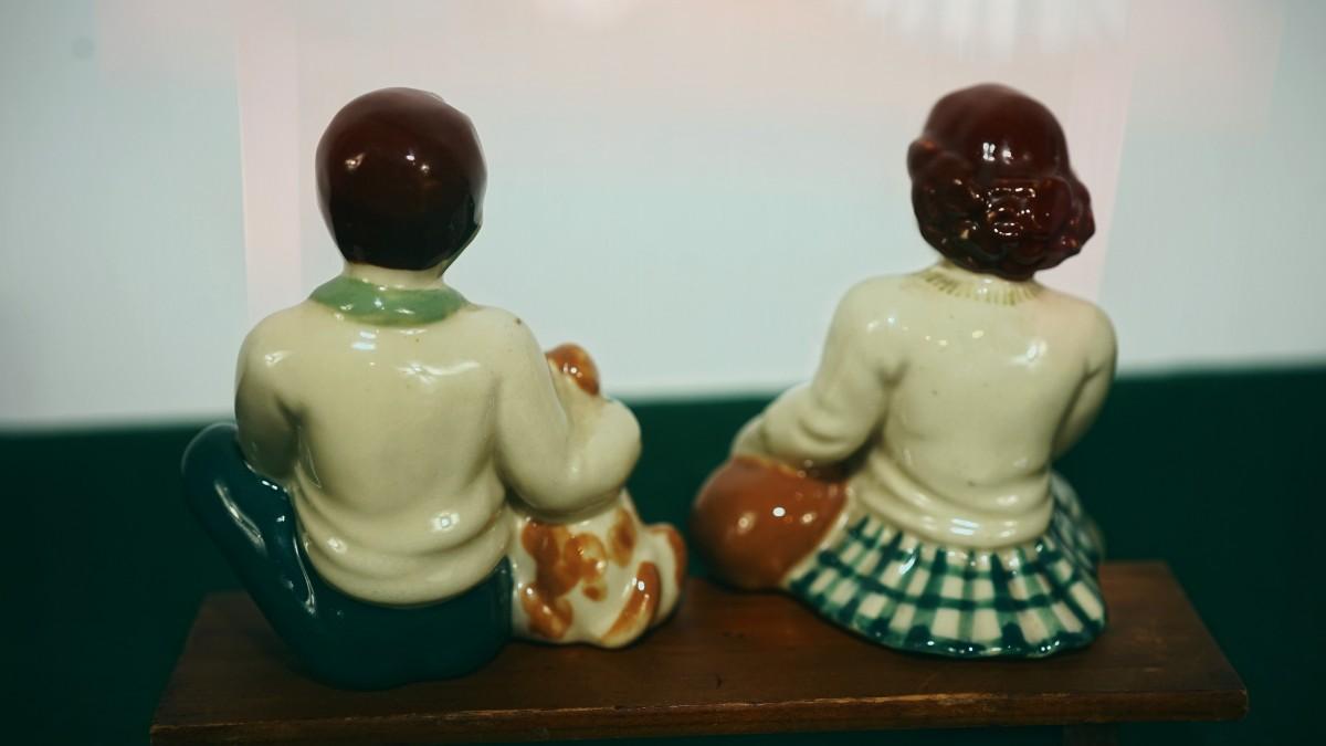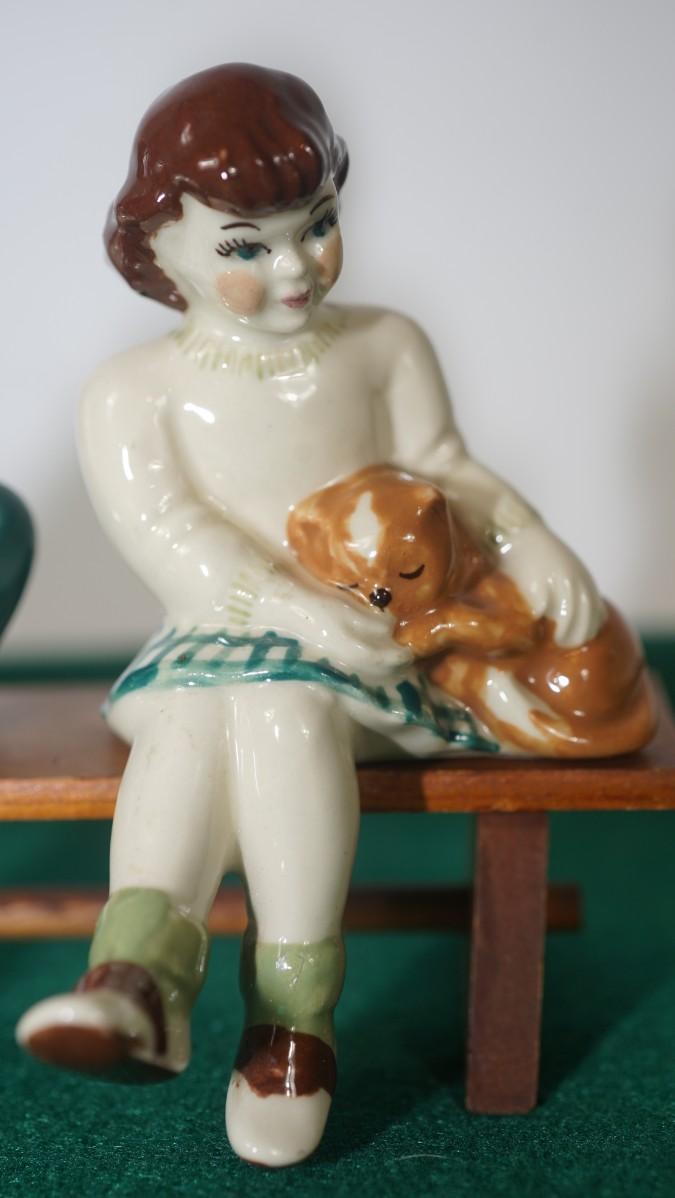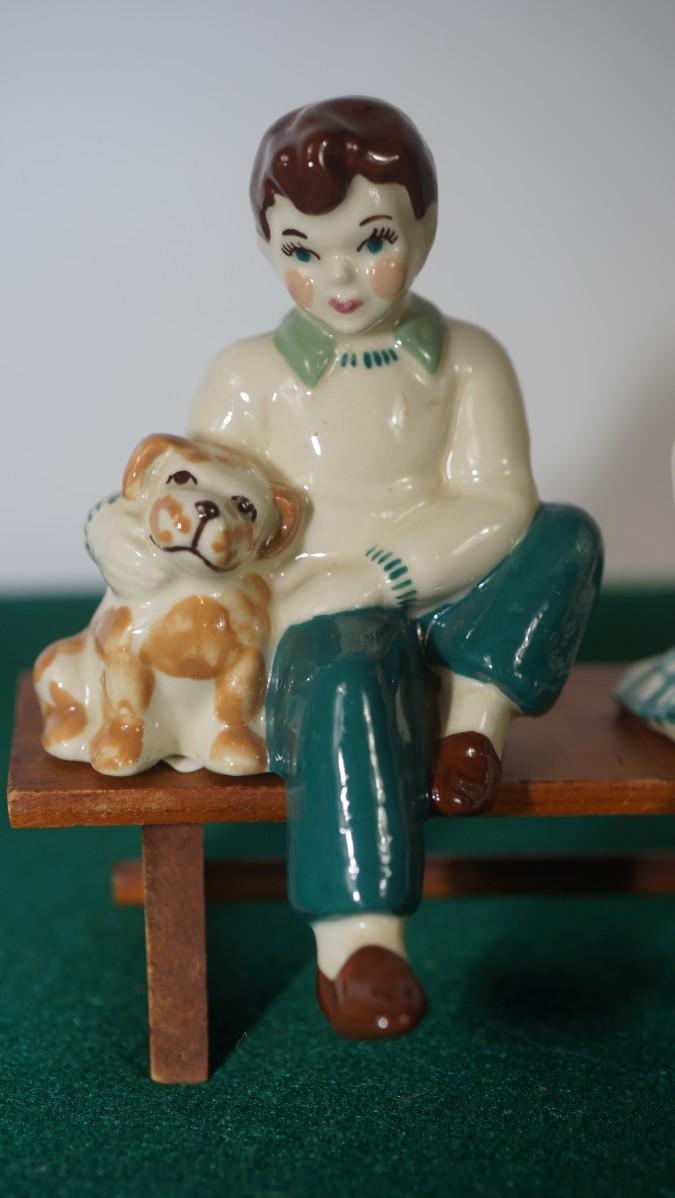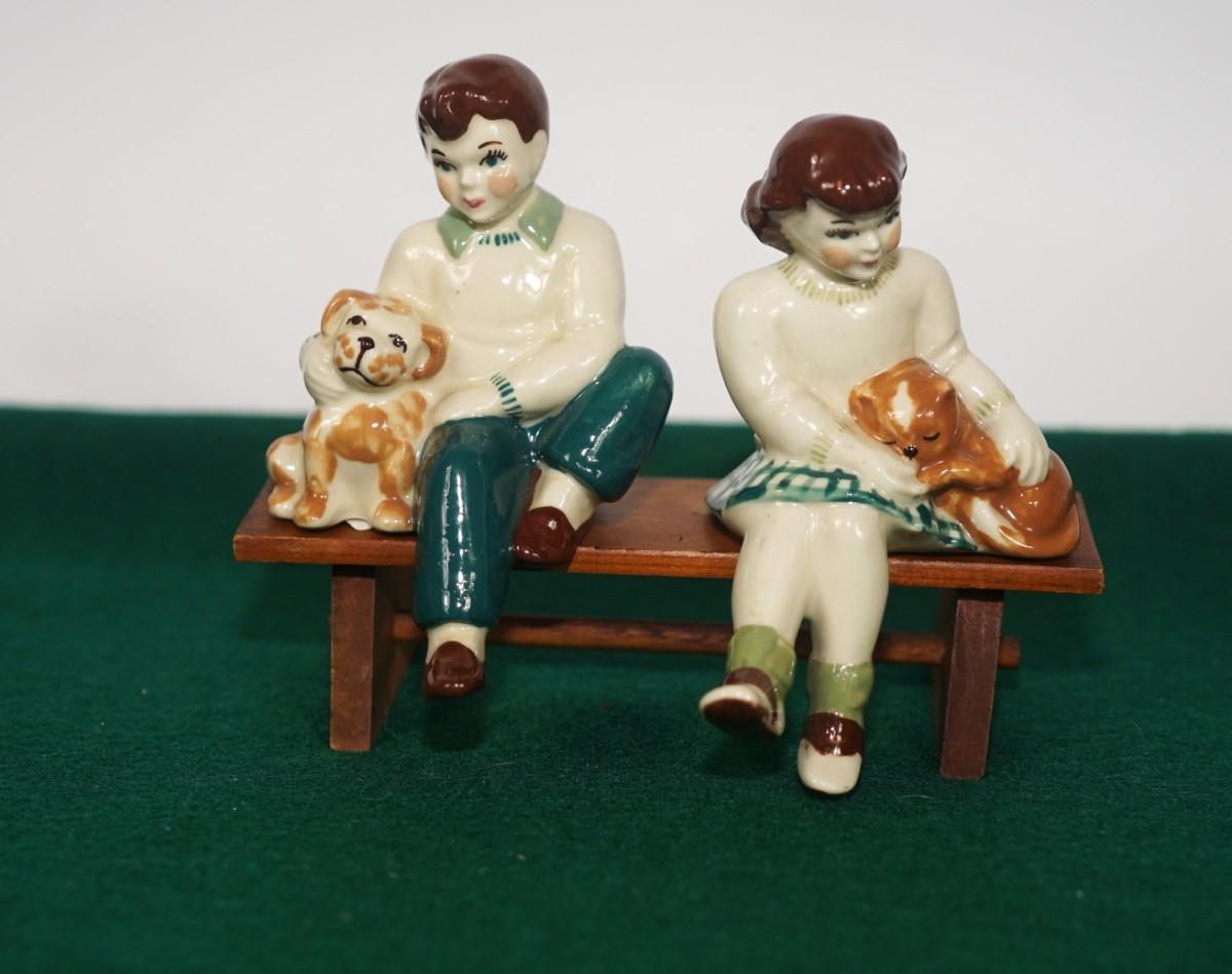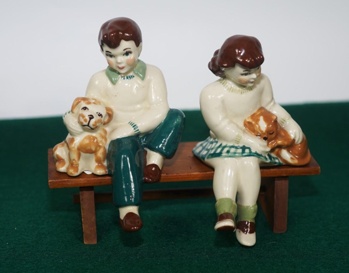CERAMIC ARTS STUDIO - MADISON, WI 1942-1956 BOY ON BENCH W/ DOG & GIRL ON BENCH W/ CAT UNMARKED