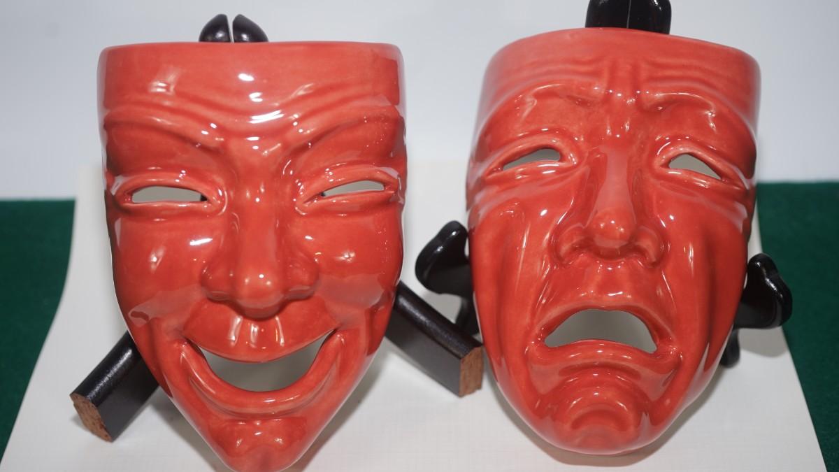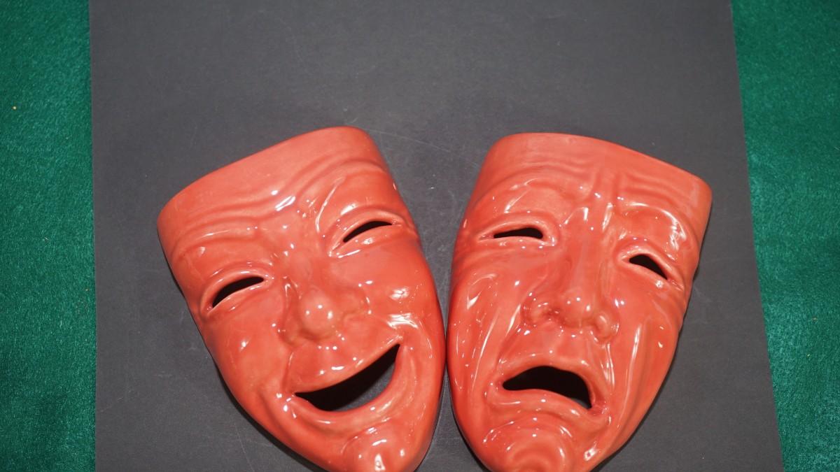 CERAMIC ARTS STUDIO MADISON, WI 1942-1956 COMEDY AND TRAGEDY FACE WALL PLAQUES IN DARK SALMON COLOR