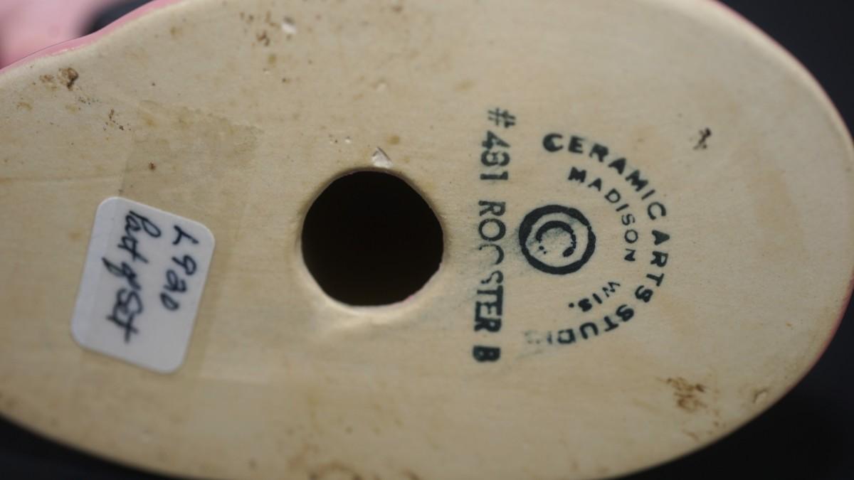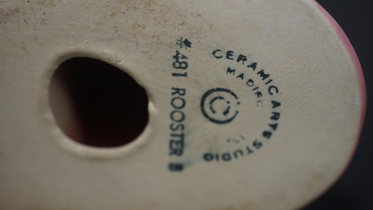 condition: good. on one of the sides of the rooster there is a very small area of roughness to the glaze.( poss. factory flaw) not noticeable but can be felt.
