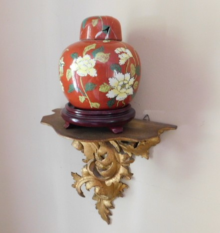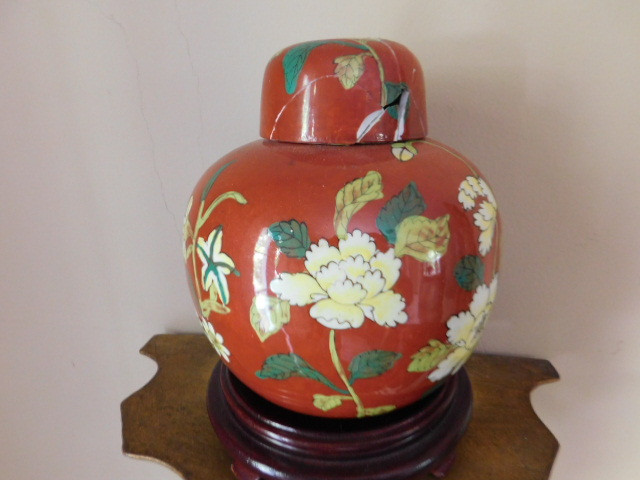 Ceramic Asian Theme Ginger Jar on Rosewood Base