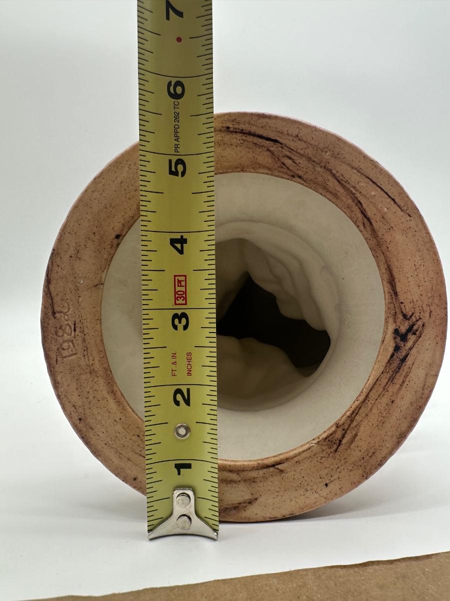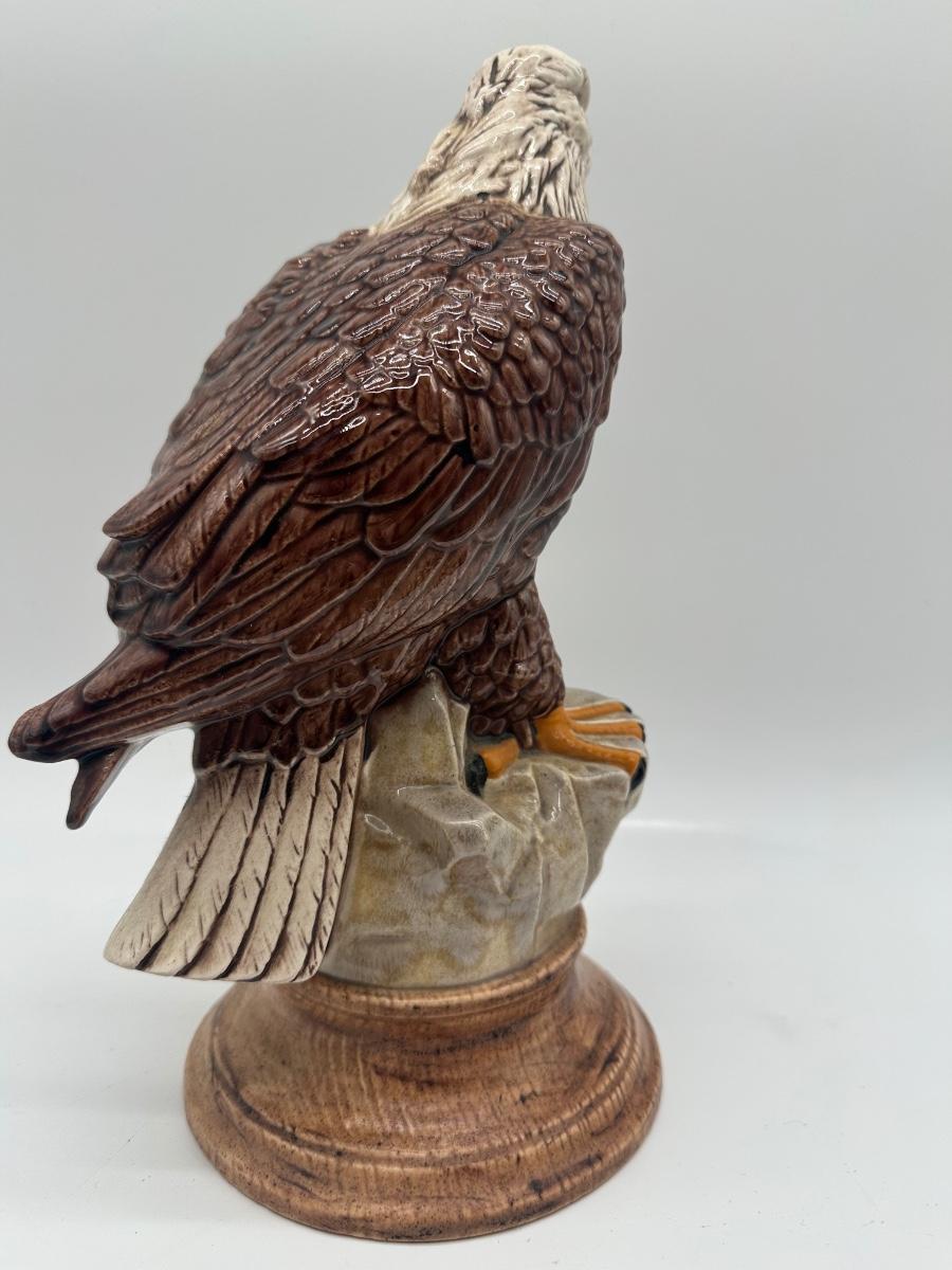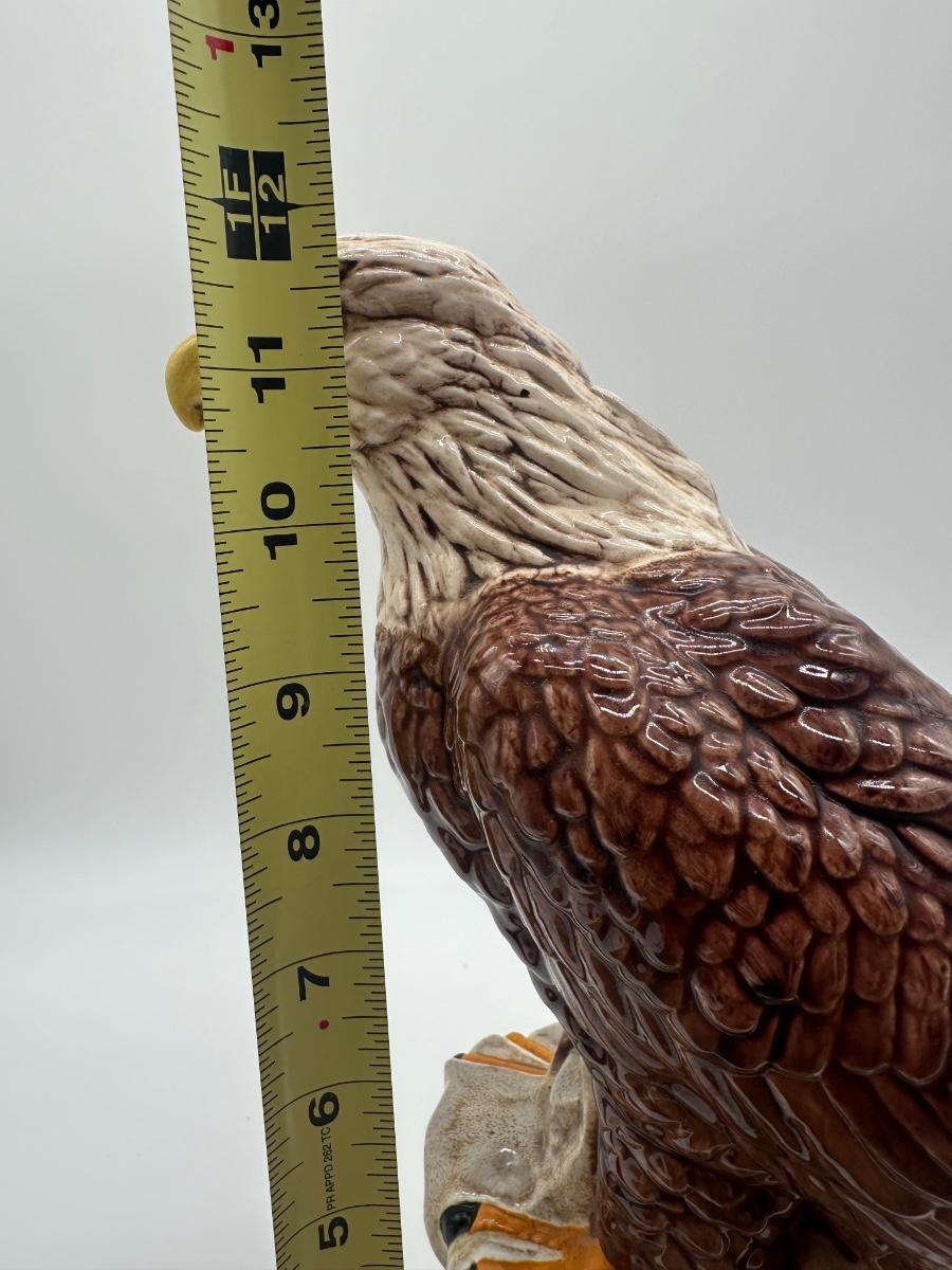 Glazed ceramic bald eagle perched on rock formation with round base. Detailed feather texturing with brown body, white head and tail, and yellow beak and talons. Dated 1982 on underside (see photo).