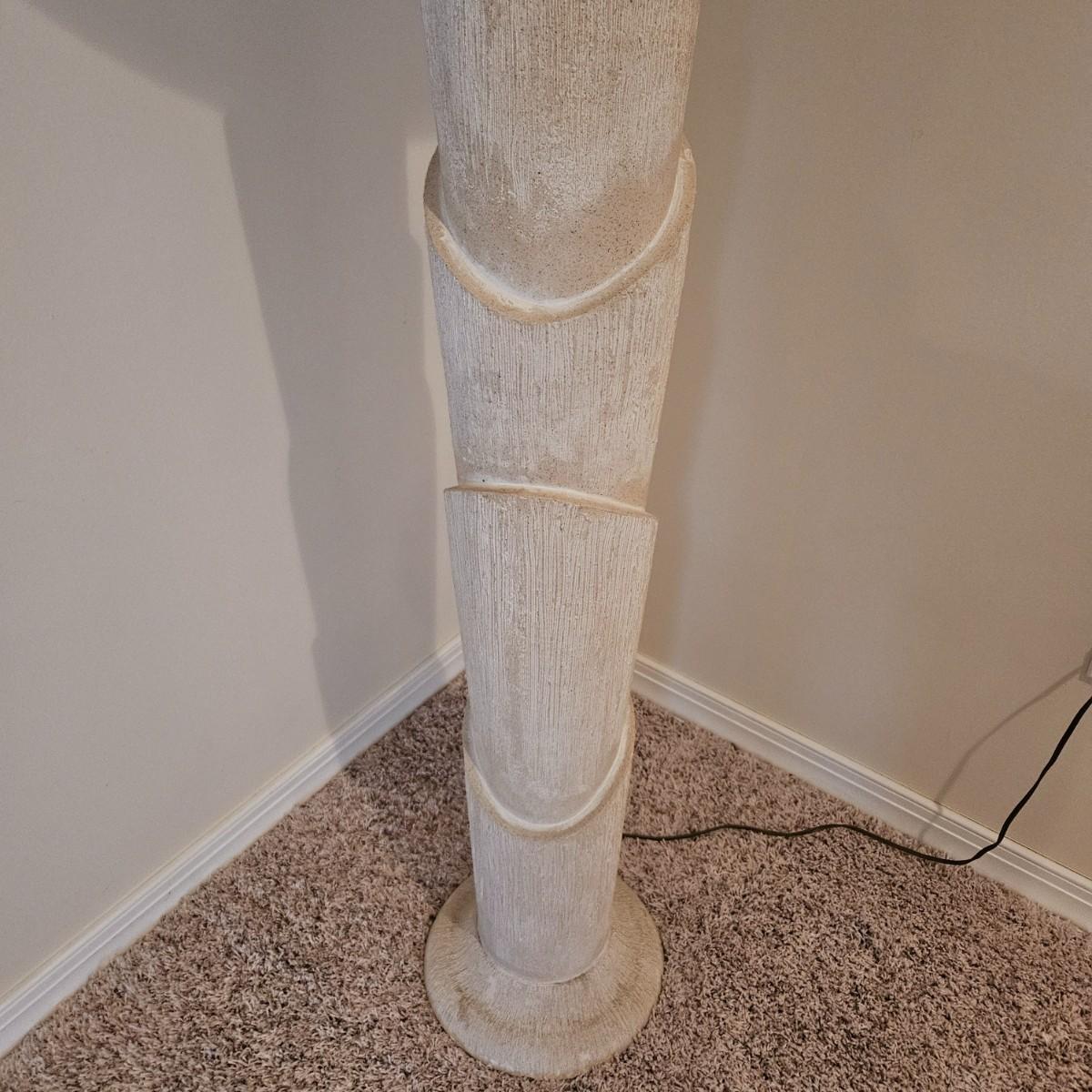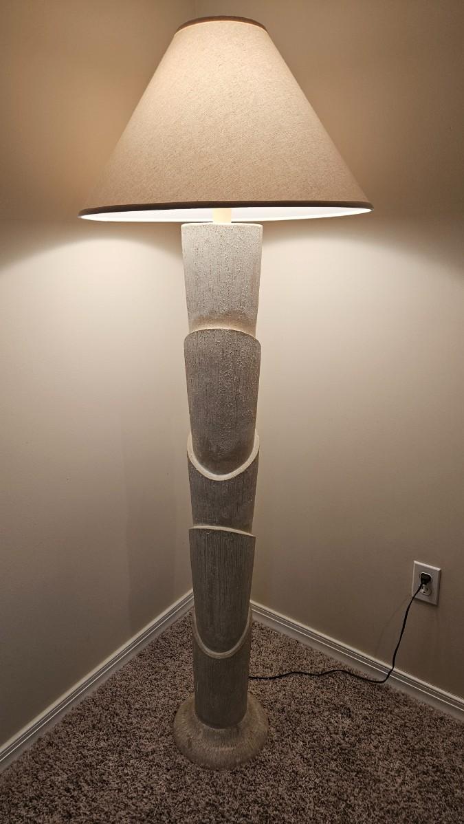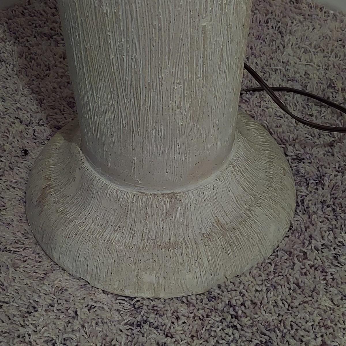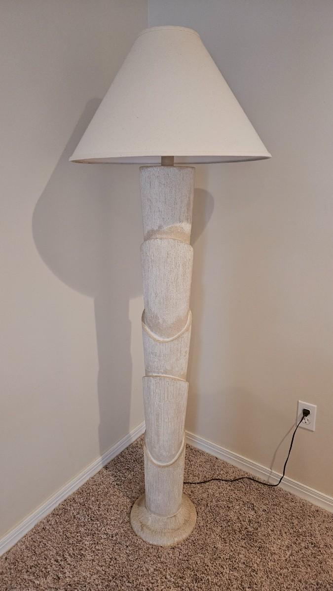 A ceramic floor lamp that has a bananna tree like design for its base. It powered on when plugged in and appears to have a three way switch. It measures approximately 22"D x 67"H including the shade. Some chipping around base. Please see photos for details. Local pickup only