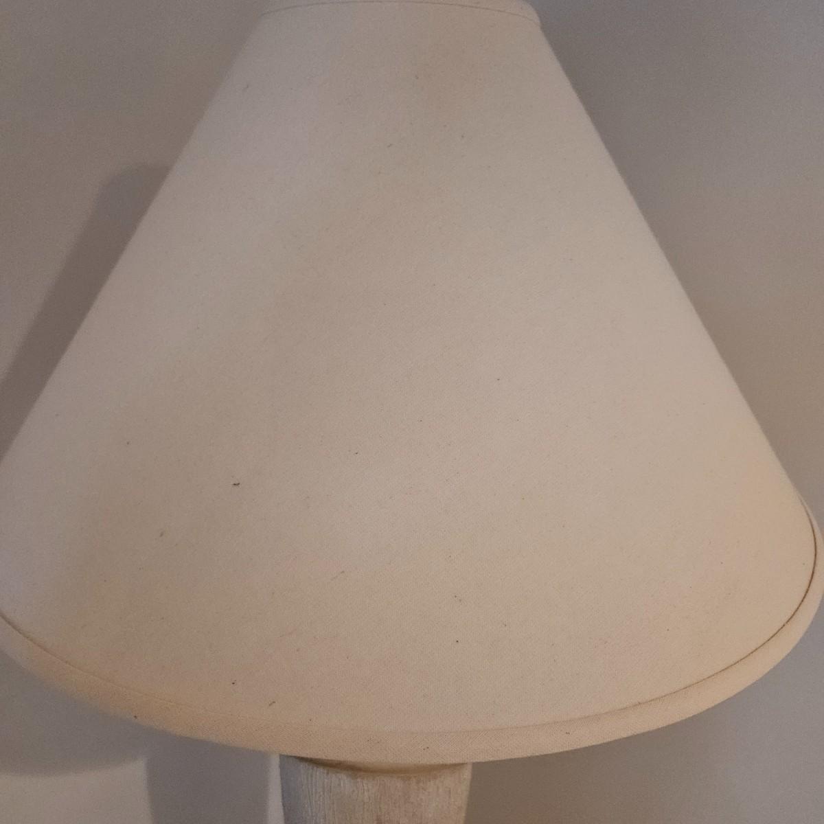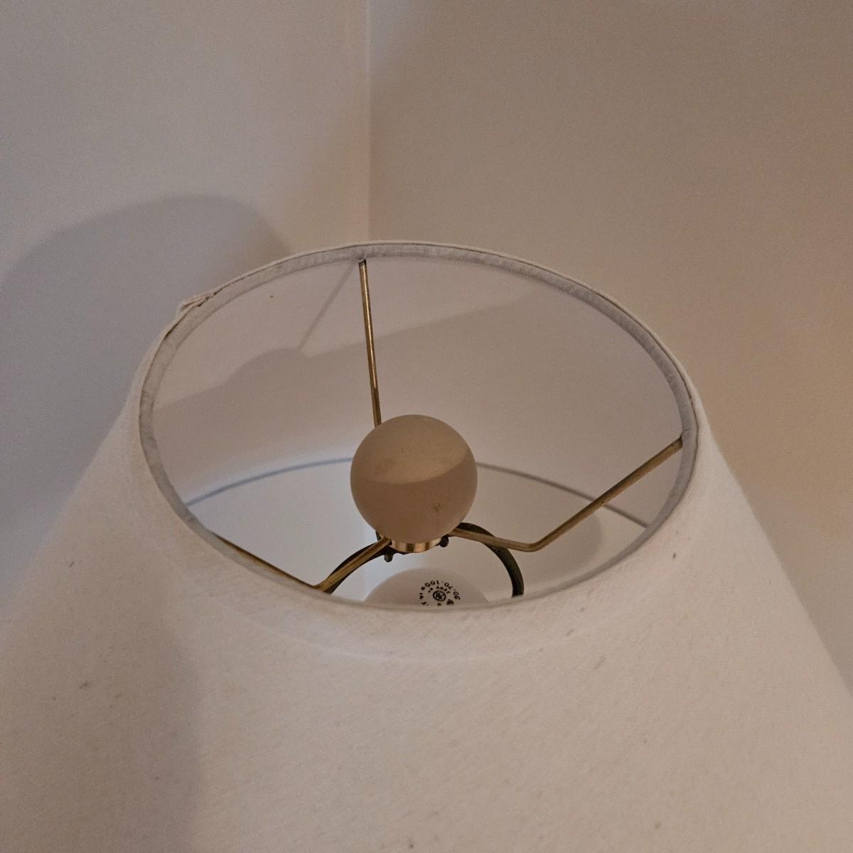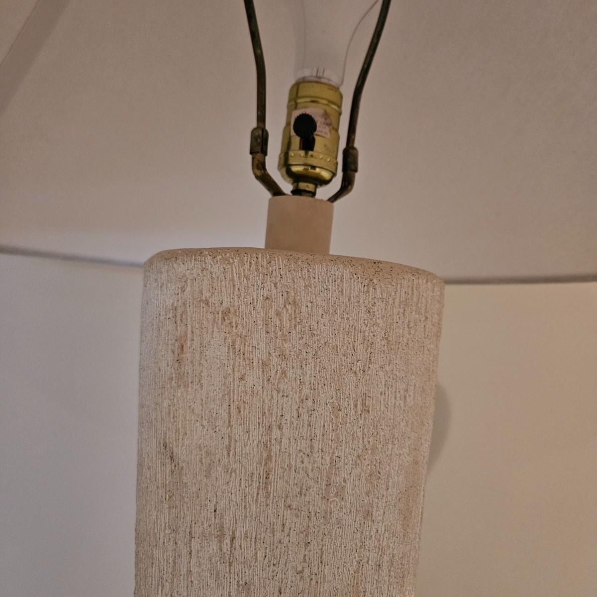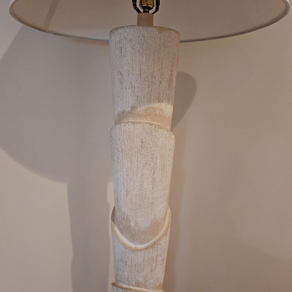 A ceramic floor lamp that has a bananna tree like design for its base. It powered on when plugged in and appears to have a three way switch. It measures approximately 22"D x 67"H including the shade. Some chipping around base. Please see photos for details. Local pickup only