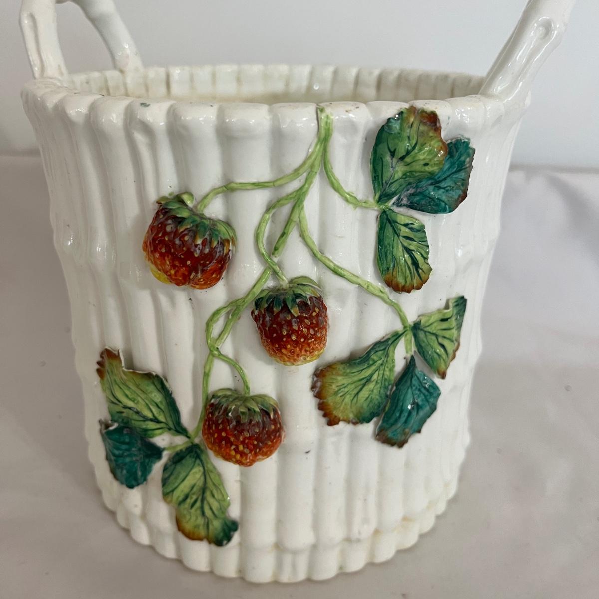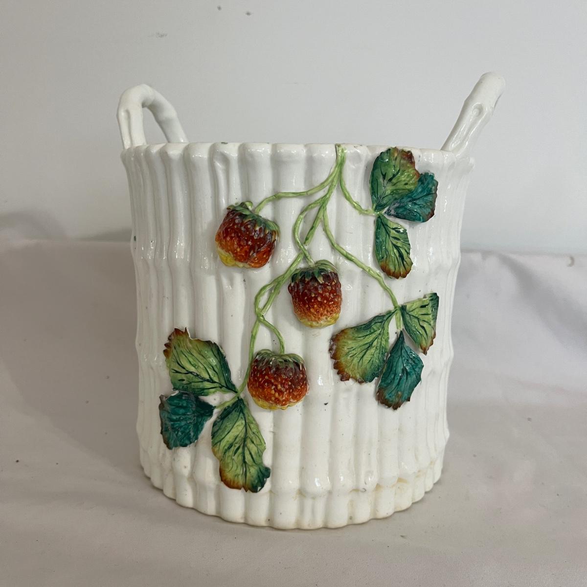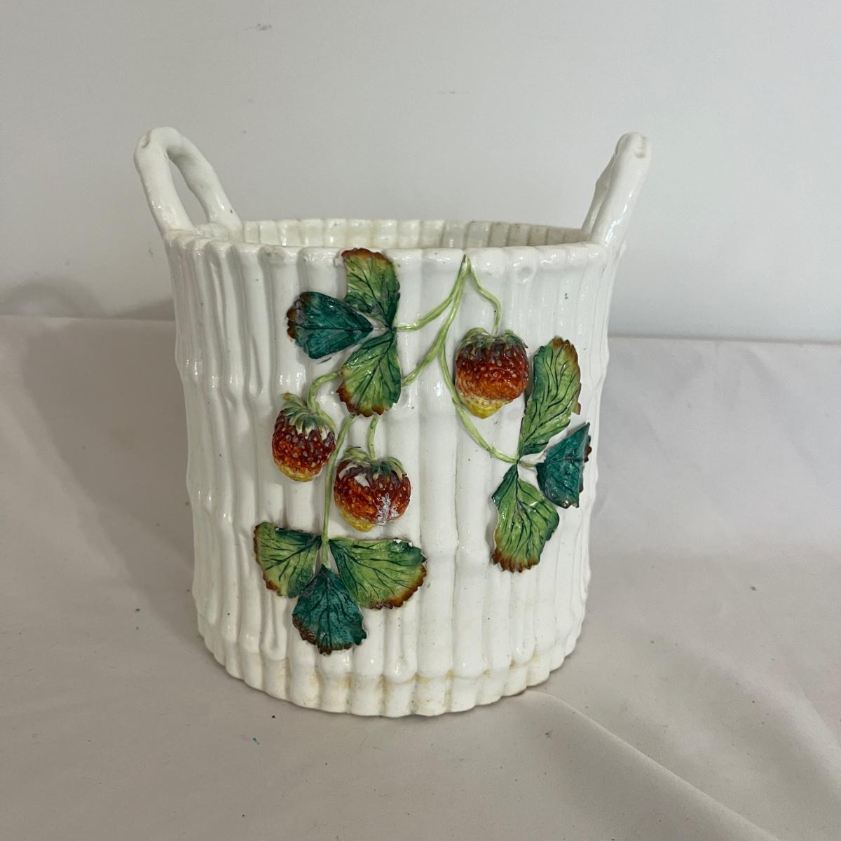 Lot includes a ceramic bamboo basket style canister with a strawberry vine motif that appears to be vintage. Piece measures 7”D x 8”H. One strawberry has chips. Please see pictures.