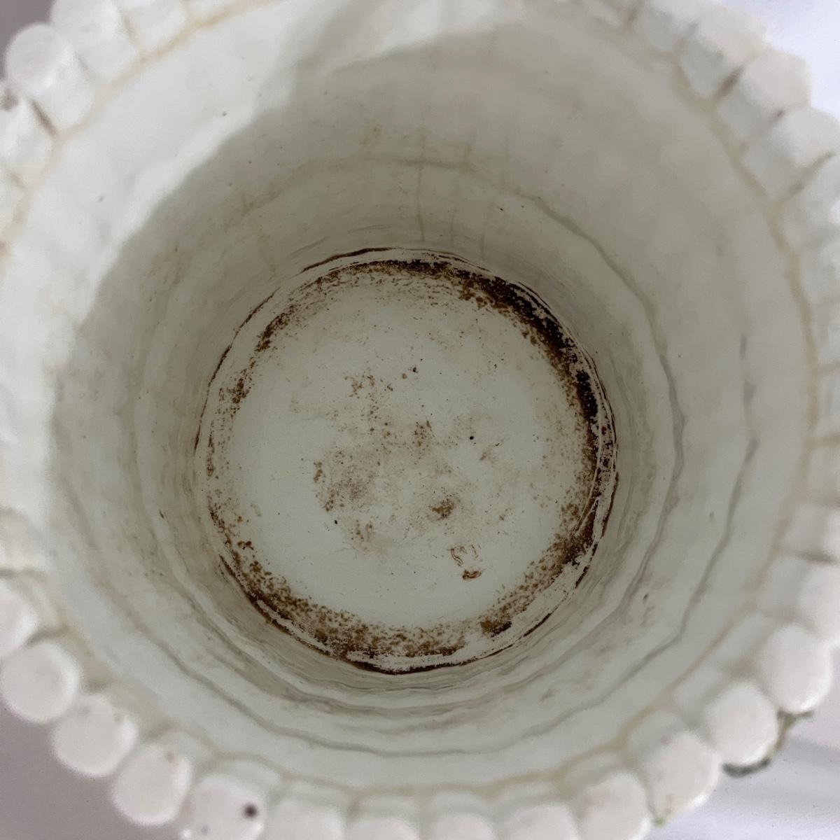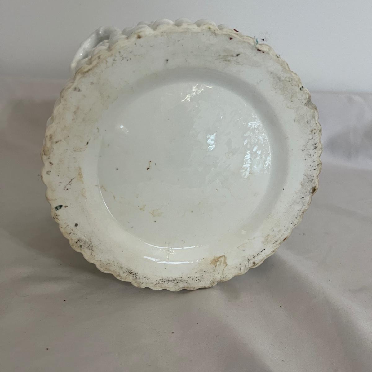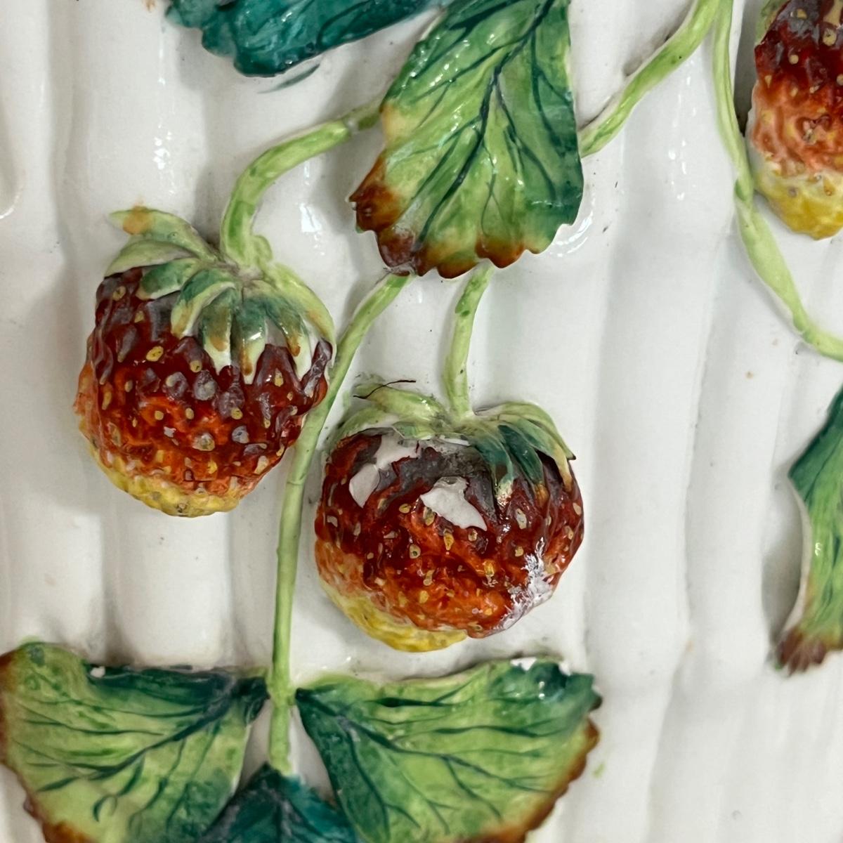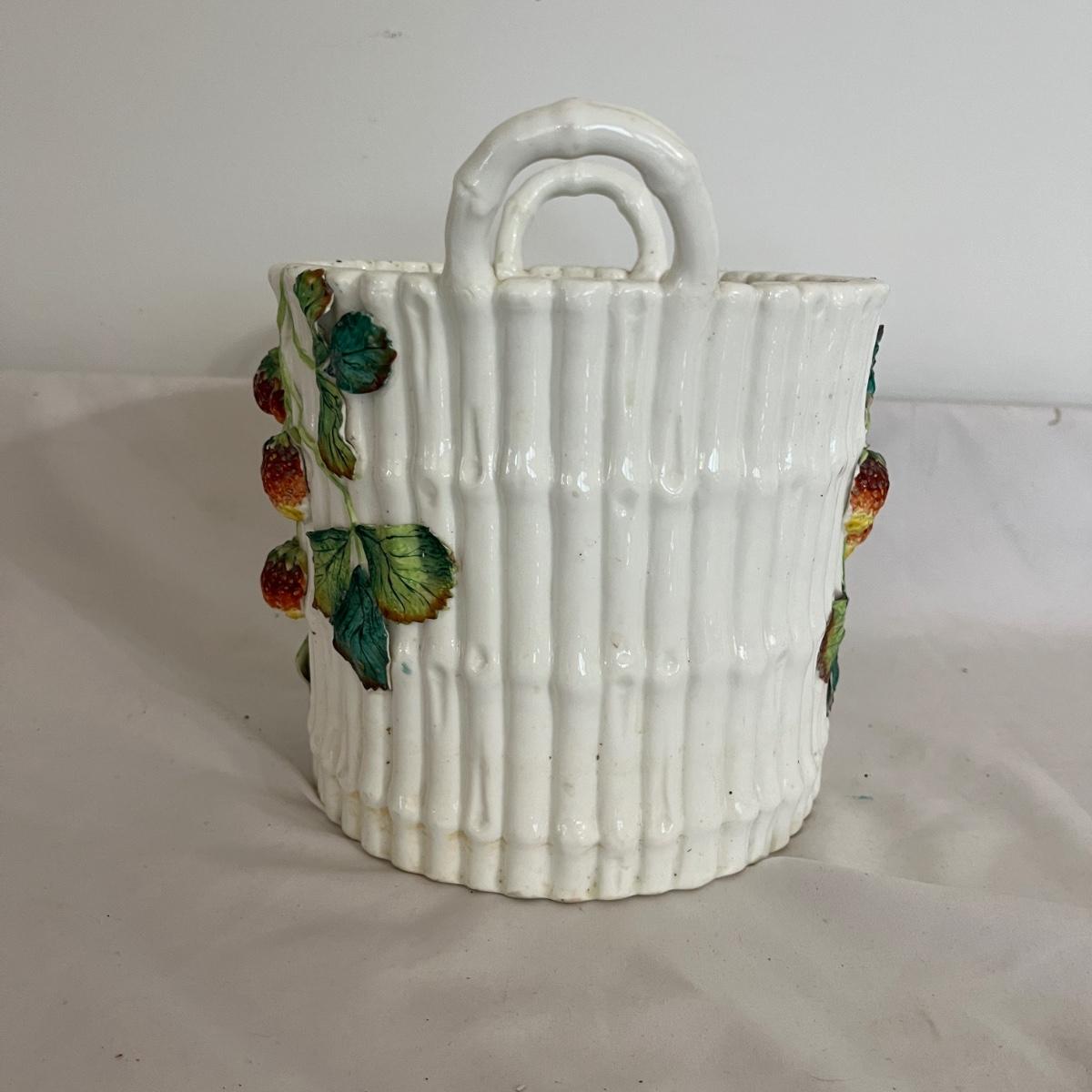 Lot includes a ceramic bamboo basket style canister with a strawberry vine motif that appears to be vintage. Piece measures 7”D x 8”H. One strawberry has chips. Please see pictures.