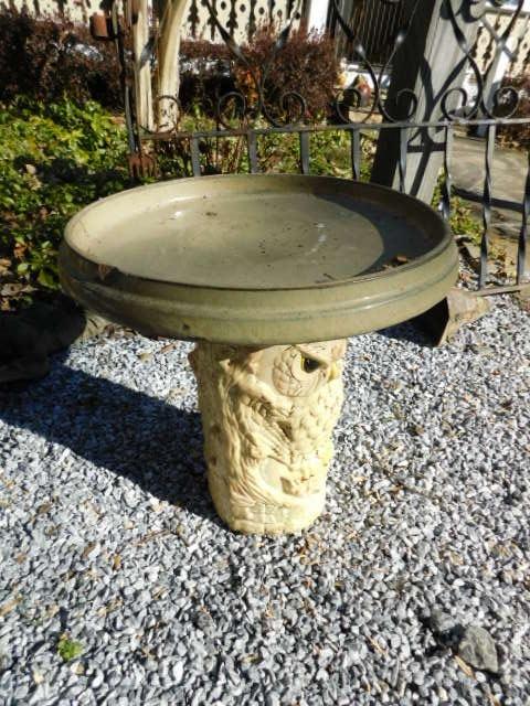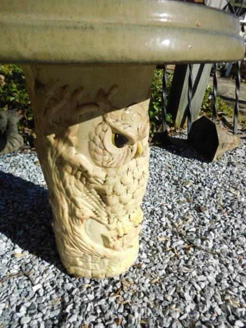 Ceramic Bird Bath with Potter Owl Themed Base . the base is cracked and has a piece missing at the top.