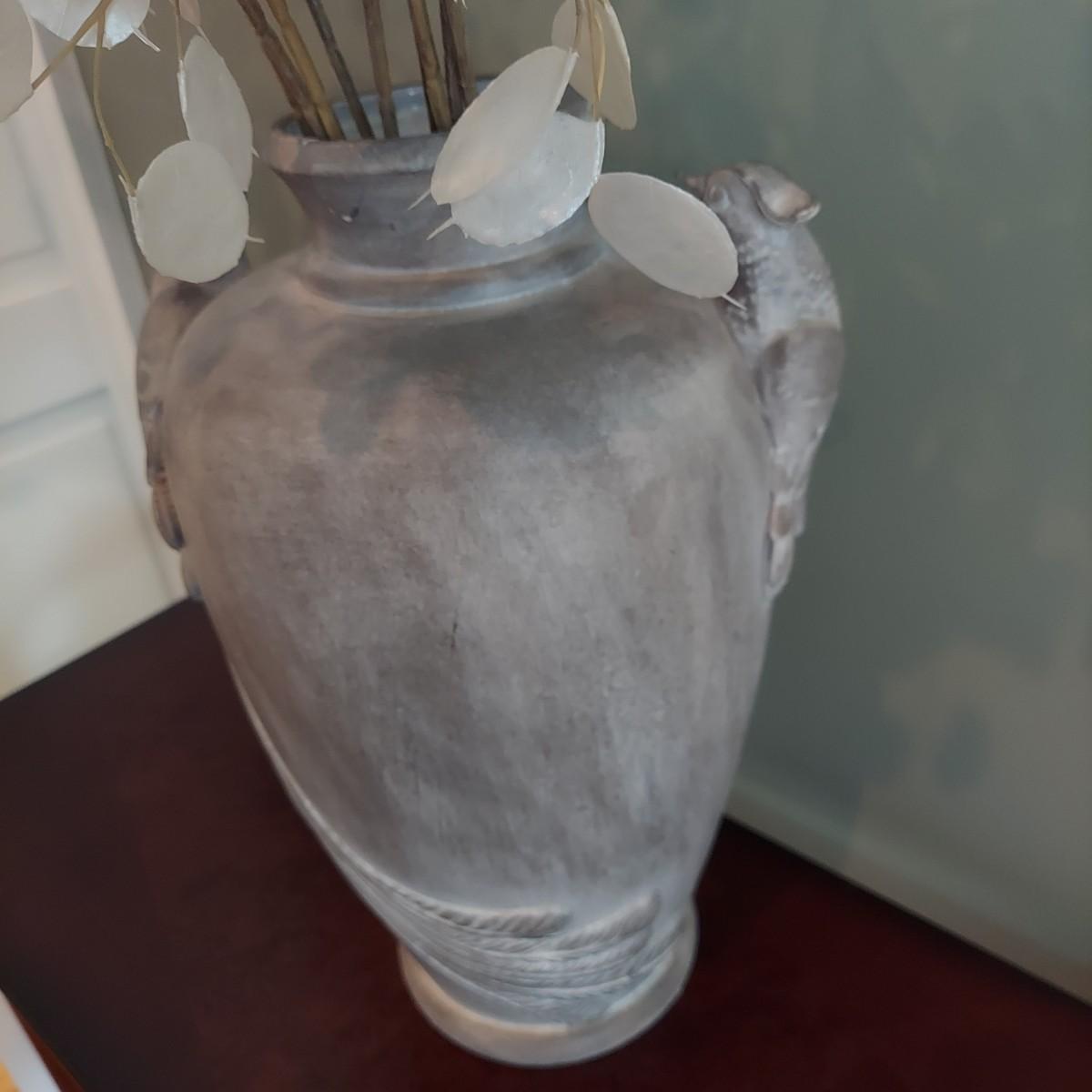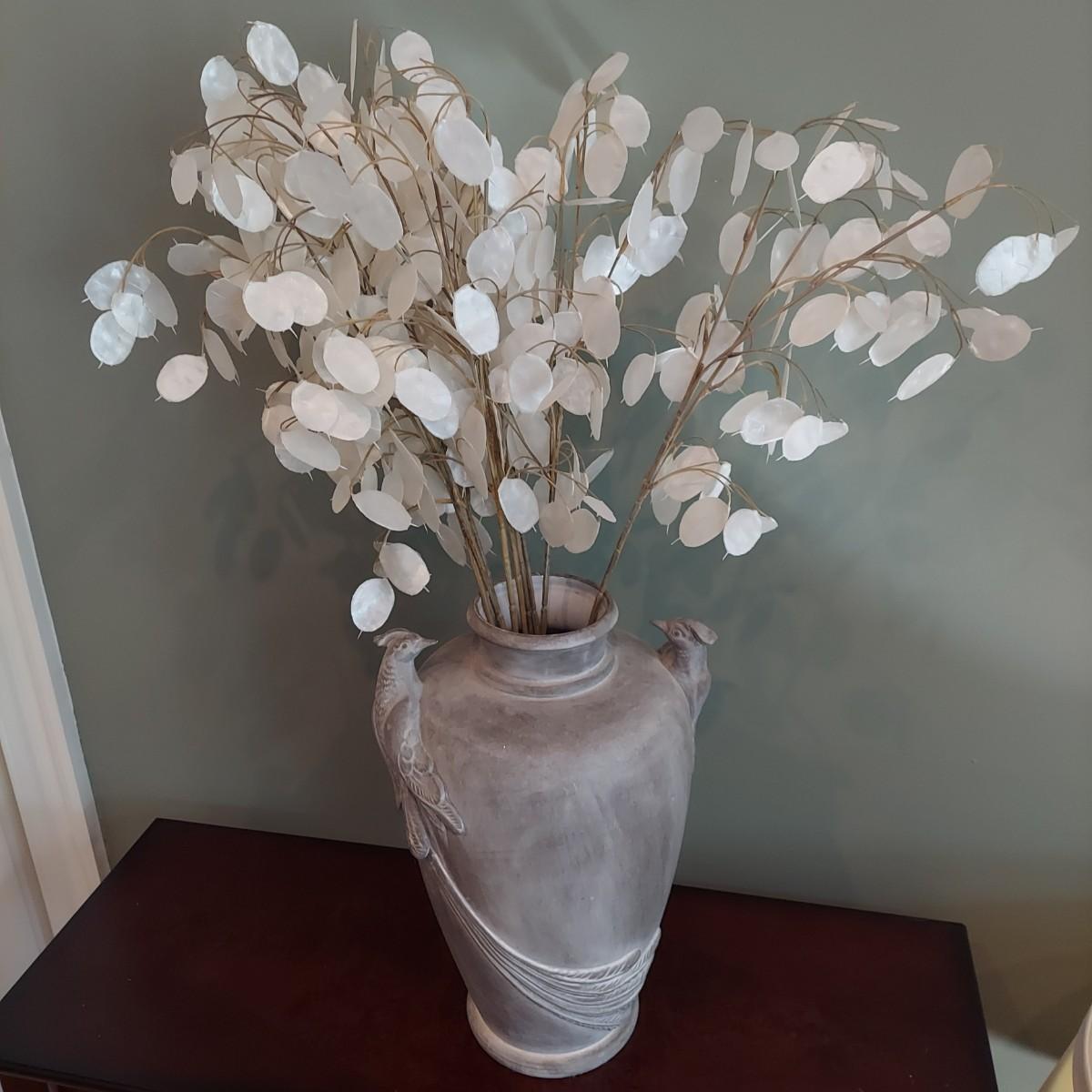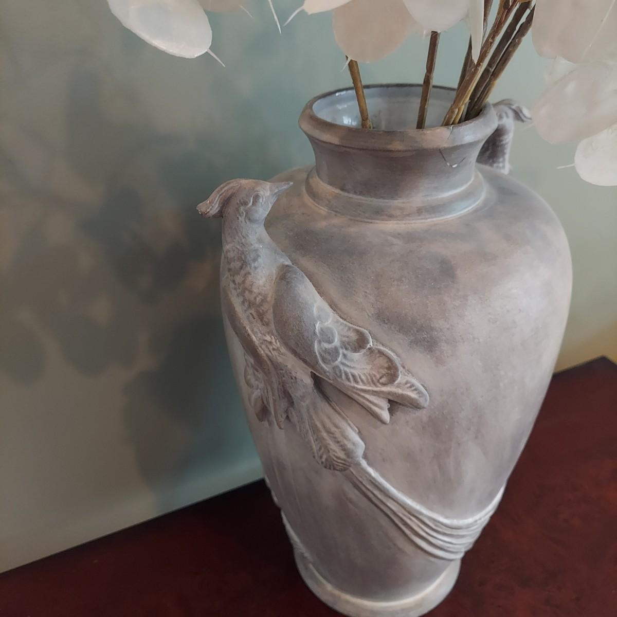 Large ceramic vase with decorative bird accents and cement style finish. Vase is filled with faux lunaria/silver dollar plant. The vase is 15"H alone and 30"H with plants. Please see photos for details. Local Pickup Only