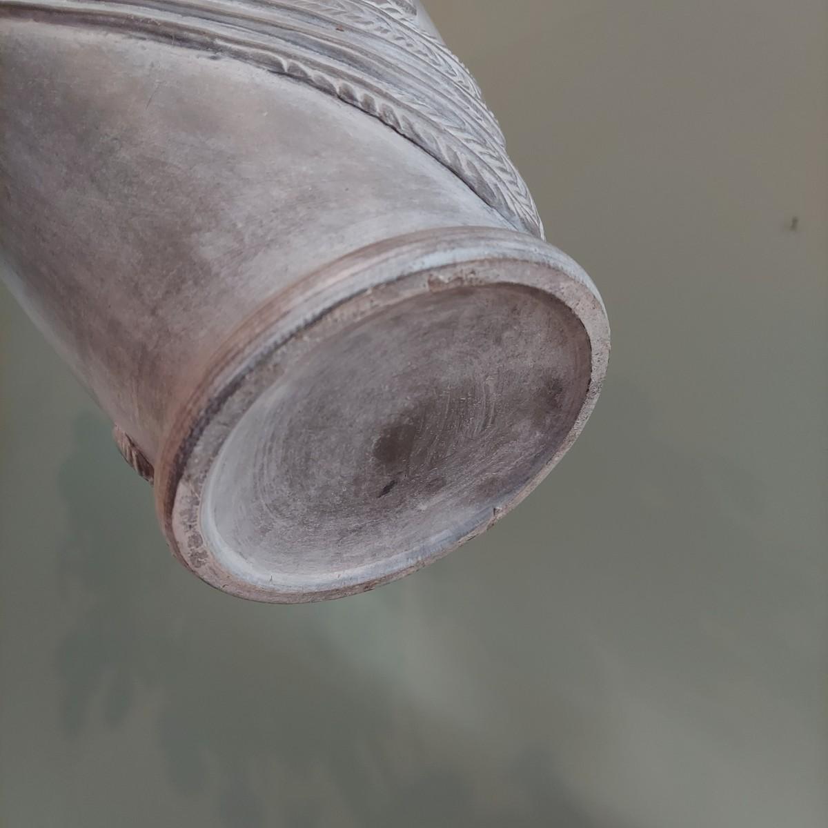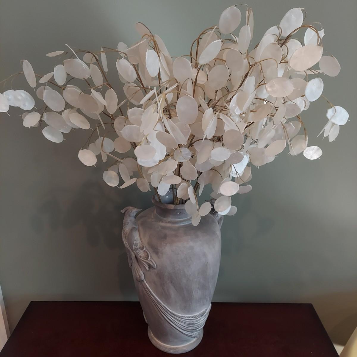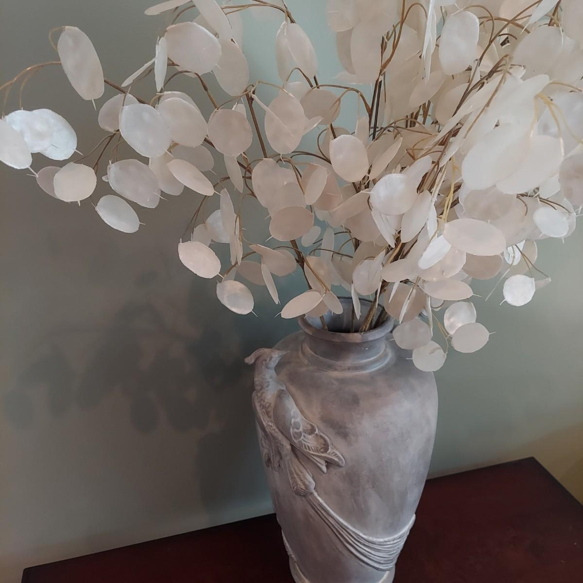 Large ceramic vase with decorative bird accents and cement style finish. Vase is filled with faux lunaria/silver dollar plant. The vase is 15"H alone and 30"H with plants. Please see photos for details. Local Pickup Only