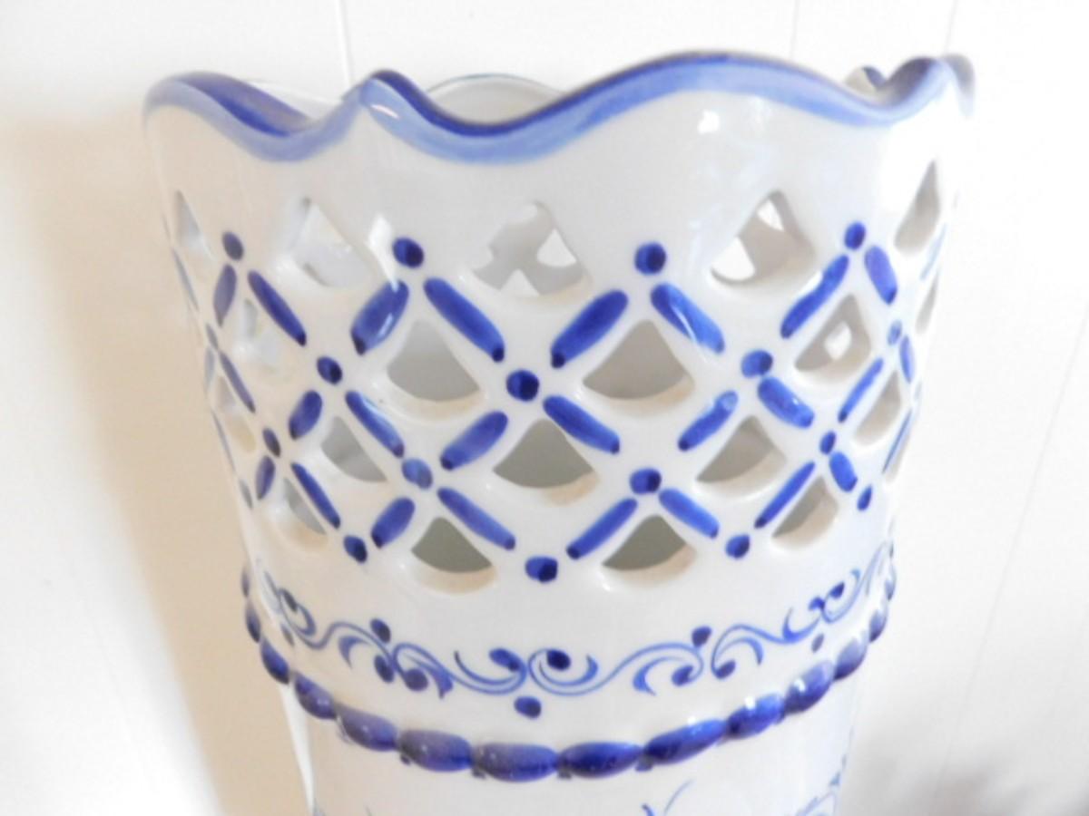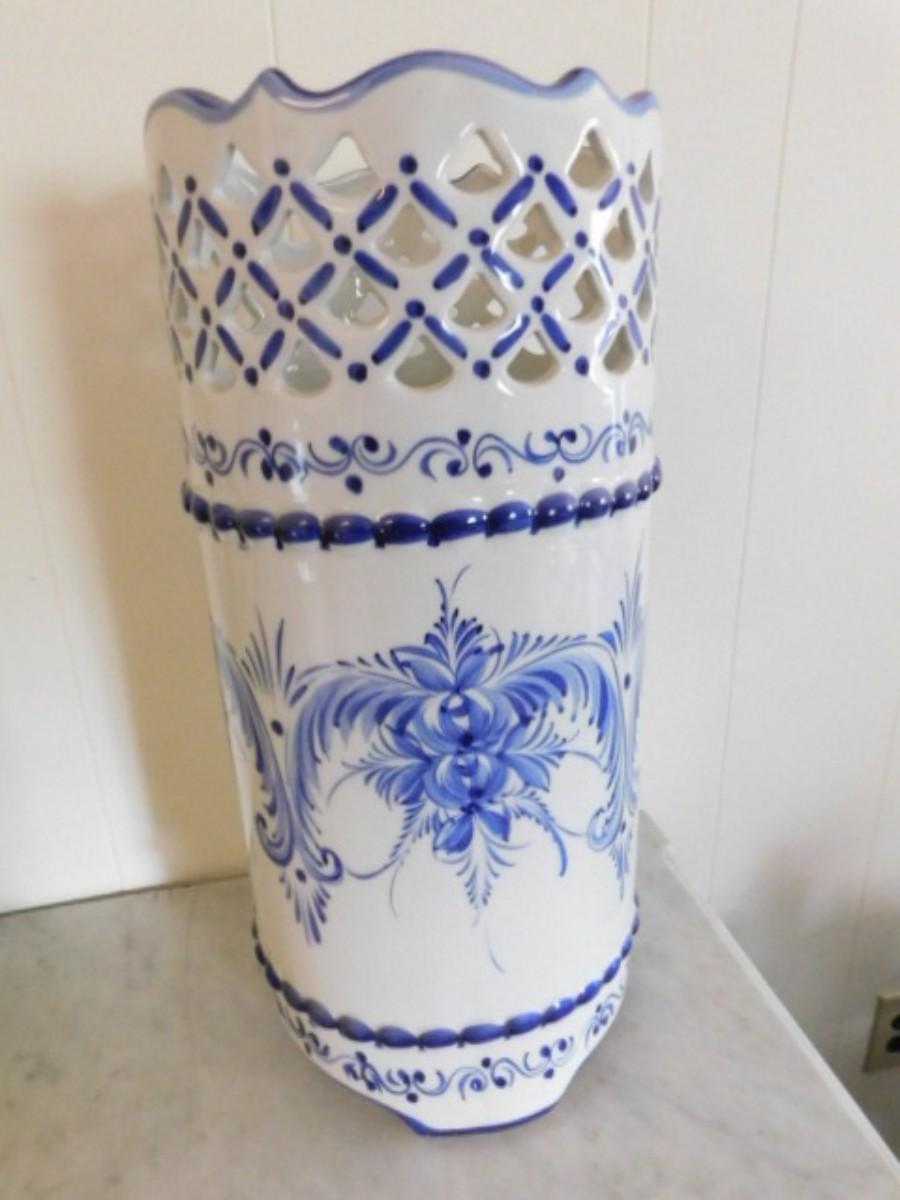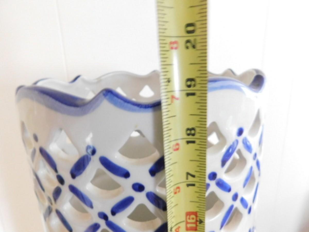 Ceramic Blue and White Umbrella Stand with Pierced Edge