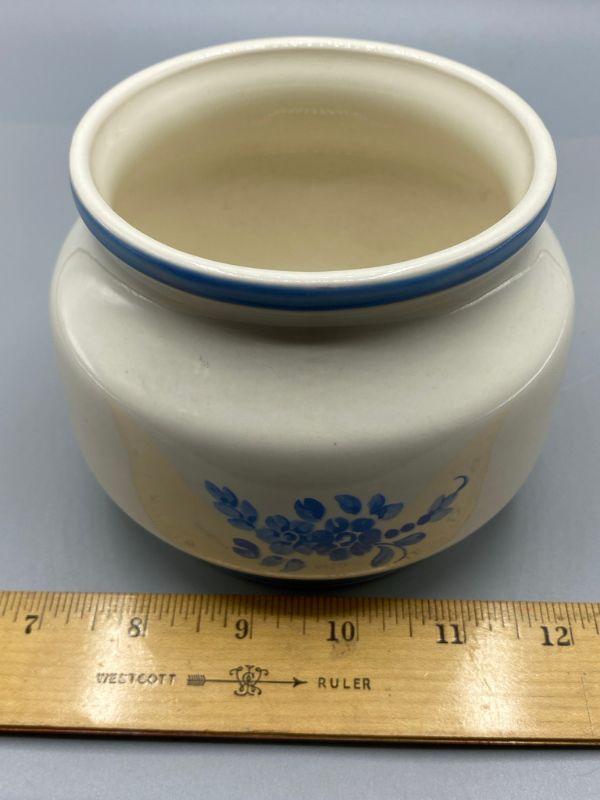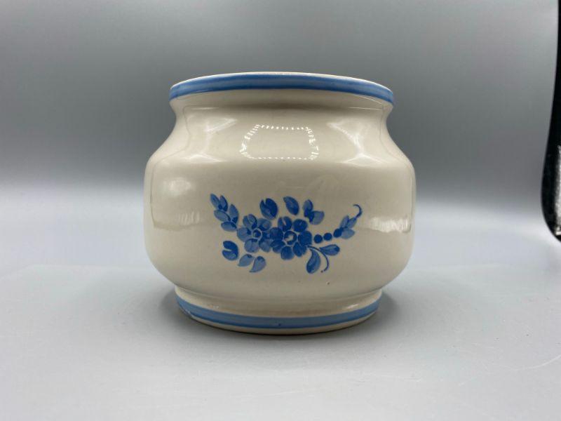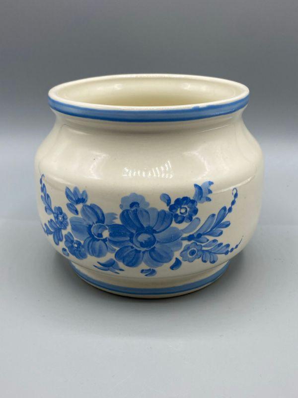 Vintage ceramic dish. Blue flower pattern with blue trim. Mark on the bottom, but can not make it out. No lid, looks like it should of had one though. Displays nicely. About 4" tall and 5" wide.