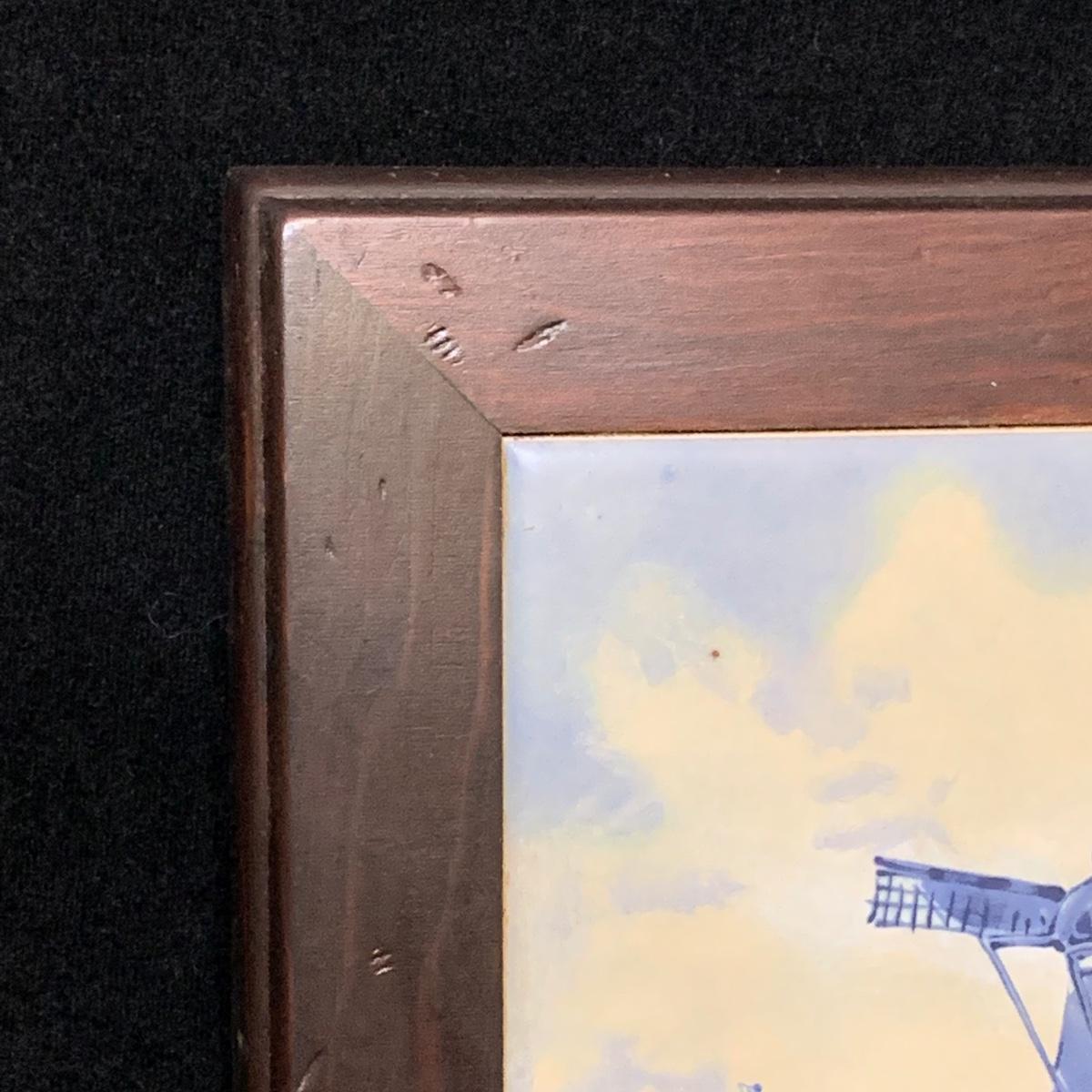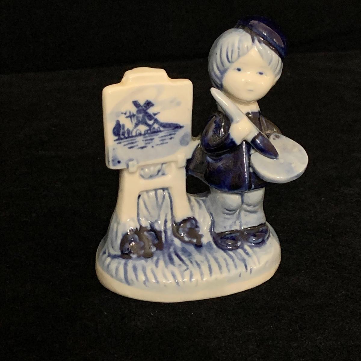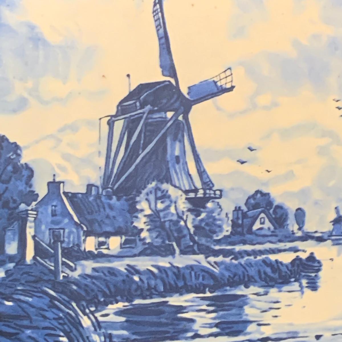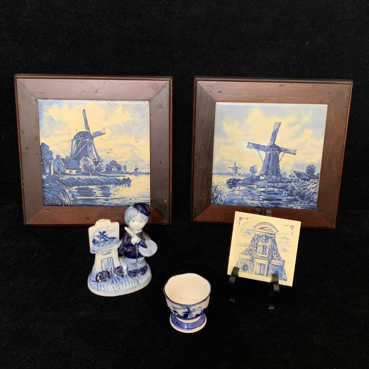 Five ceramic blue and white Dutch-made and/or themed items. Two wood-framed tile trivets featuring windmills, a figurine of a child painting windmills, a small porcelain Elesva Holland cup, and a small tile featuring a 17th century heightened neck Dutch gable. The trivets each measure 9”sq. All items are in good condition. The marking on the bottom of the child figurine is blurry and illegible.