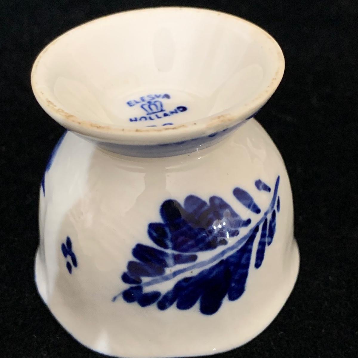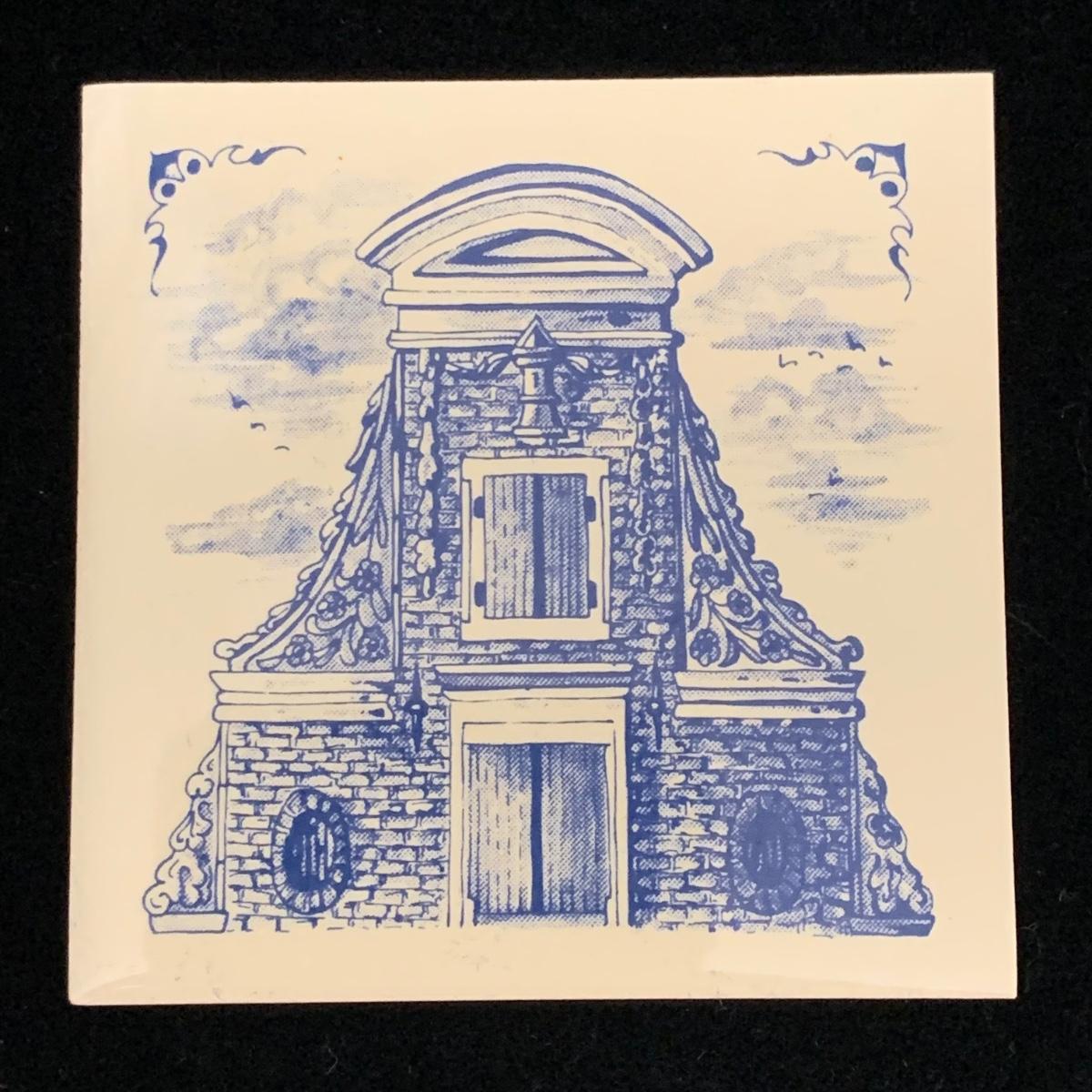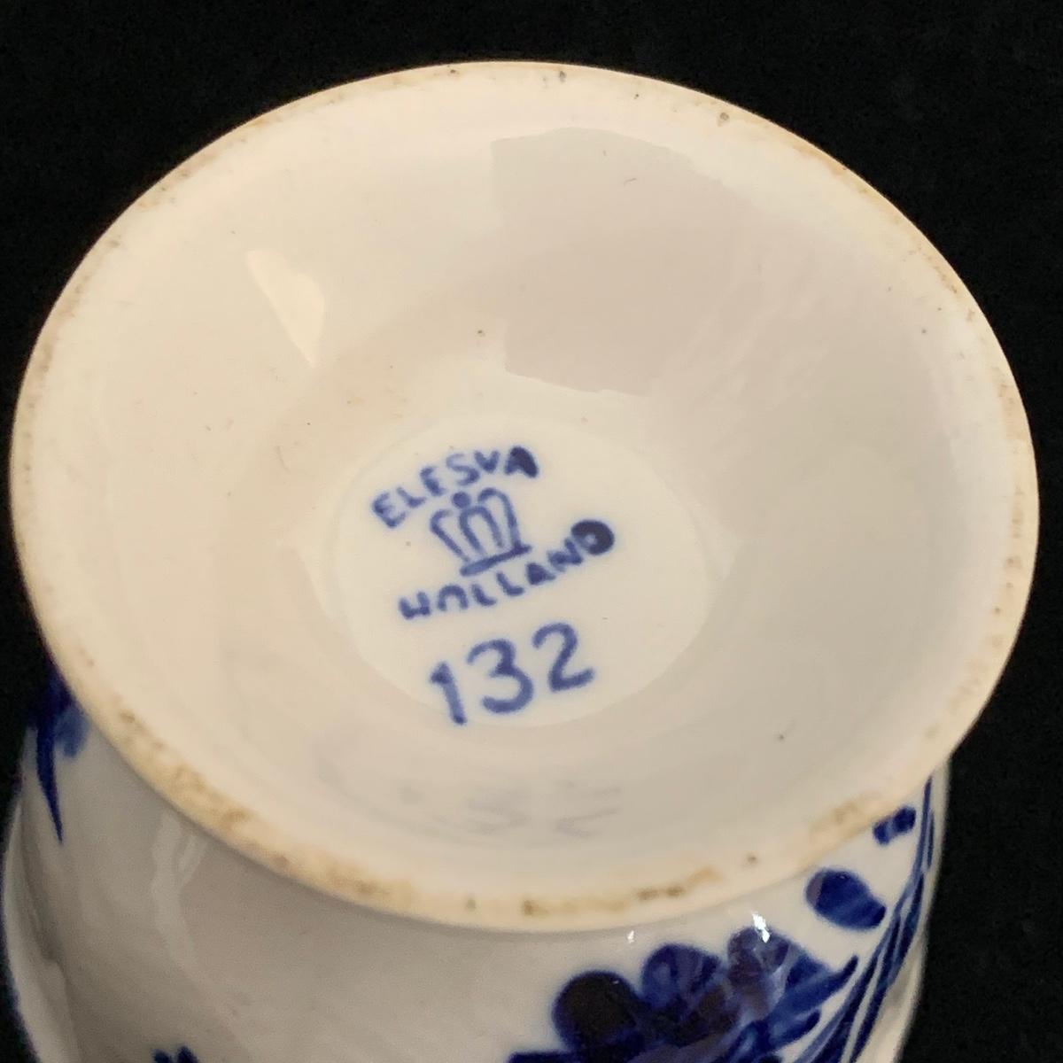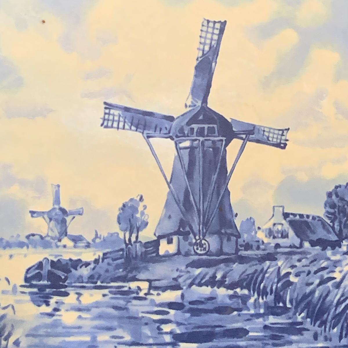 Five ceramic blue and white Dutch-made and/or themed items. Two wood-framed tile trivets featuring windmills, a figurine of a child painting windmills, a small porcelain Elesva Holland cup, and a small tile featuring a 17th century heightened neck Dutch gable. The trivets each measure 9”sq. All items are in good condition. The marking on the bottom of the child figurine is blurry and illegible.