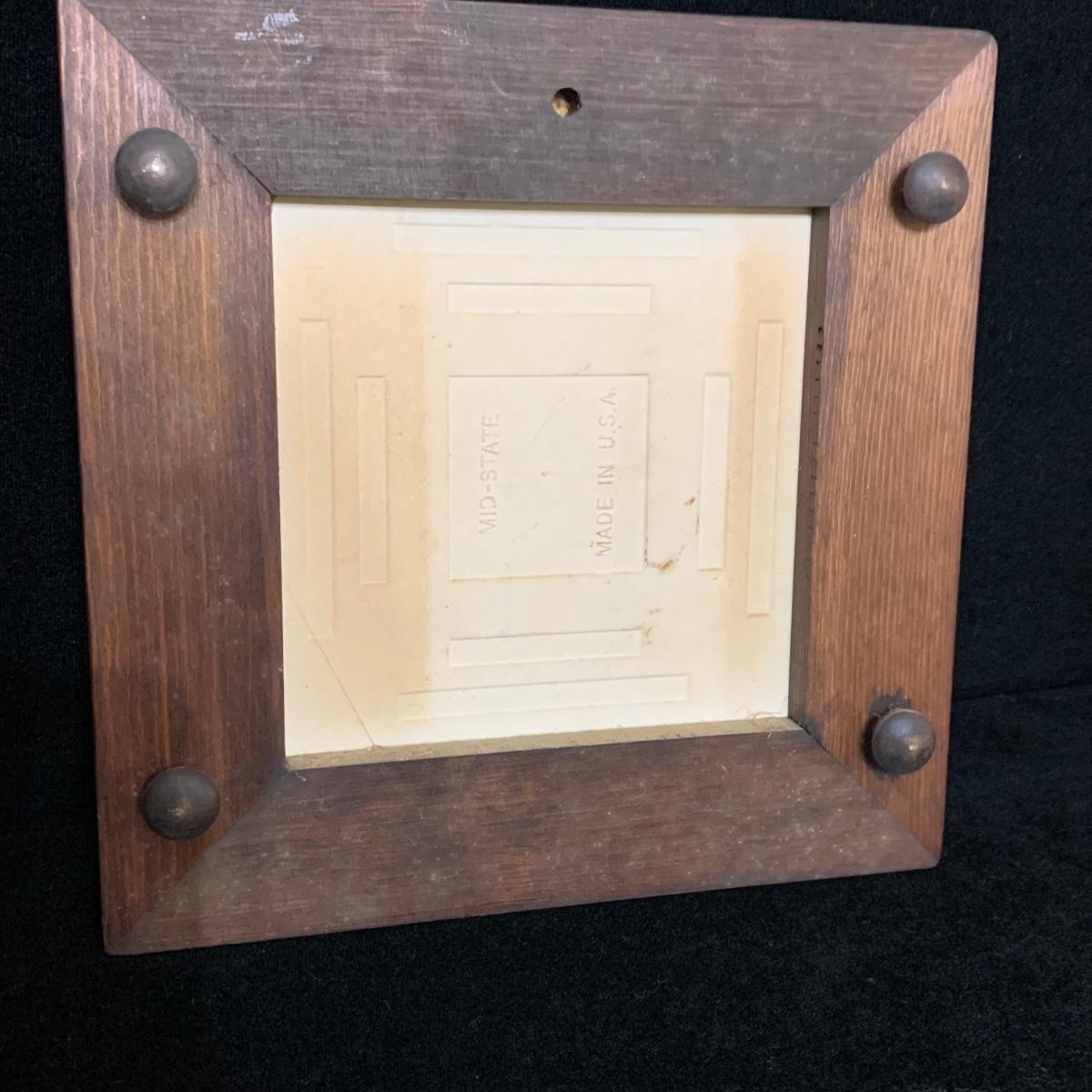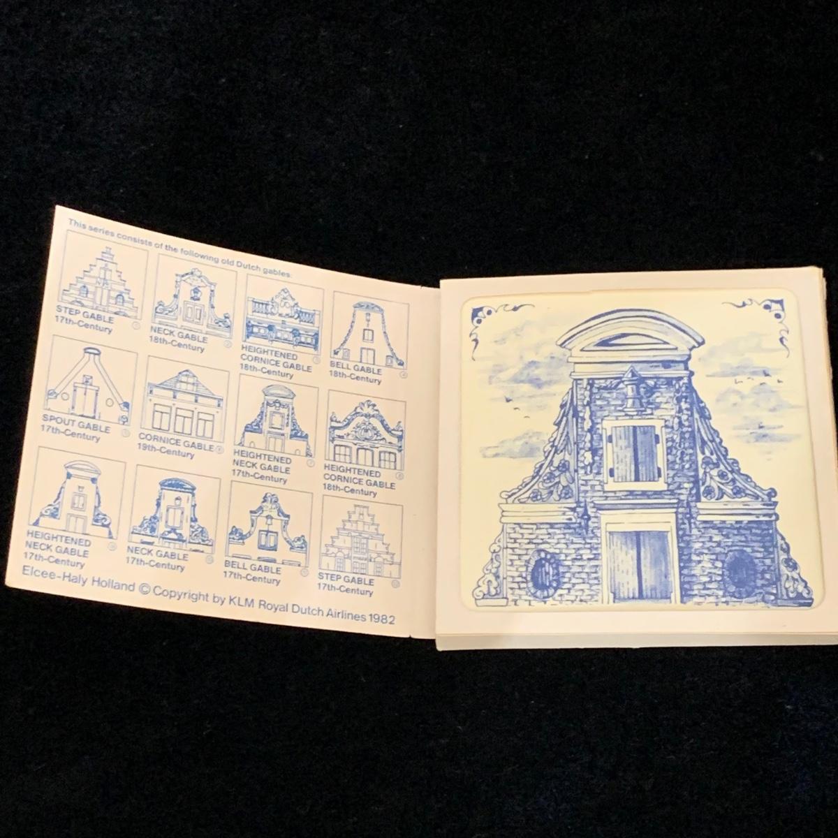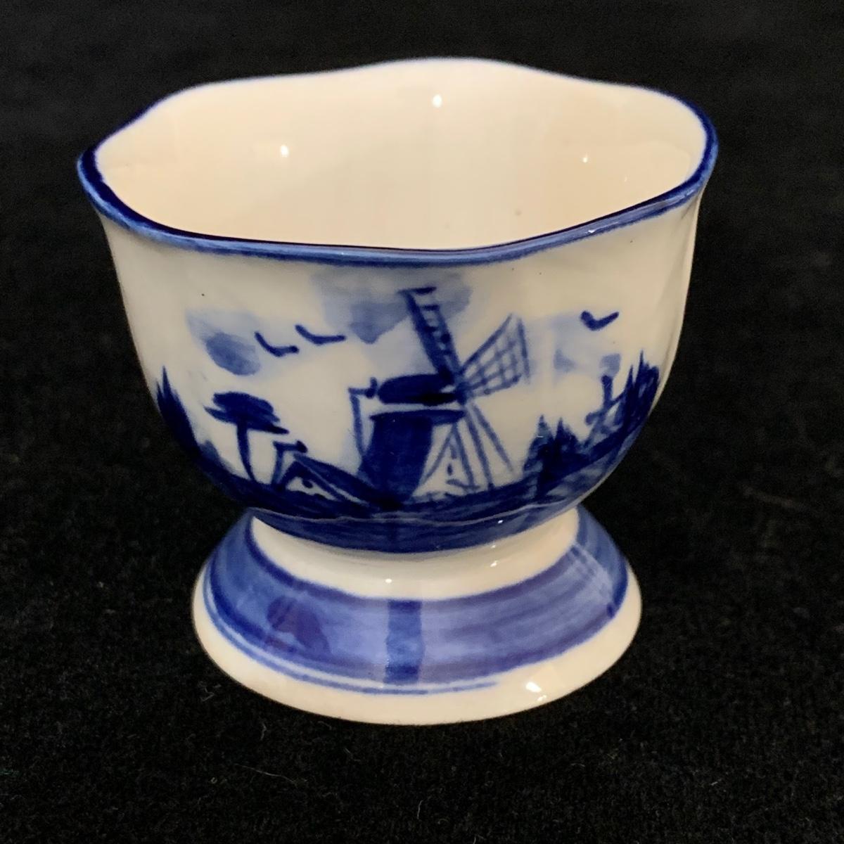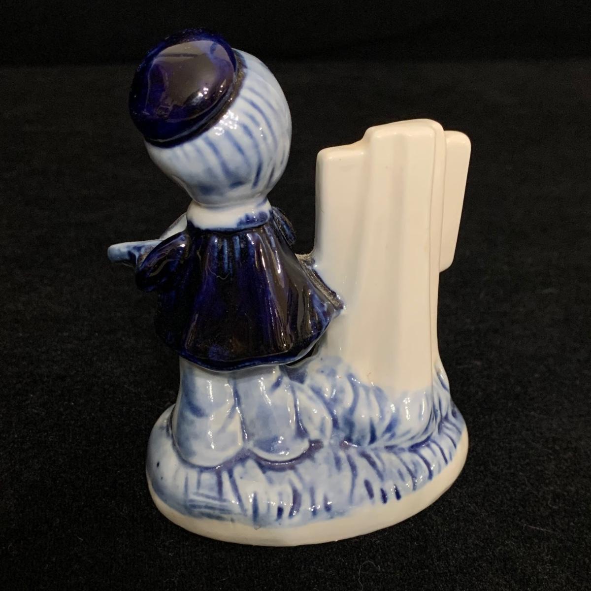 Five ceramic blue and white Dutch-made and/or themed items. Two wood-framed tile trivets featuring windmills, a figurine of a child painting windmills, a small porcelain Elesva Holland cup, and a small tile featuring a 17th century heightened neck Dutch gable. The trivets each measure 9”sq. All items are in good condition. The marking on the bottom of the child figurine is blurry and illegible.