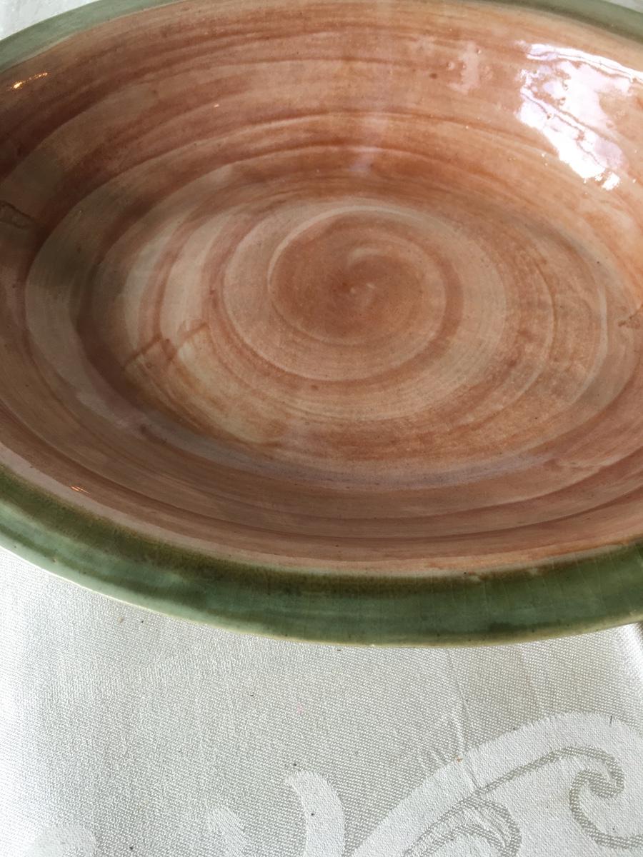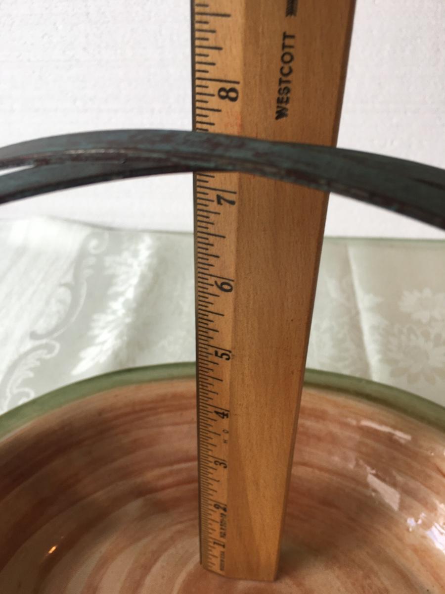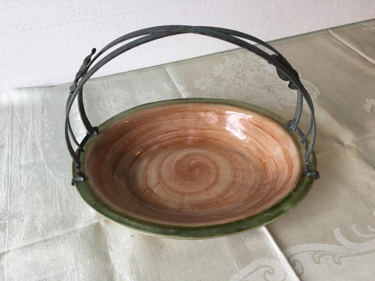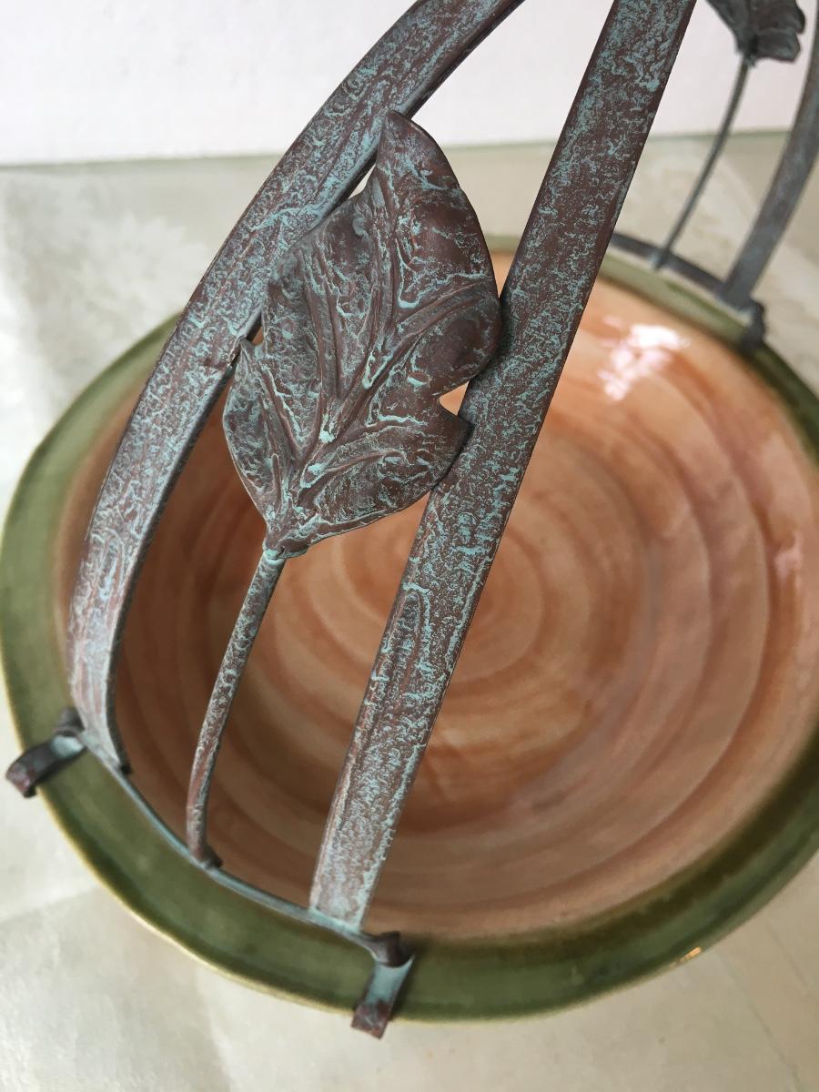 Ceramic glazed bowl with detachable metal handle. Mark on bottom.