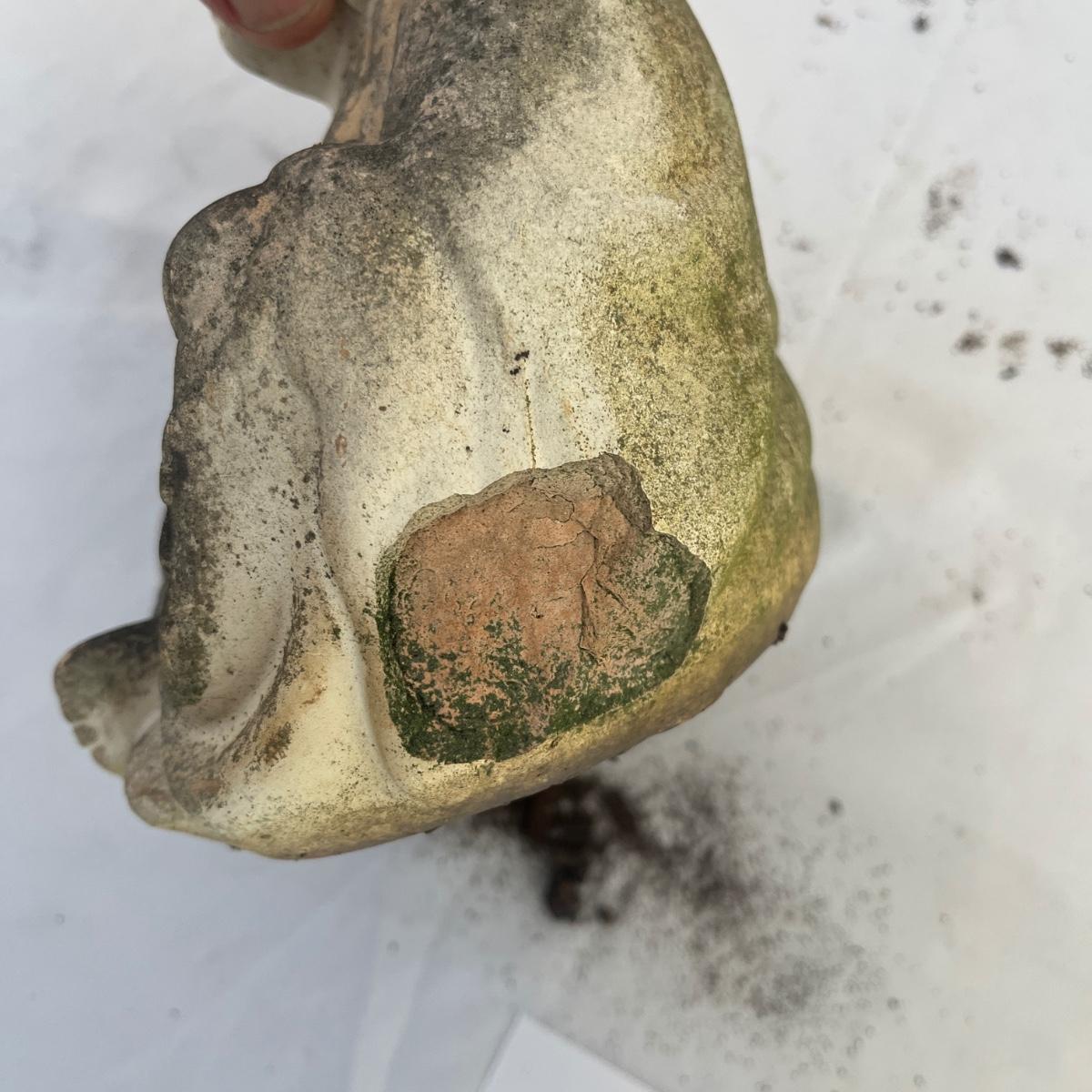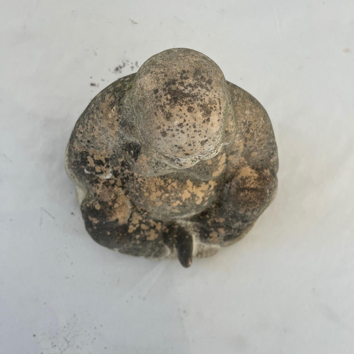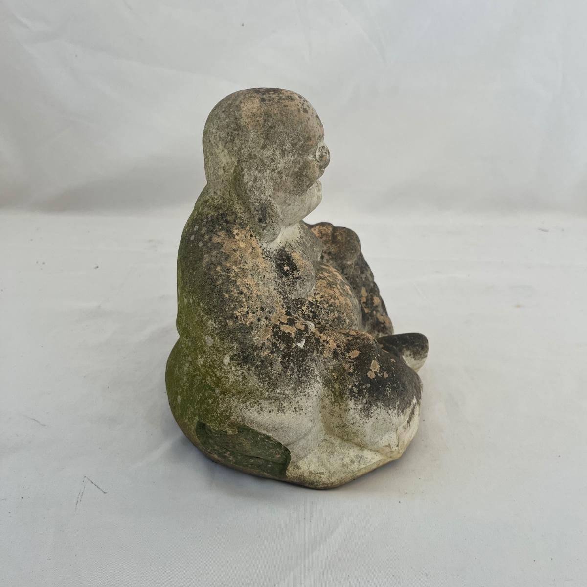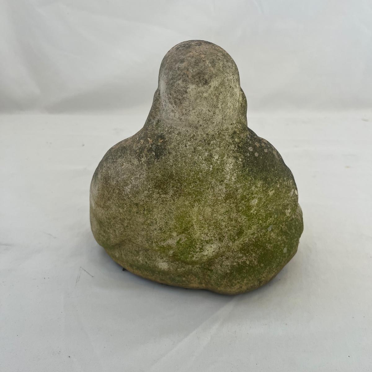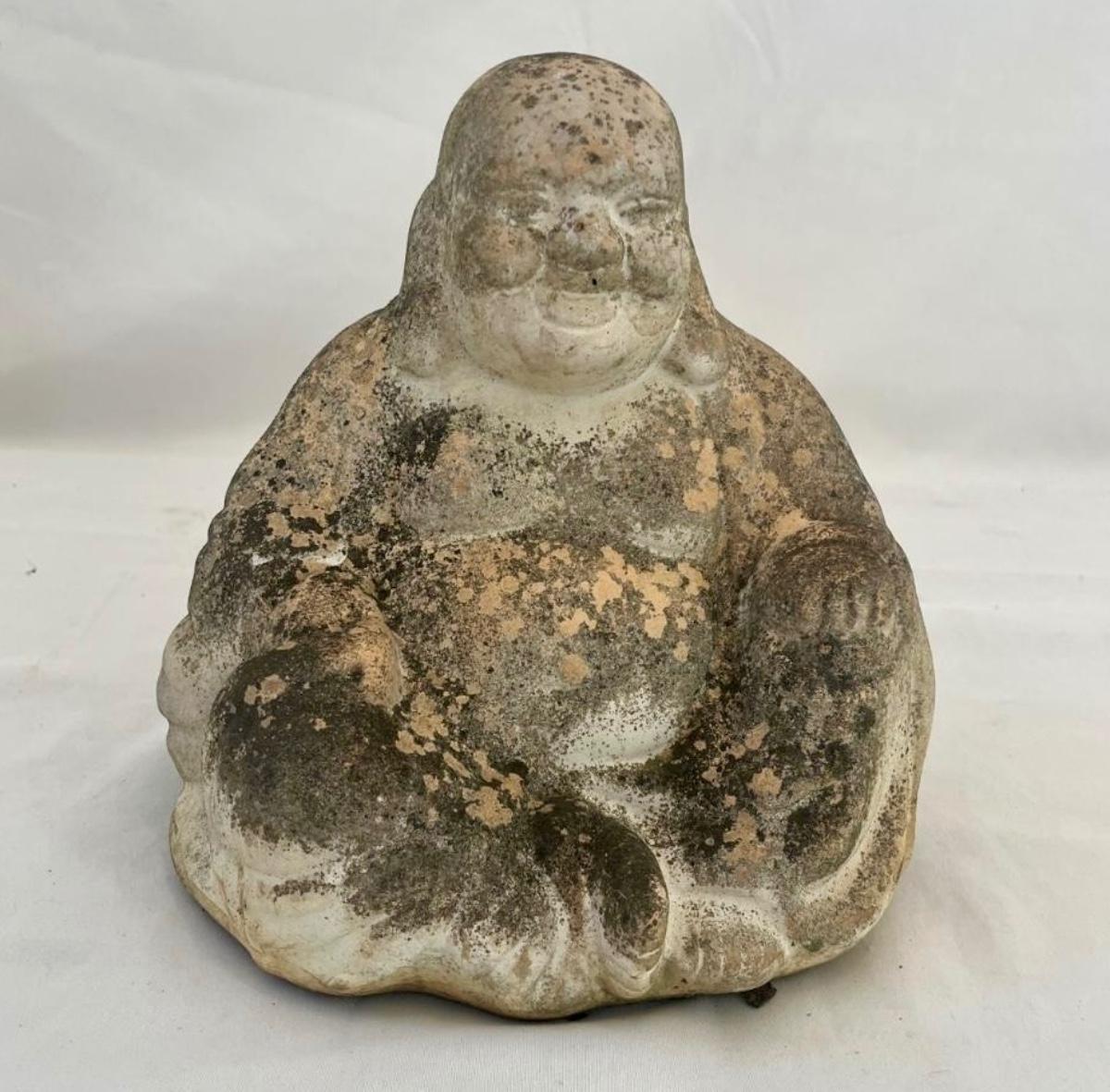 Lot includes a ceramic Buddha that measures 7.5” x 5” x 8”H. Piece has a chip on each side, see pictures. Statue has wear from living in the garden.