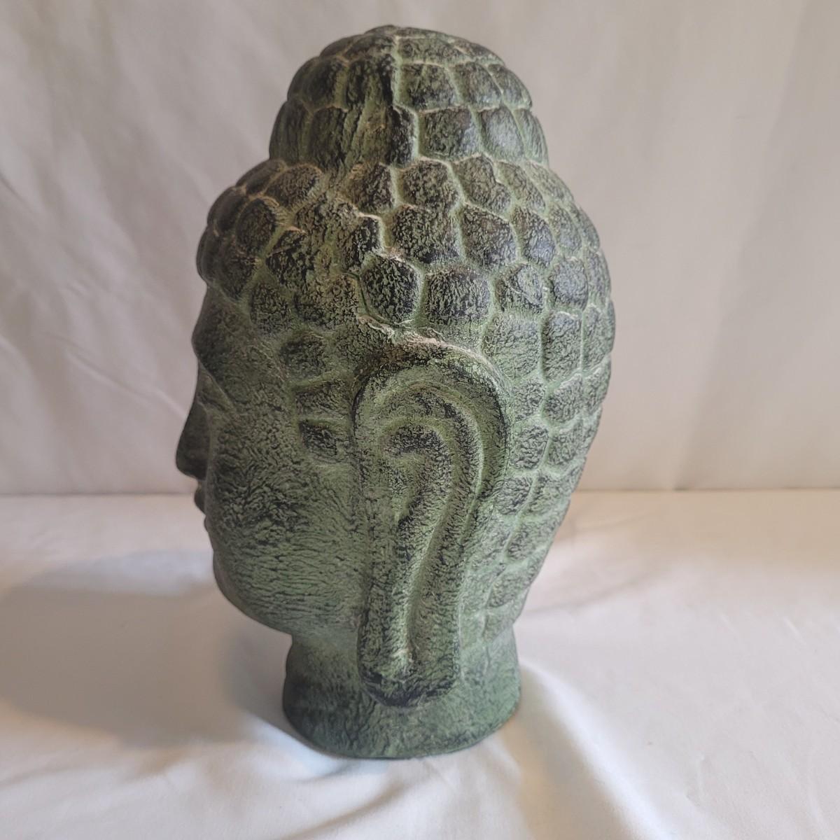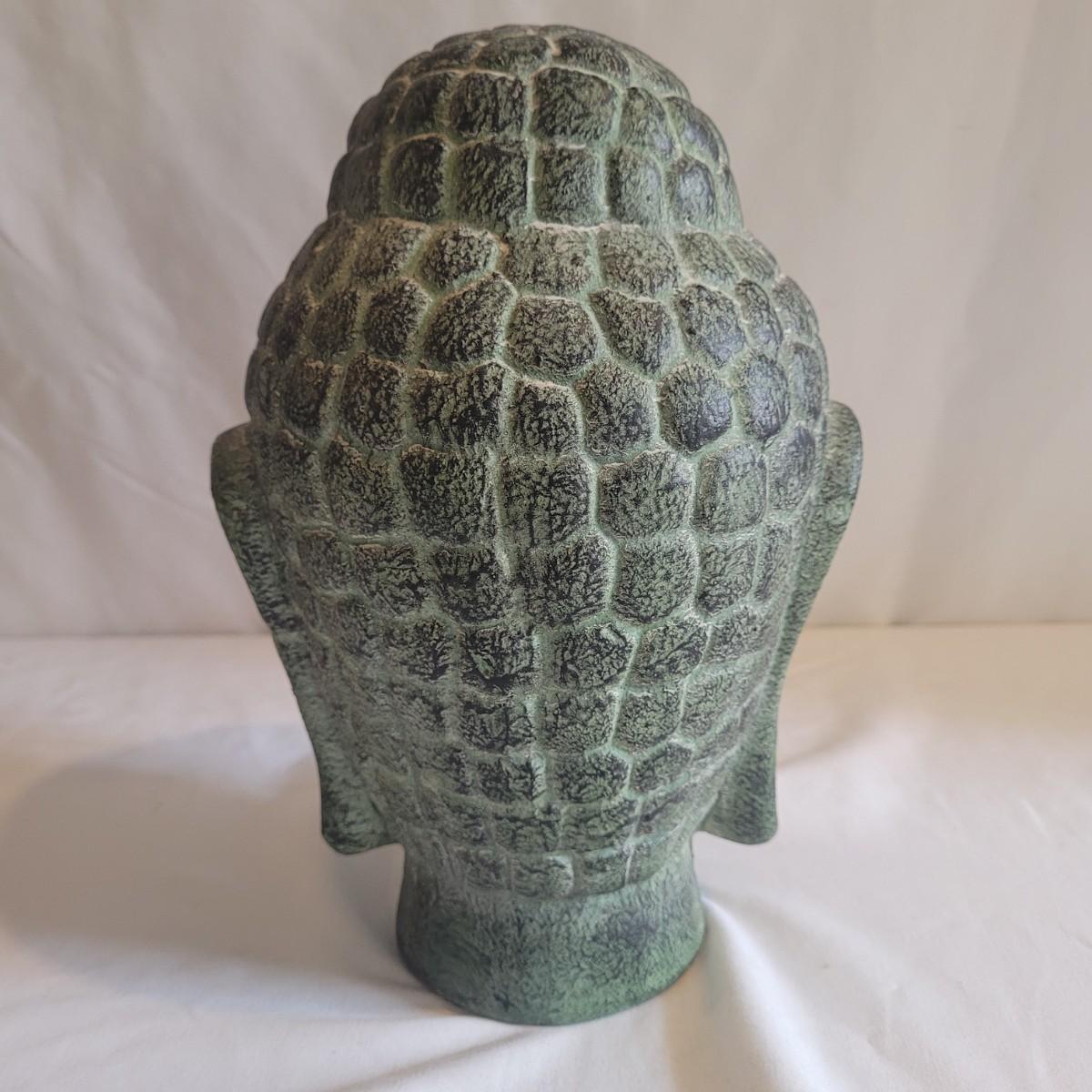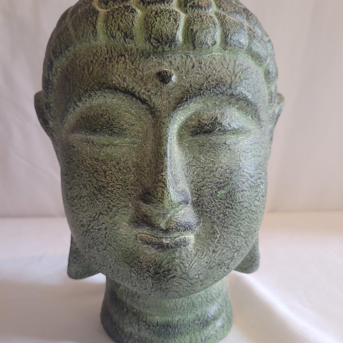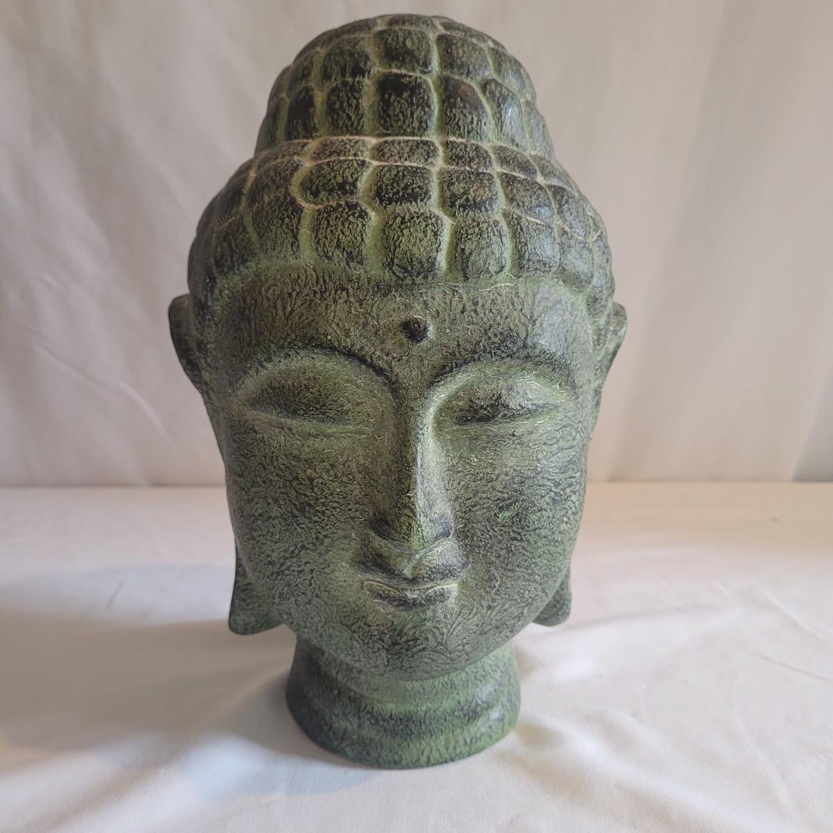 This auction is for a ceramic green Buddha head sculpture. It is a representation of Siddhartha Gautama, the founder of Buddhism.The bumps on the head represent the wisdom and enlightenment of the Buddha. Some believe they represent 108 snails that shielded Buddha from the sun while meditating. The long earlobes signify his past life as a prince, who wore heavy jewelry . The half closed eyes symbolize a state of meditation. The statue measures 7" x 6" x 10.5"H.