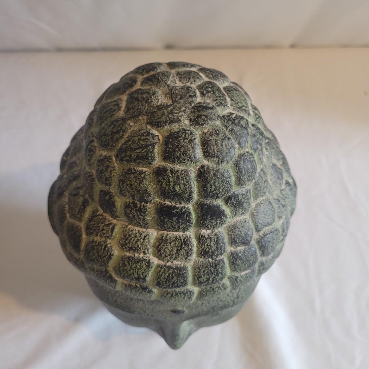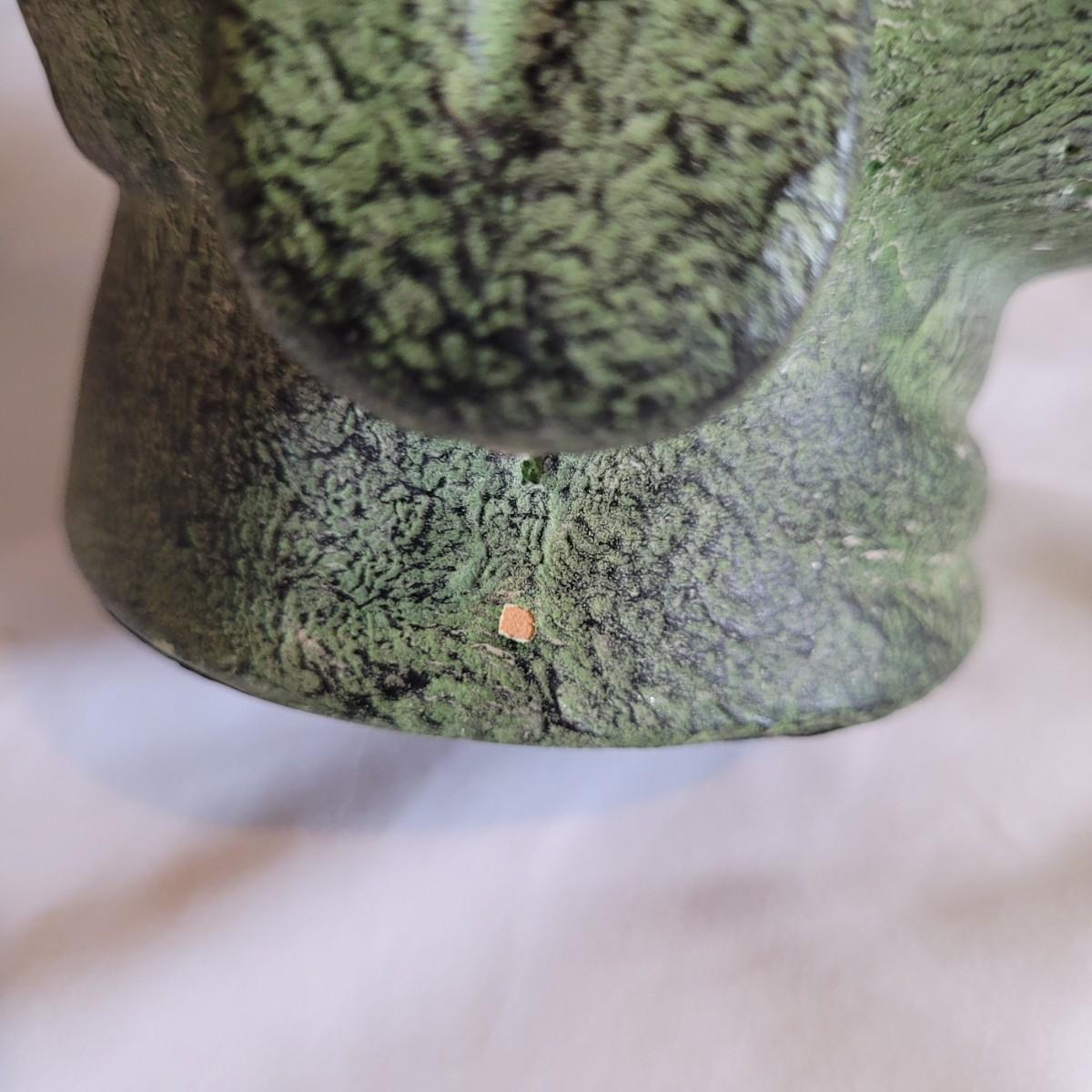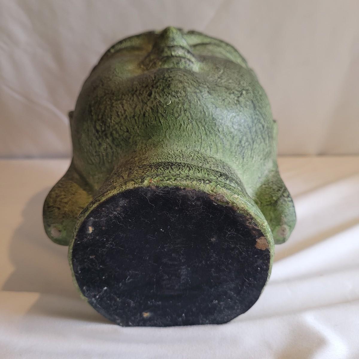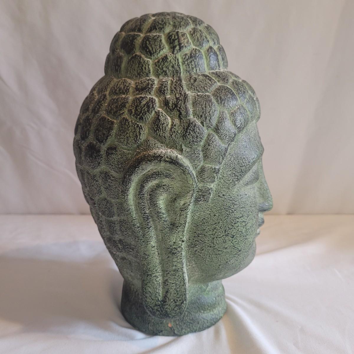 This auction is for a ceramic green Buddha head sculpture. It is a representation of Siddhartha Gautama, the founder of Buddhism.The bumps on the head represent the wisdom and enlightenment of the Buddha. Some believe they represent 108 snails that shielded Buddha from the sun while meditating. The long earlobes signify his past life as a prince, who wore heavy jewelry . The half closed eyes symbolize a state of meditation. The statue measures 7" x 6" x 10.5"H.