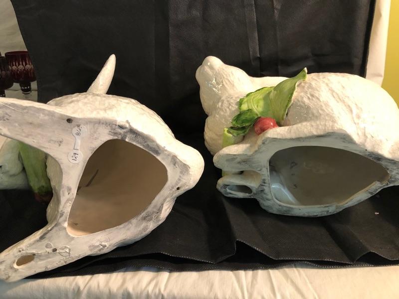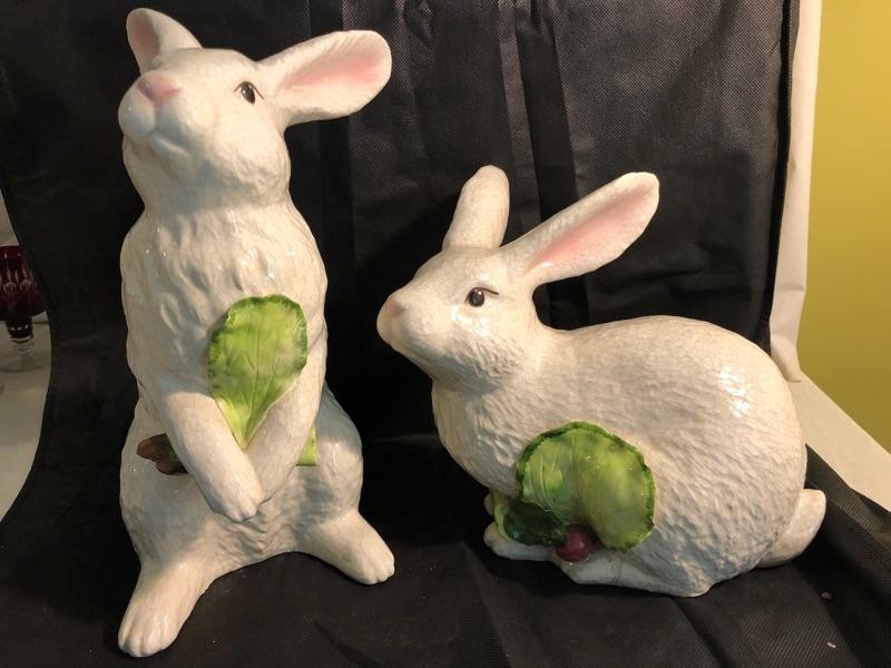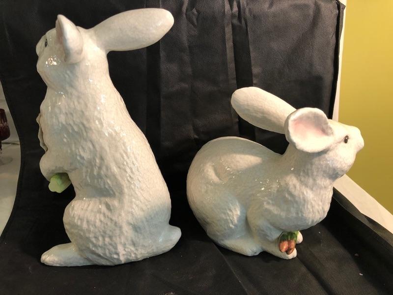 Pair of white ceramics bunnies to decorate for Easter of the spring season or your garden 14in tall for standing bunny and 10in tall for crouching bunny