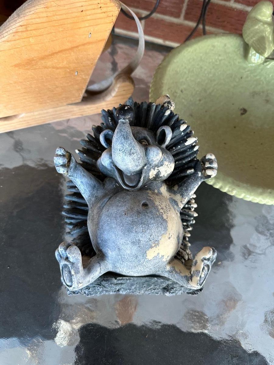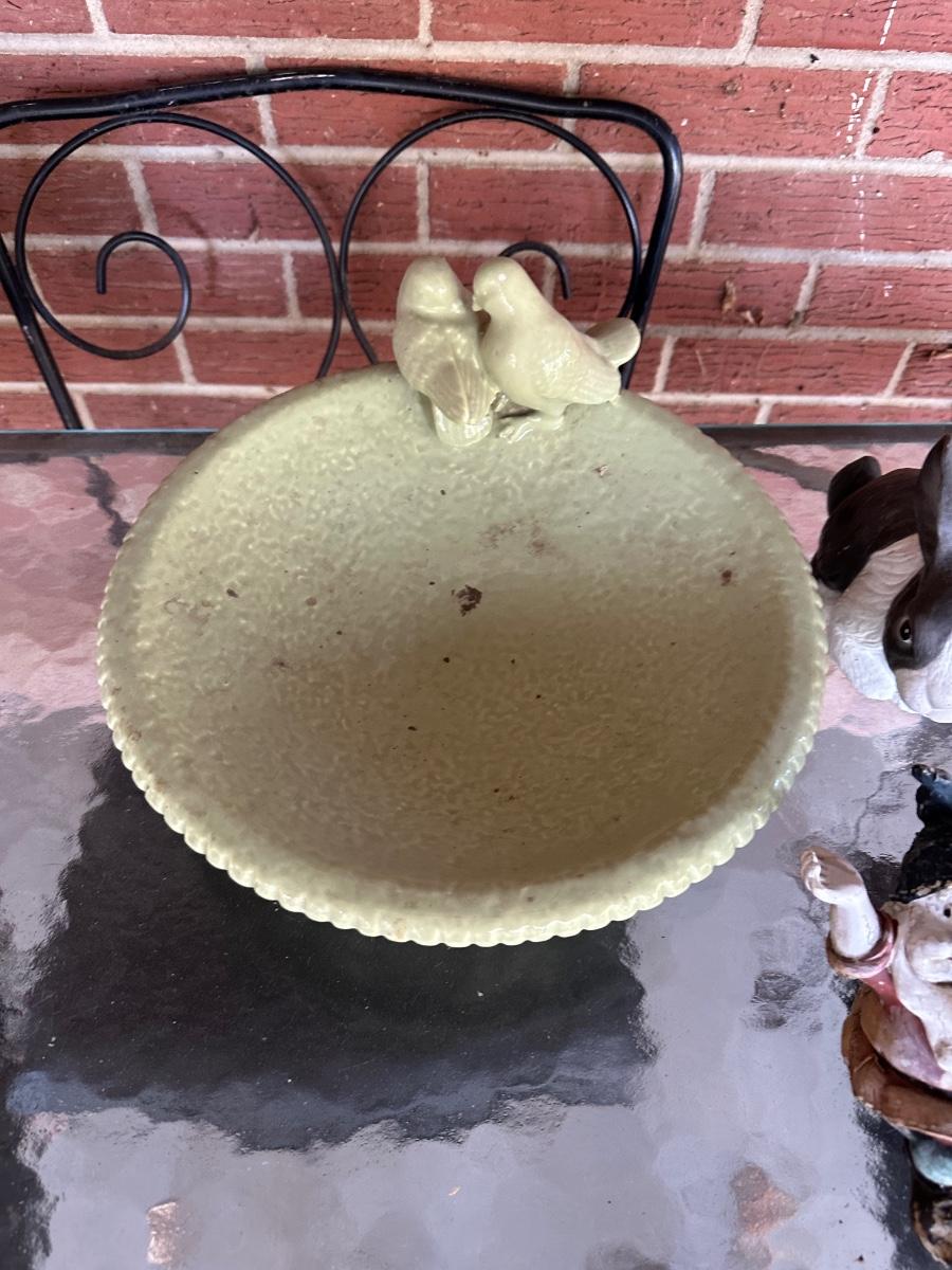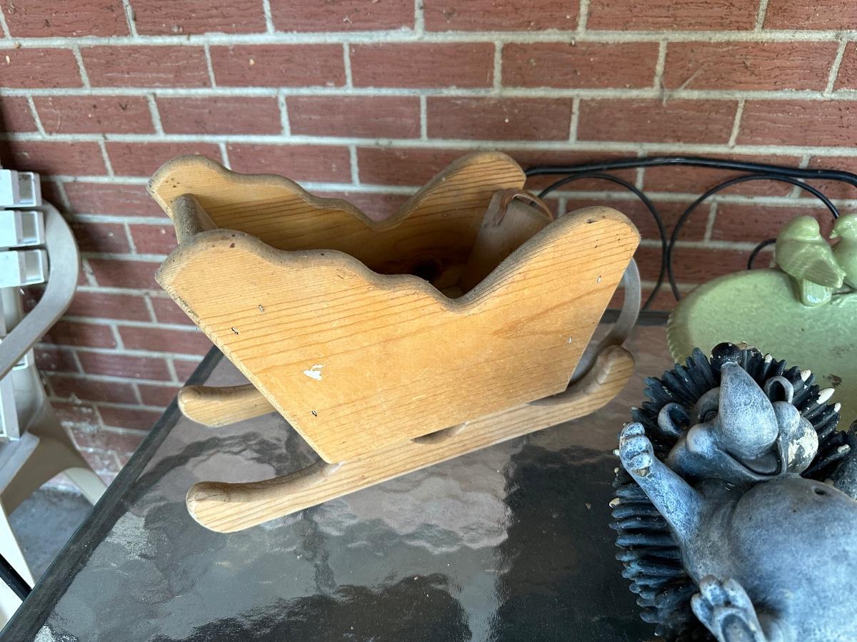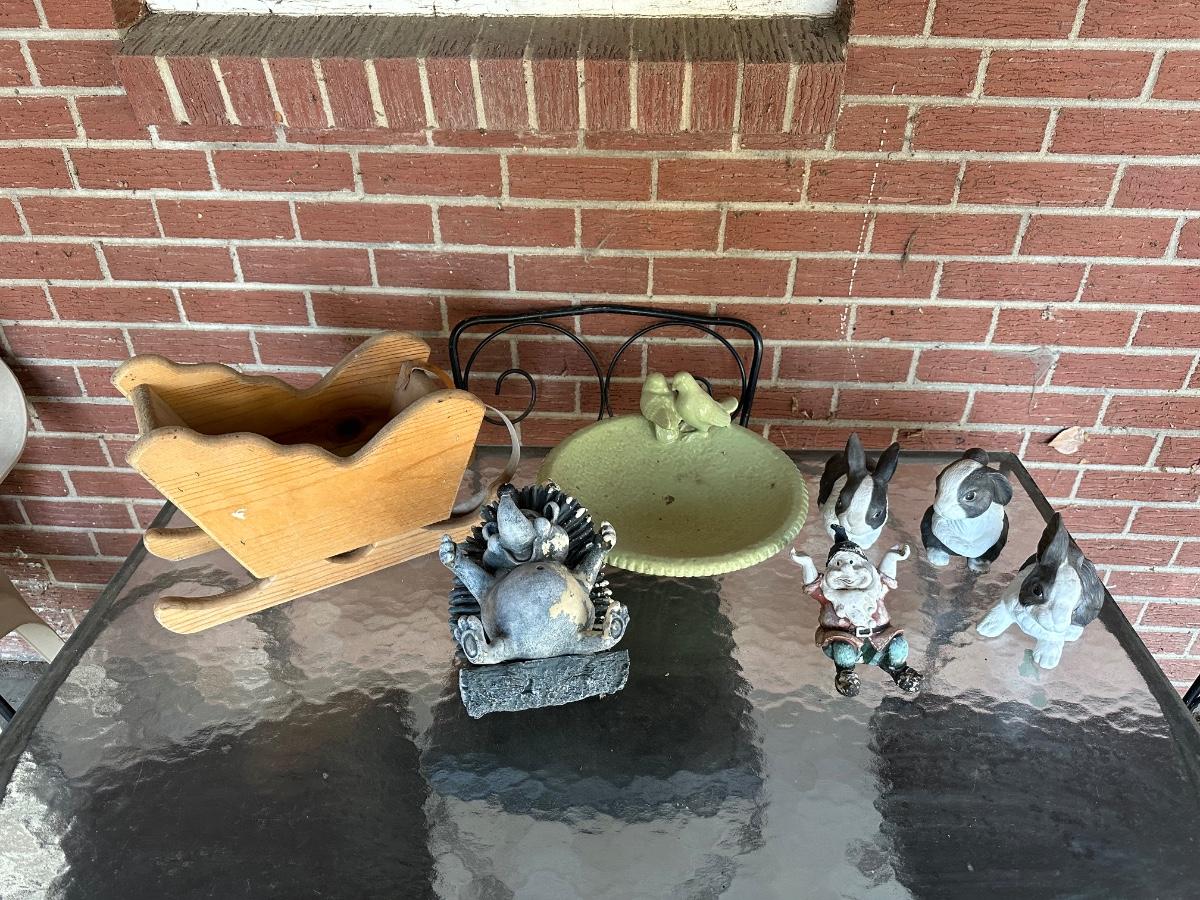 CERAMIC BUNNIES, GNOME, BIRDBATH, PORCUPINE AND WOOD SLEIGH FLOWER POT