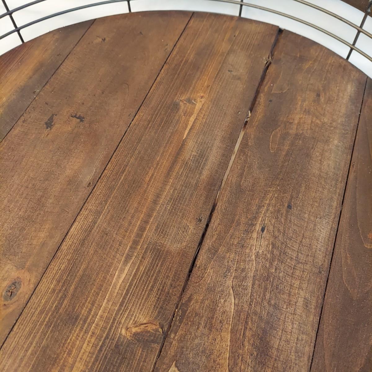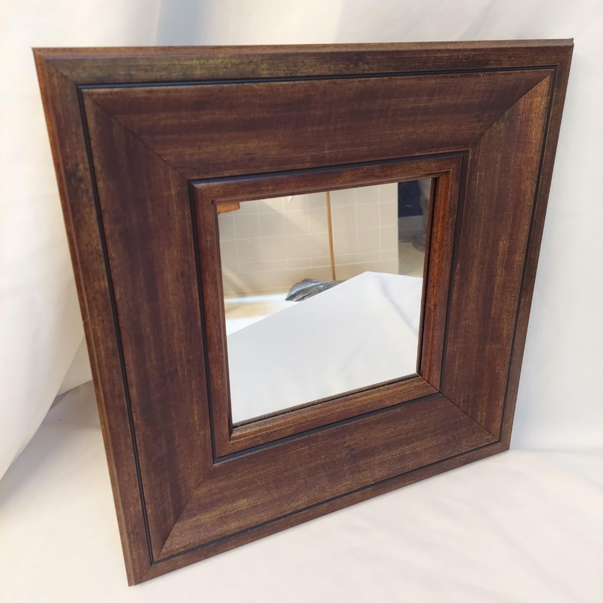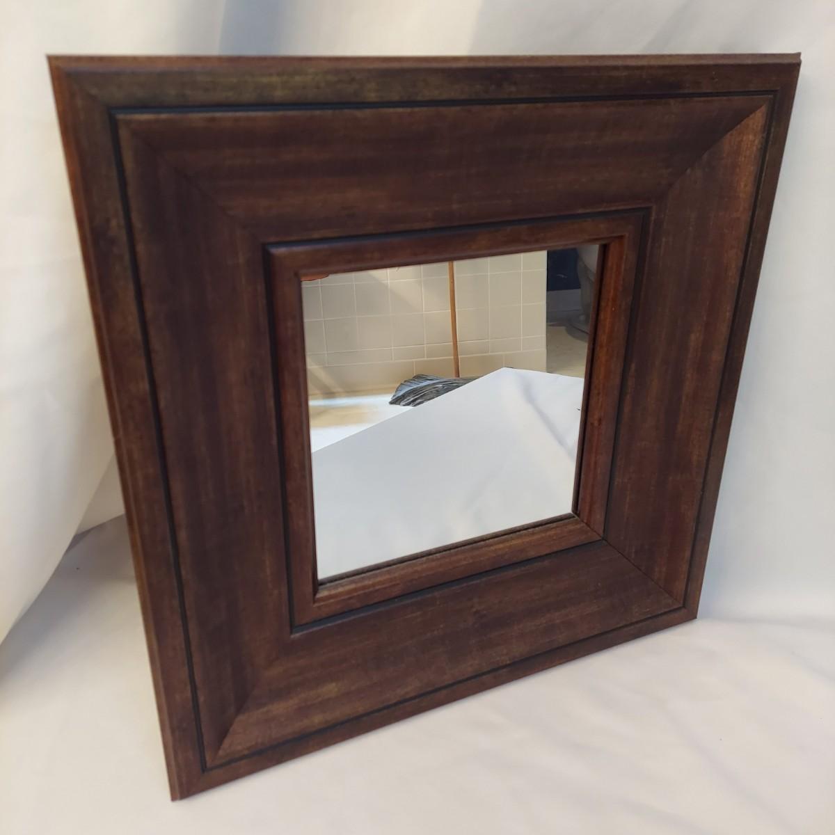 The square wood framed mirror is 15.5" x 15.5"H. The round wood and metal tray has a 17" diameter. There is a wide seam. Appears to be a manufacturing defect.The ceramic candle holder is 14" tall with a 4" tall candle that was briefly lit. Shipping available
