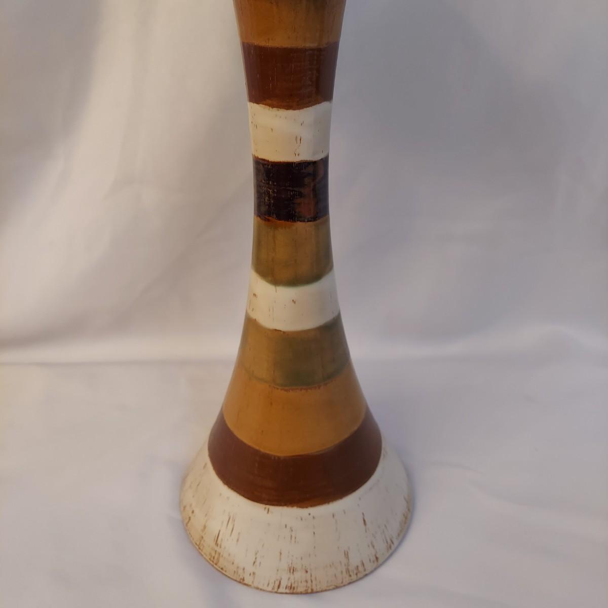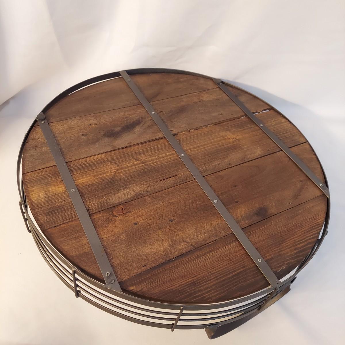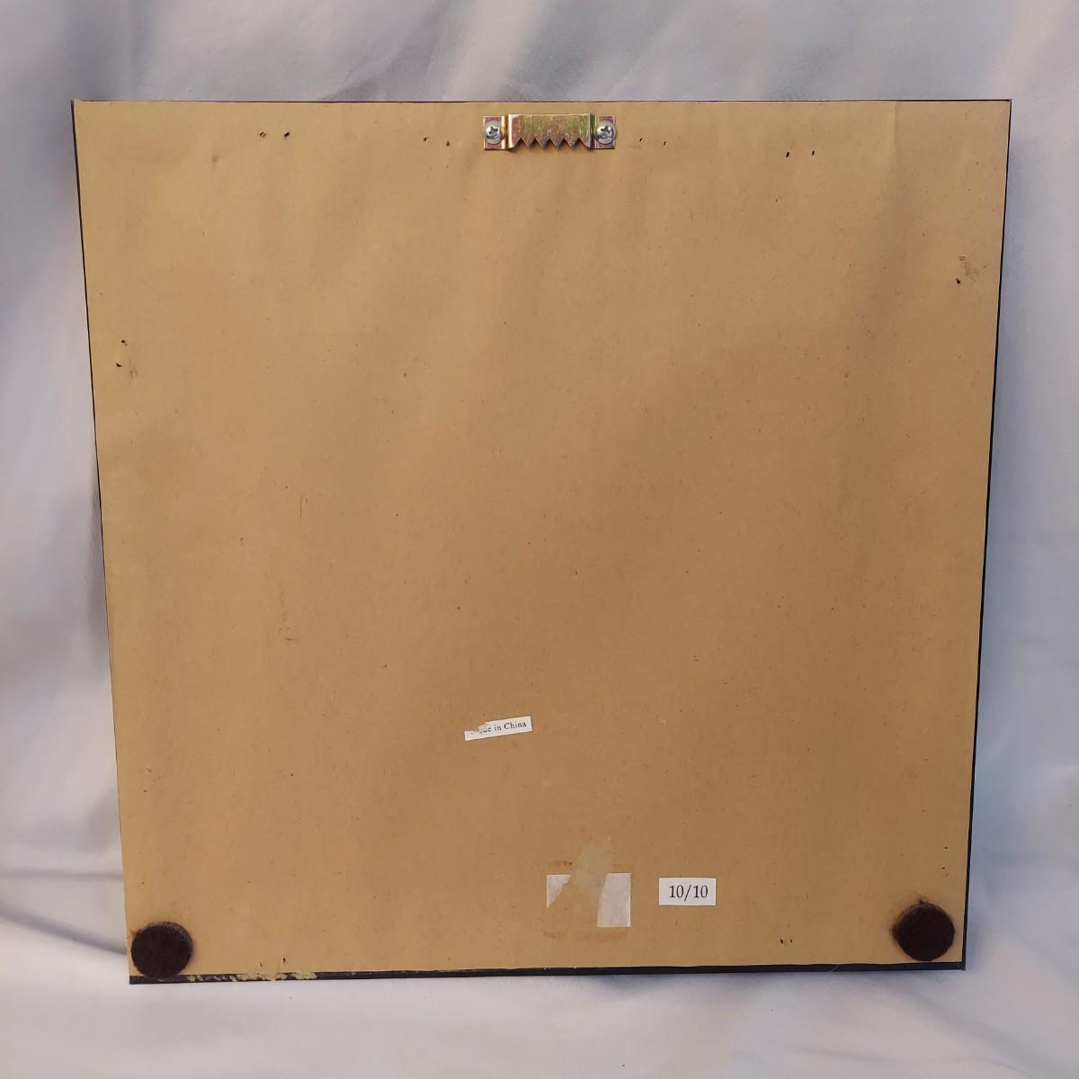 The square wood framed mirror is 15.5" x 15.5"H. The round wood and metal tray has a 17" diameter. There is a wide seam. Appears to be a manufacturing defect.The ceramic candle holder is 14" tall with a 4" tall candle that was briefly lit. Shipping available